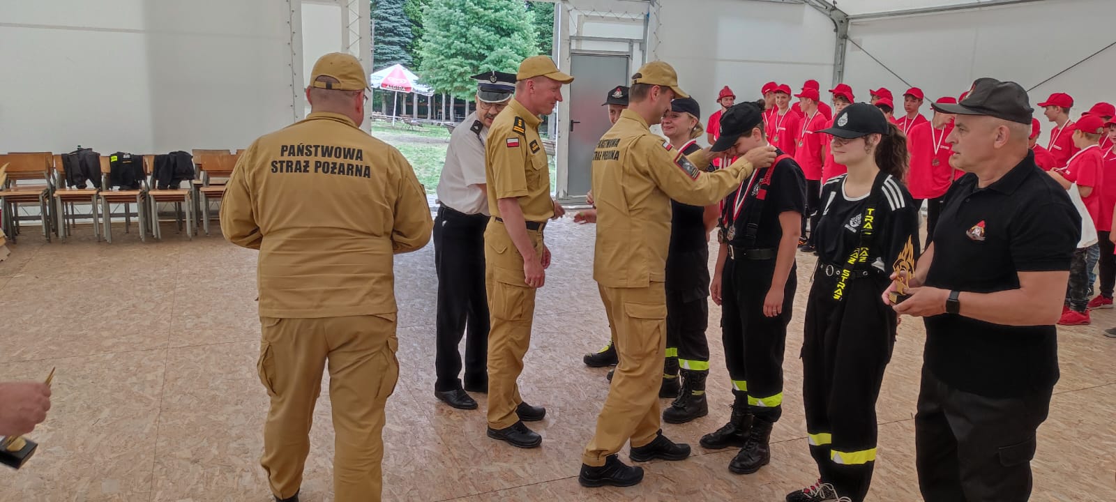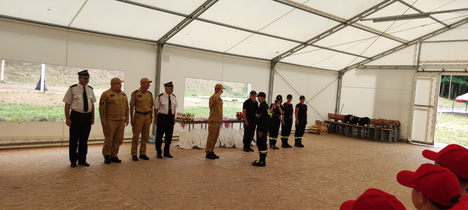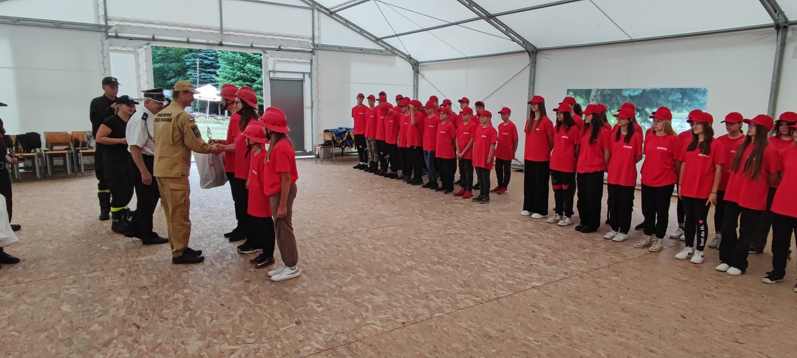 Obecni na uroczystej zbiórce zakończenia obozu Zastępca Podlaskiego Komendanta Wojewódzkiego PSP st. bryg. Paweł Piotr Ostrowski, Komendant Powiatowy PSP w Sejnach st. bryg. Artur Przeborowski, Komendant Powiatowy PSP w Ełku st. bryg. Marek Markowski, Prezes OSP Sejny dh Zdzisław Czakis, Prezes OSP Barszczewo dh Krzysztof Konicki podziękowali uczestnikom za zaangażowanie i pogratulowali zapału w zdobywaniu nowych umiejętności z dziedziny pożarnictwa. Tegoroczna edycja trwała od 17 do 29 lipca 2023 r. i była organizowana przy udziale OSP Barszczewo oraz OSP Sejny dla młodzieży z powiatów: białostockiego i sejneńskiego. W ośrodku wypoczynkowym w Ełku przebywało łącznie ponad 70 osób.