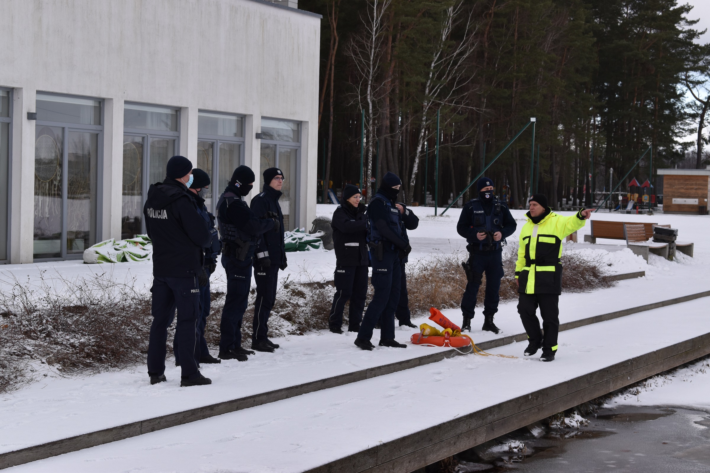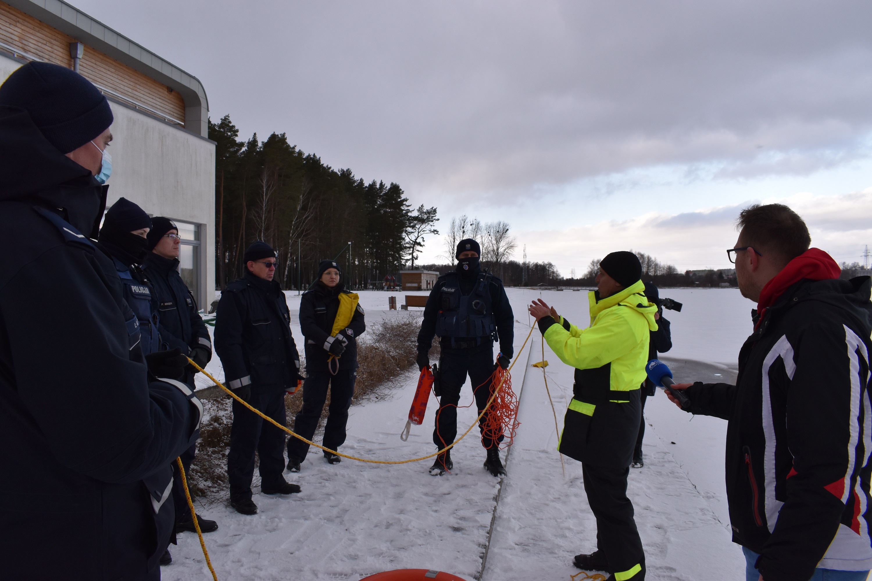 W trakcie szkolenia omówiono zagrożenia z jakimi można się spotkać podczas tego typu zdarzeń. Policjanci zapoznali się także z zasadami użycia podstawowego sprzętu takiego jak rzutka ratownicza czy koło ratunkowe. Poznali również alternatywne rozwiązania, które pozwalają nieść skuteczną pomoc, z wykorzystaniem dostępnych na miejscu zdarzenia rzeczy np. linki holowniczej, kurtki, szalika, sanek bądź gałęzi. Szkolenie cieszyło się zainteresowaniem lokalnych mediów, które zrelacjonowały jego przebieg.