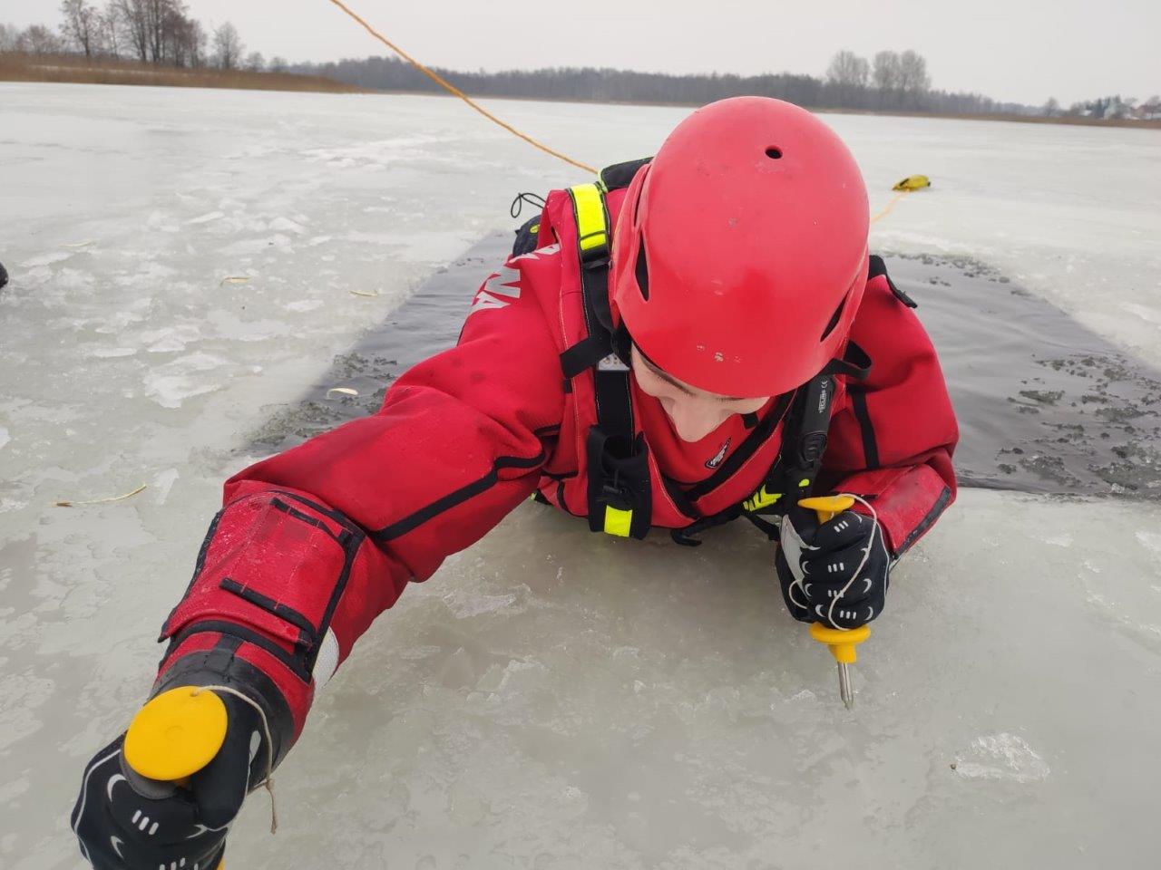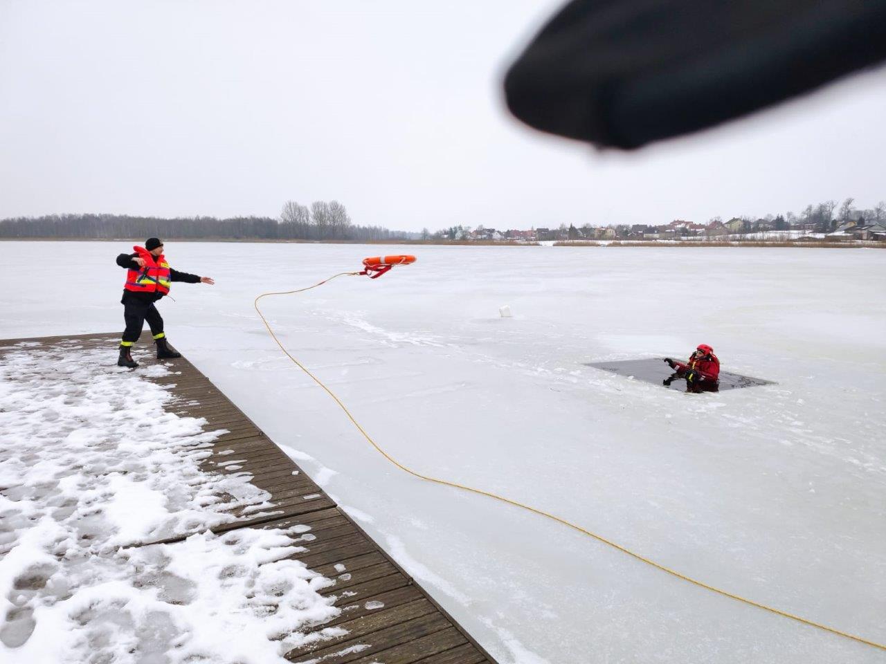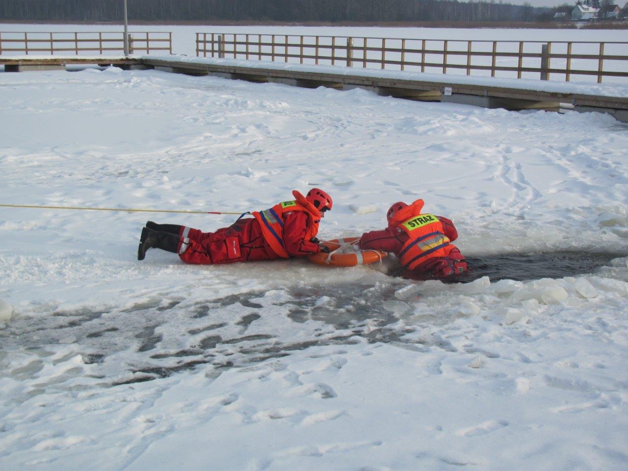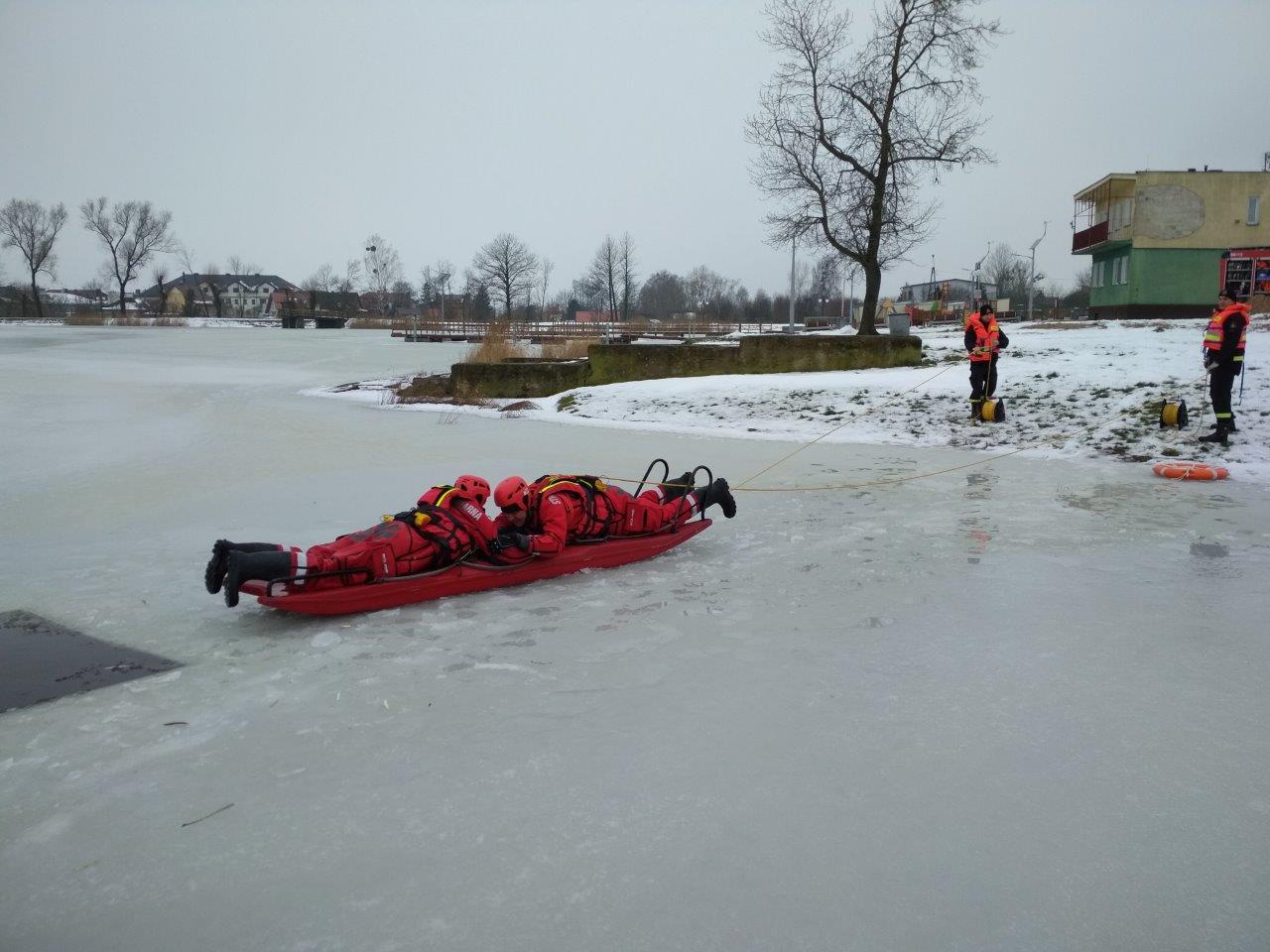 Doskonalenie umiejętności prowadzenia działań ratowniczych na obszarach zalodzonych oraz technik ratowania osób pod którymi załamał się lód przeprowadzono na zbiornikach wodnych w Sokółce i Dąbrowie Białostockiej.
