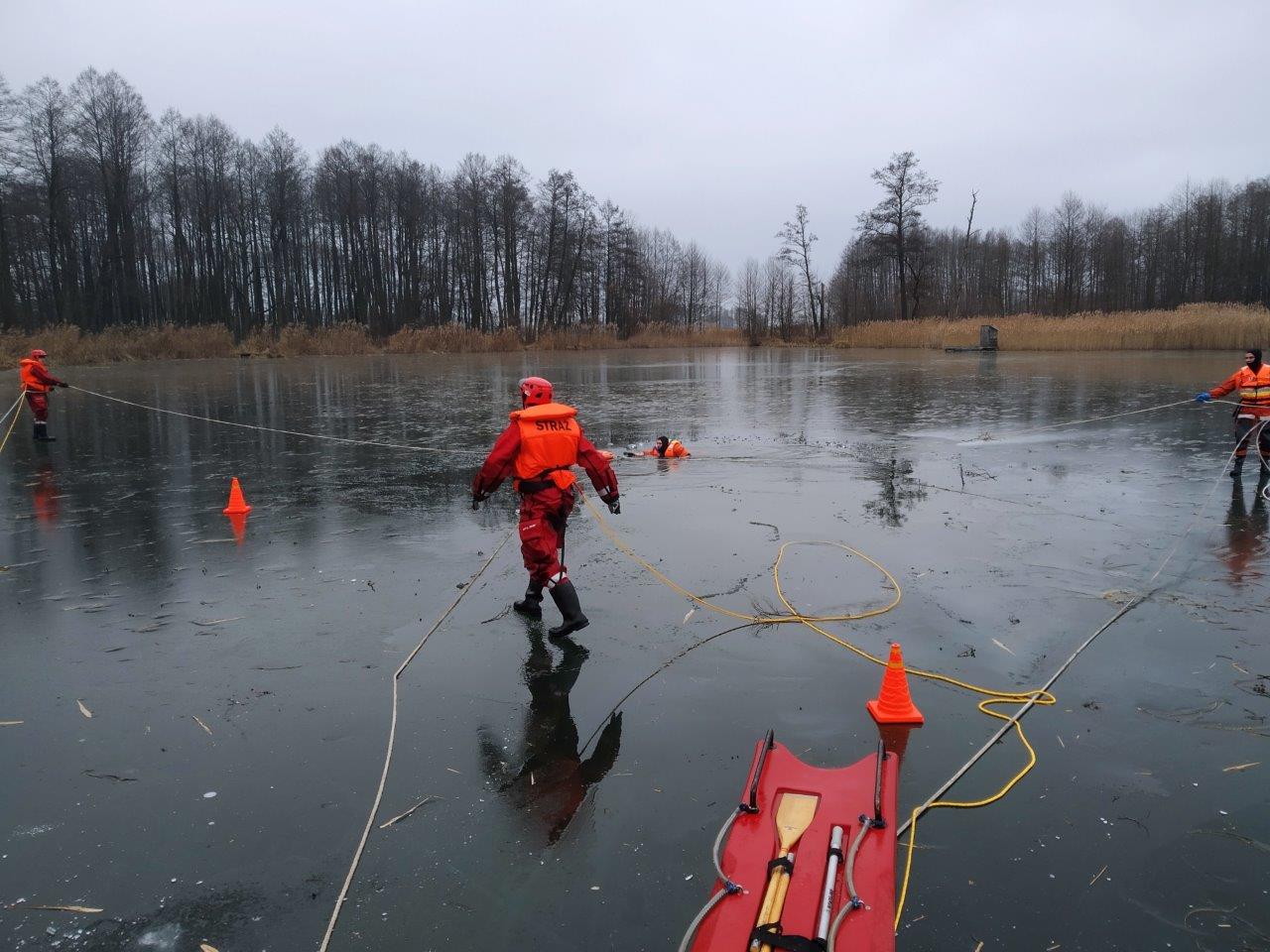 W trakcie zajęć prowadzonych przez dowództwo oraz instruktorów z zakresu ratownictwa lodowego JRG Sokółka praktycznie ćwiczono techniki i warianty ratowania osób, pod którymi załamał się lód.