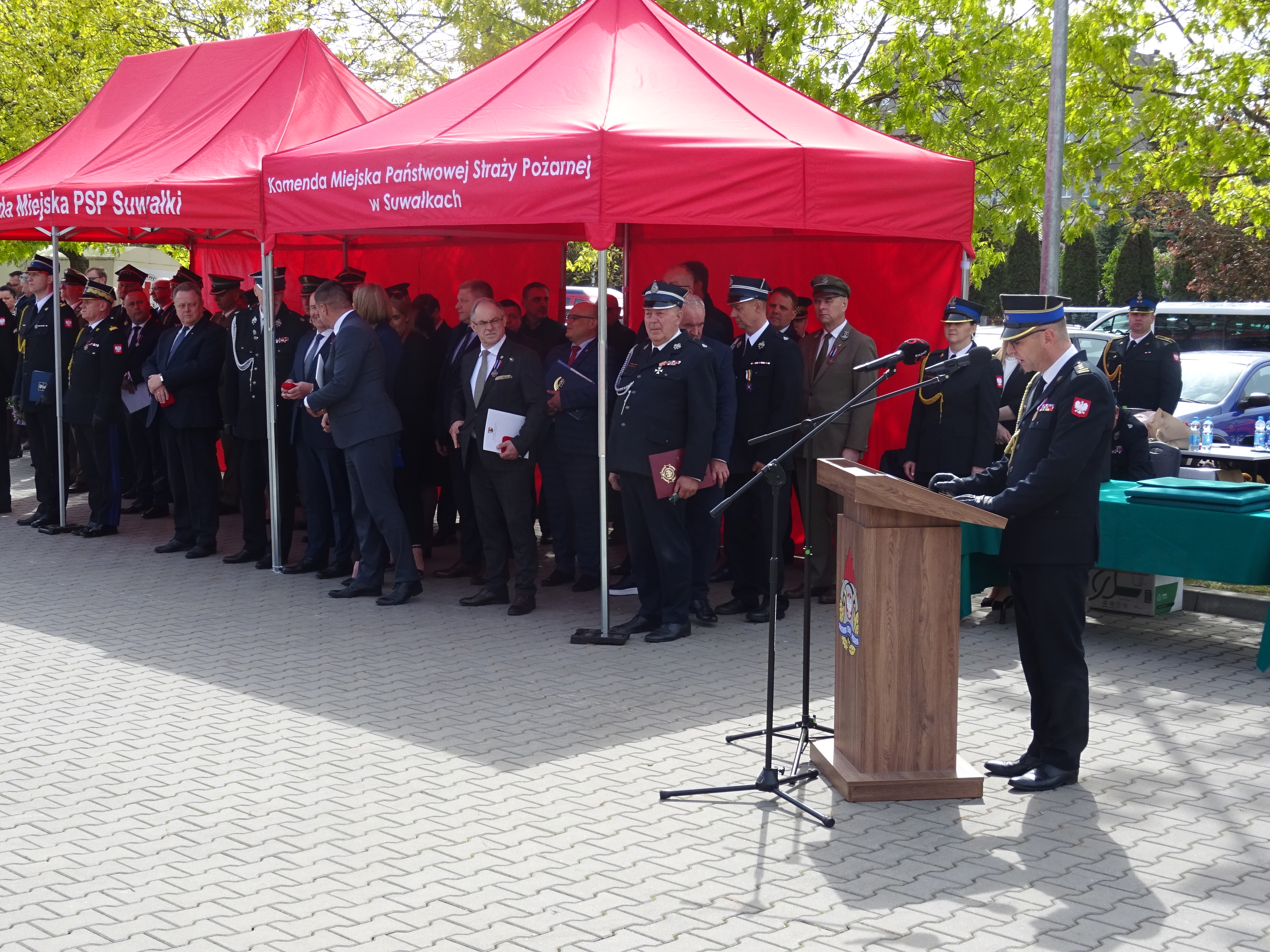 Główna część uroczystości rozpoczęła się meldunkiem złożonym st. bryg. Januszowi Kondratowi podlaskiemu komendantowi wojewódzkiemu PSP przez dowódcę uroczystości mł. kpt. Mariusza Daniłowicza. Następnie został odegrany Hymn Rzeczypospolitej Polski oraz Związku Ochotniczych Straży Pożarnych Rzeczypospolitej Polskiej. Zaproszonych gości, rodziny strażaków oraz przyjaciół pożarnictwa powitał mł. bryg. Jerzy Netter komendant miejski Państwowej Straży Pożarnej w Suwałkach, który w swym wystąpieniu złożył podziękowania na ręce zaproszonych gości za bardzo dobrą współpracę, zaangażowanie i udzielanie wsparcia na rzecz ochrony przeciwpożarowej powiatu suwalskiego.