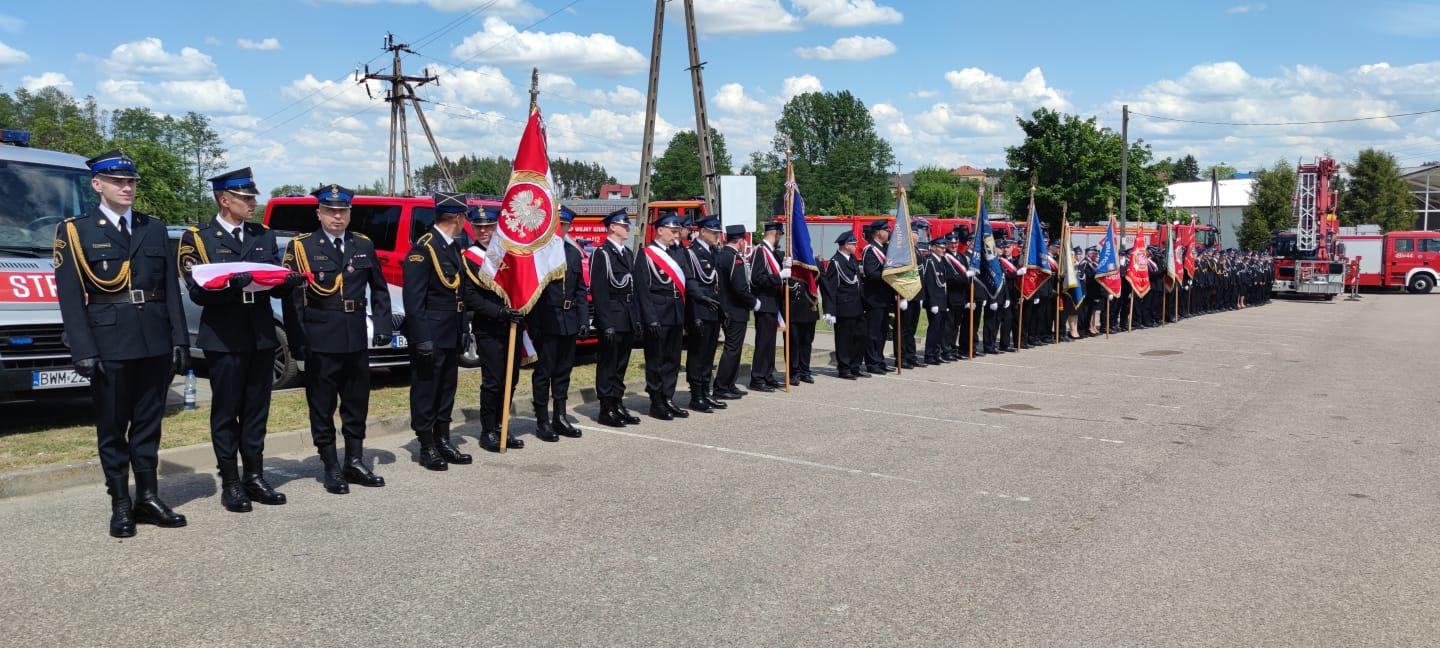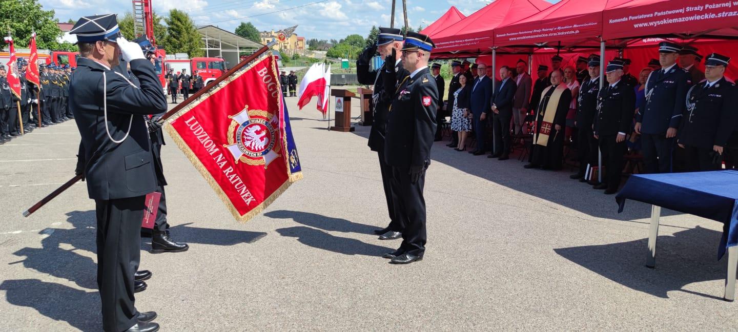 Następnie odbyło się uroczyste podniesienie flagi państwowej na maszt i odśpiewanie hymnu państwowego. Komendant Powiatowy PSP w Wysokiem Mazowieckiem mł. bryg. Wojciech Sokołowski po powitaniu zaproszonych gości w okolicznościowym przemówieniu podziękował wszystkim strażakom i pracownikom cywilnym za codzienną służbę i pracę oraz za zaangażowanie i wzorowe wykonywanie zadań służbowych. Wśród zaproszonych gości obecni byli: Jacek Bogucki – Poseł na Sejm Rzeczypospolitej Polskiej, Anna Bogucka – Senator RP, dh Marek Komorowski – Senator RP, a zarazem Wiceprezes Zarządu Oddziału Wojewódzkiego ZOSP RP w Białymstoku, Tomasz Frankowski – Europoseł, Łukasz Siekierko – Radny Sejmiku Województwa Podlaskiego, insp. Tomasz Wyszkowski – Komendant Powiatowy Policji w Wysokiem Mazowieckiem, Wlademar Kikolski – Wicestarosta Wysokomazowiecki, Burmistrzowie oraz Wójtowie z terenu powiatu wysokomazowieckiego, Prezesi Zarządów Gminnych oraz Oddziałów Miejsko-Gminnych ZOSP RP z terenu powiatu wysokomazowieckiego, poczty sztandarowe reprezentujące poszczególne gminy z terenu powiatu wysokomazowieckiego, st. bryg. w st. spocz. Adam Frankowski- emerytowany Zastępca Podlaskiego Komendanta Wojewódzkiego PSP, Adam Stanisławski – Leśniczy Leśnictwa Rudka, ks. Krzysztof Konopka oraz Kapelan PSP Województwa Podlaskiego bryg. Wojciech Ejsmont.