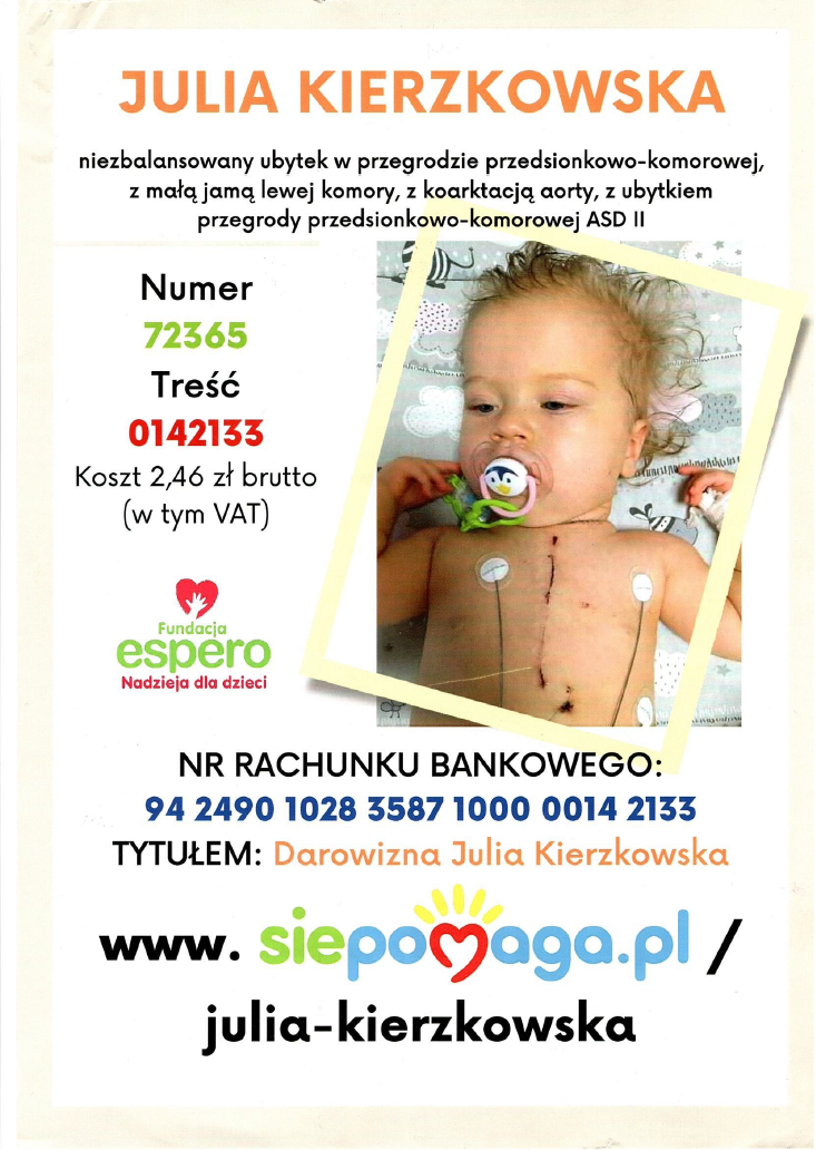 w skorygowaniu wady serca Julii. Niestety koszt odtworzenia dwukomorowego serduszka Julii oraz rehabilitacja wymaga bardzo dużych nakładów finansowych. Dlatego trwa zbiórka pieniędzy na operację w Bostonie i transport medyczny dziewczynki.