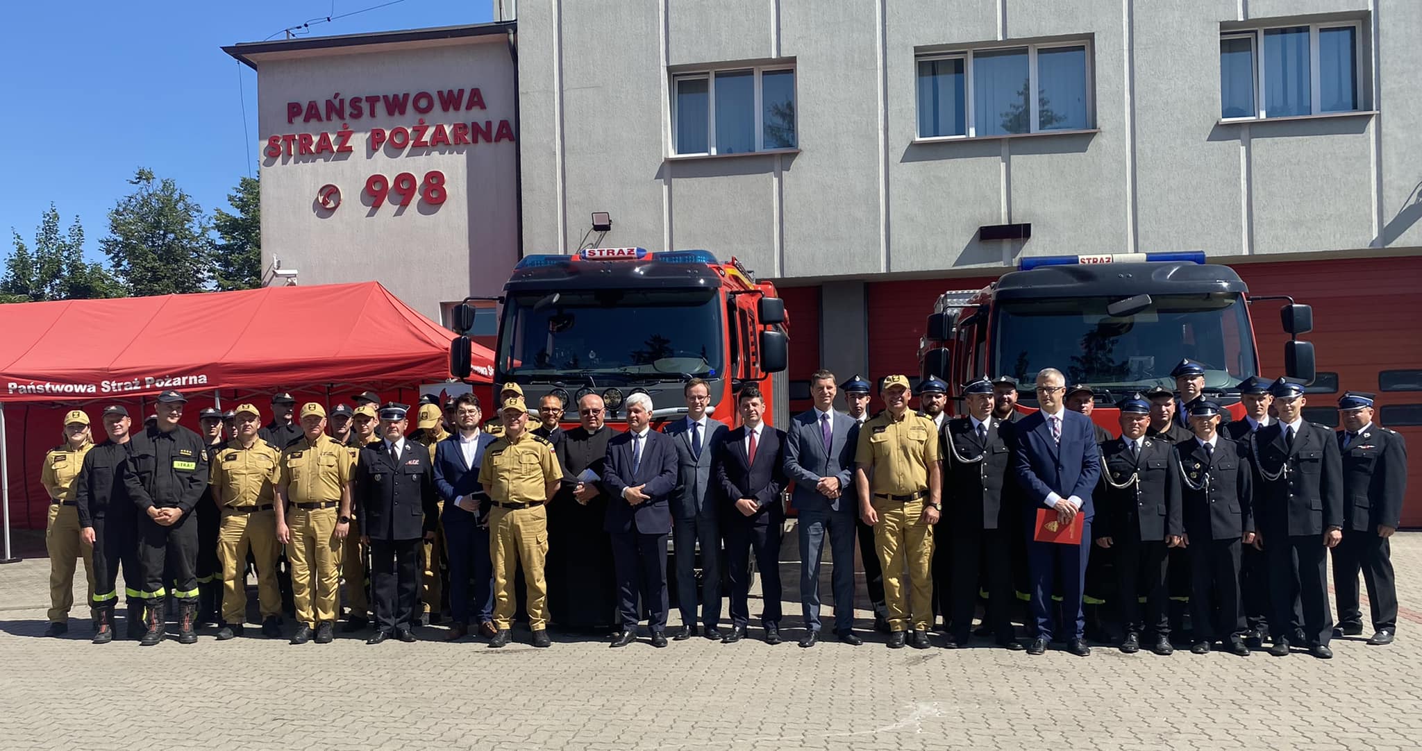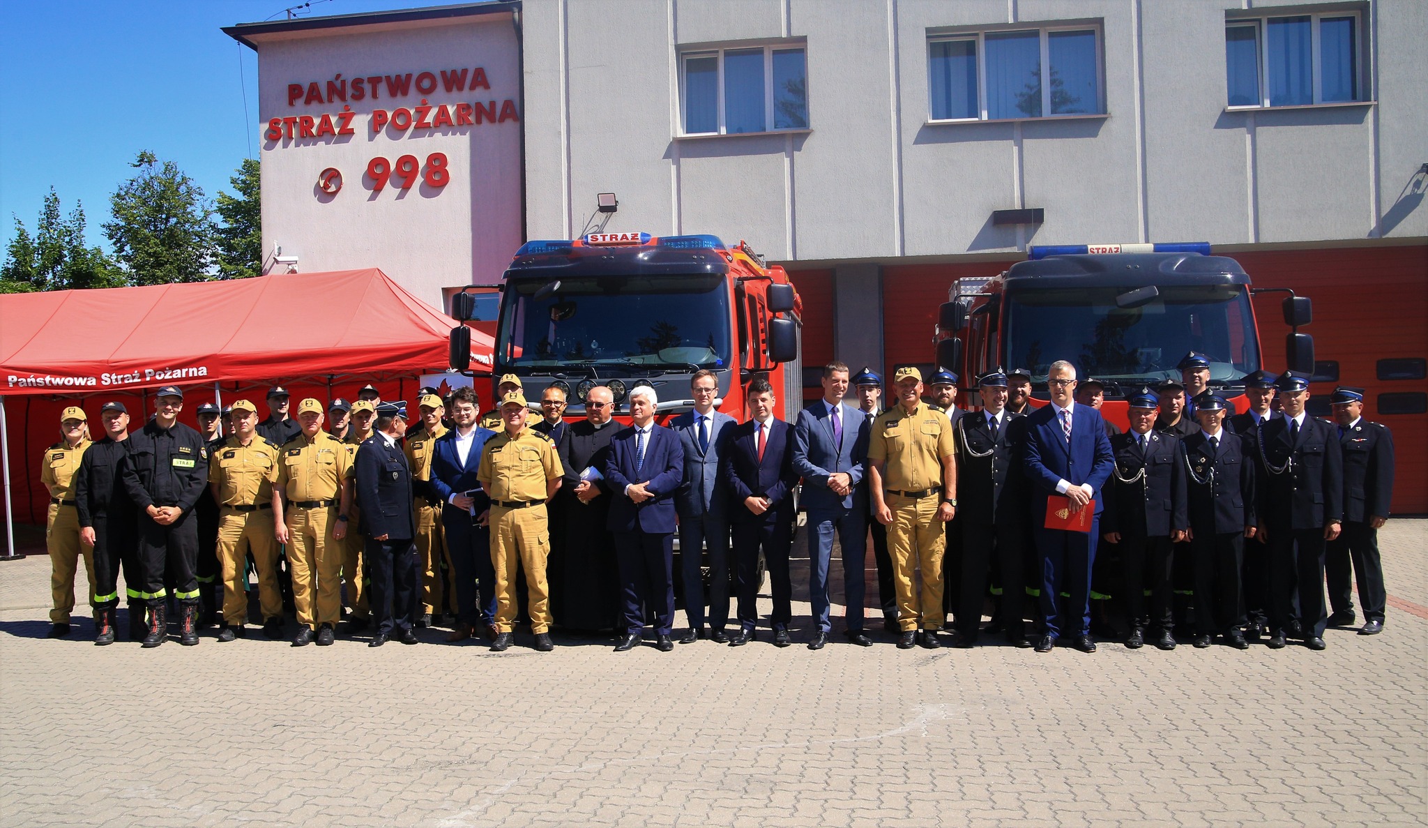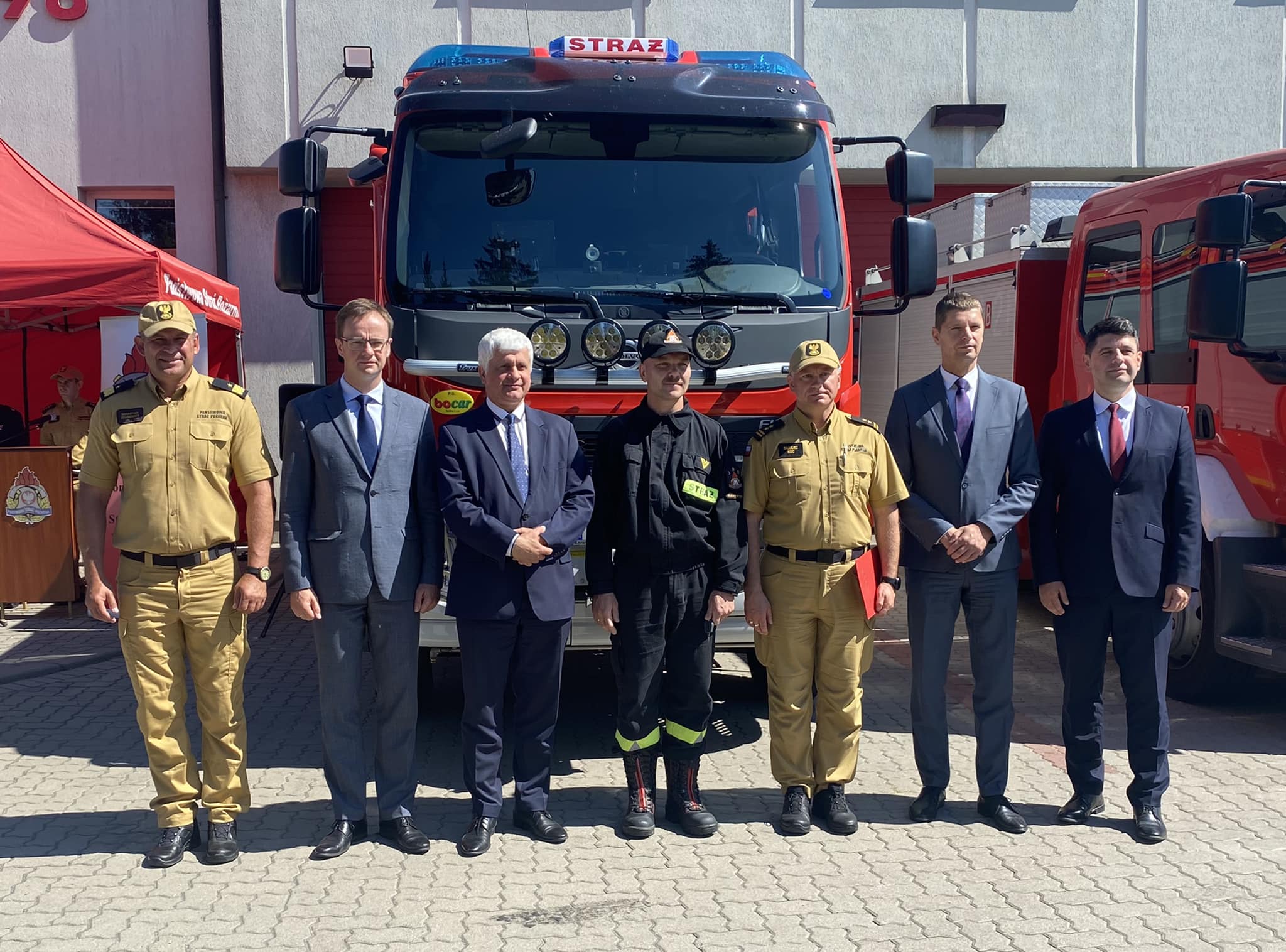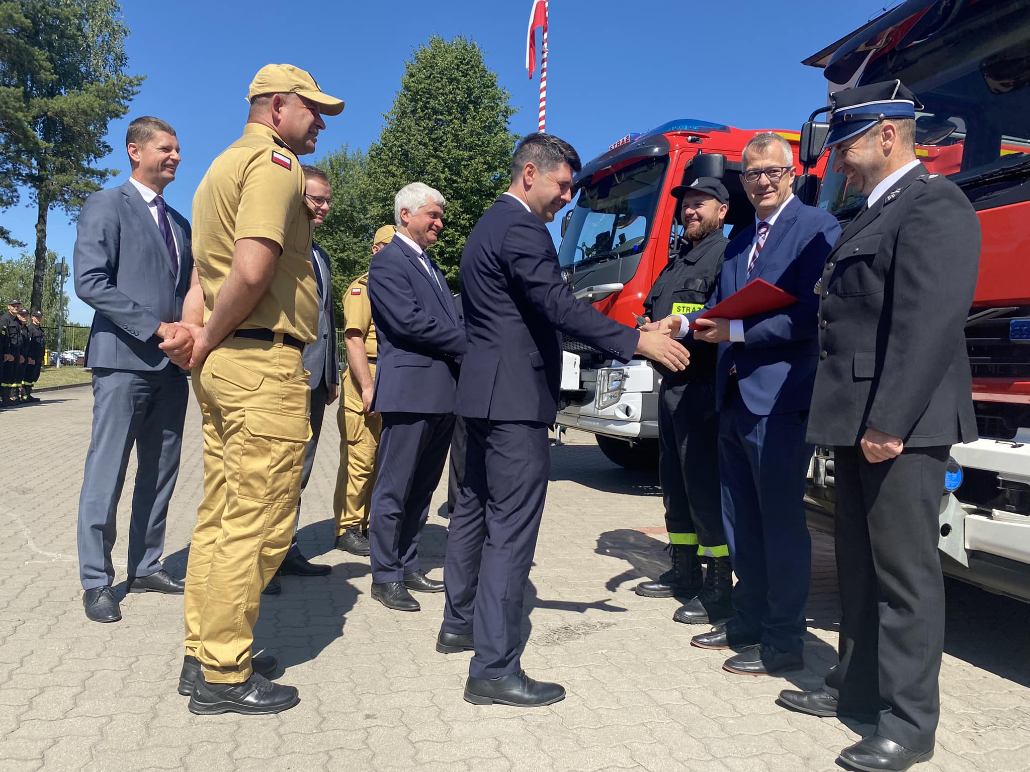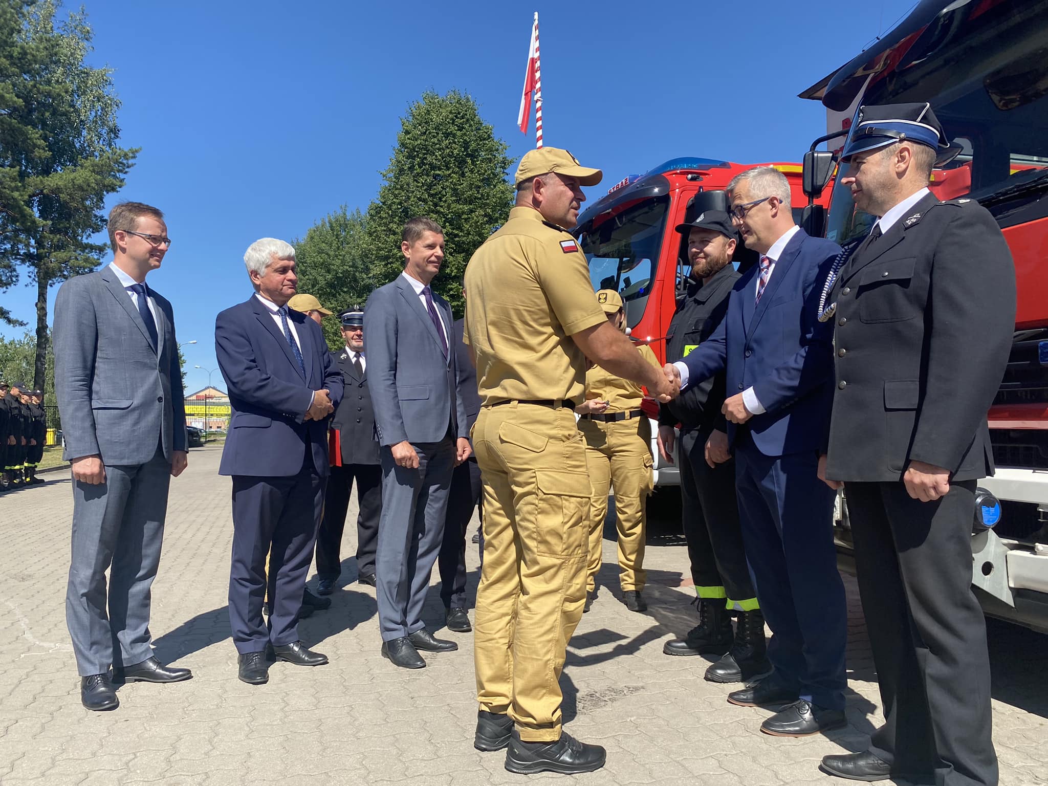 10 lipca 2023 r. nadbryg. Sebastian Zdanowicz Podlaski Komendant Wojewódzki Państwowej Straży Pożarnej oraz bryg. Marcin Bielakowicz Zastępca Podlaskiego Komendanta Wojewódzkiego Państwowej Straży Pożarnej uczestniczyli w przekazaniu samochodów pożarniczych.