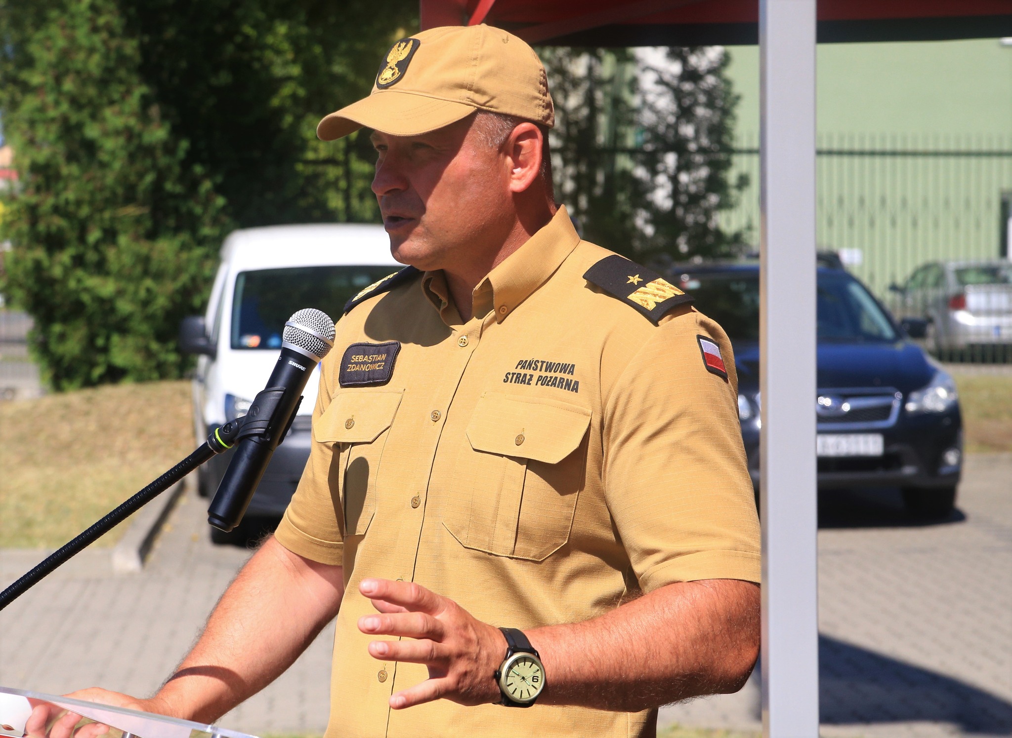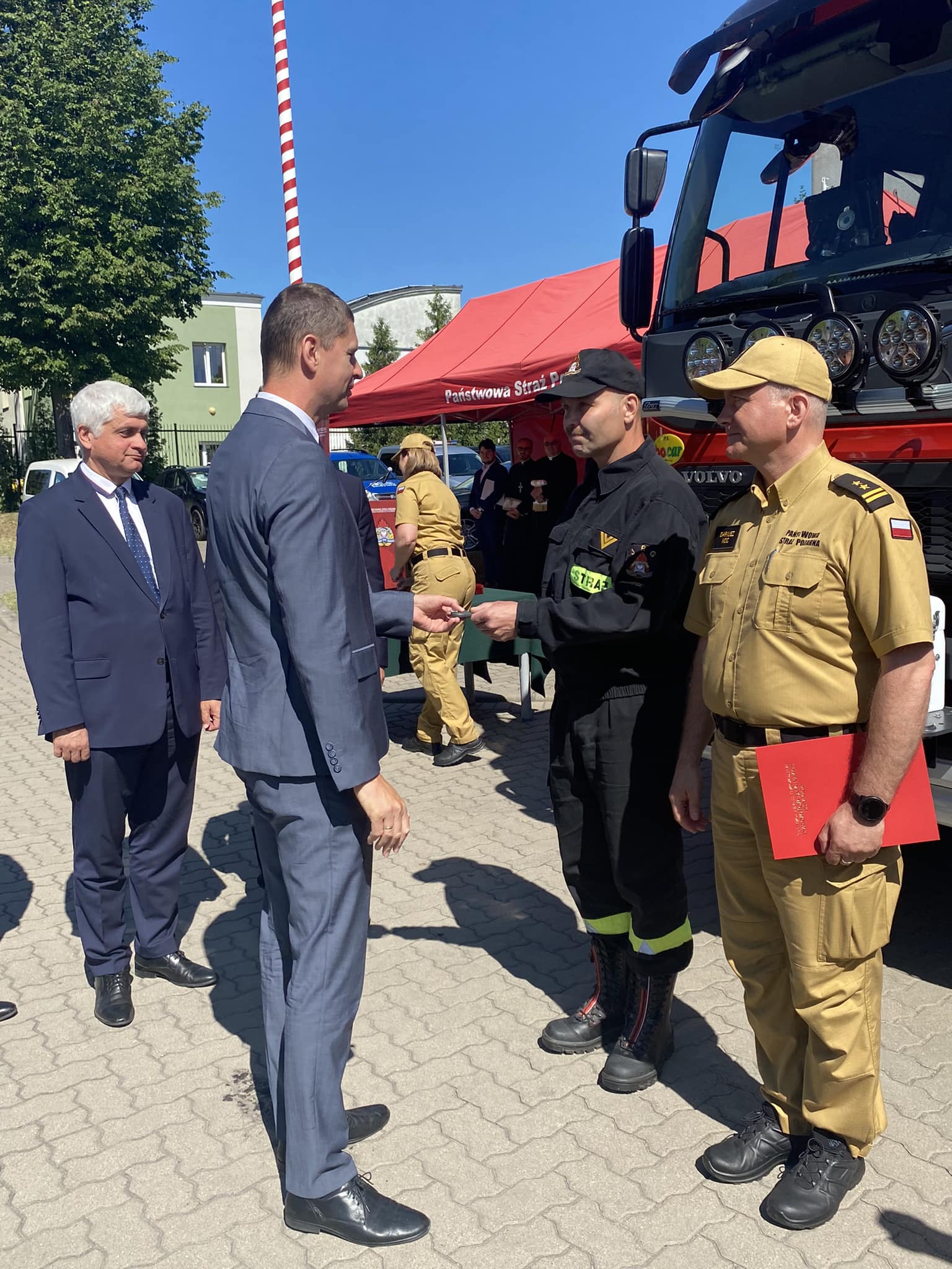 nadbryg. Sebastian Zdanowicz złożył na ręce Komendanta Miejskiego Państwowej Straży Pożarnej w Białymstoku akt przekazania średniego samochodu ratowniczo-gaśniczego GBA 2,5/16 VOLVO, zakupionego w ramach projektu „Usprawnienie systemu ratownictwa na drogach – etap V”, realizowanego przez Komendę Główną Państwowej Straży Pożarnej. Następnie wręczył akt przekazania średniego samochodu ratowniczo-gaśniczego GBA 2,6/24 VOLVO do Ochotniczej Straży Pożarnej w Rzędzianach.