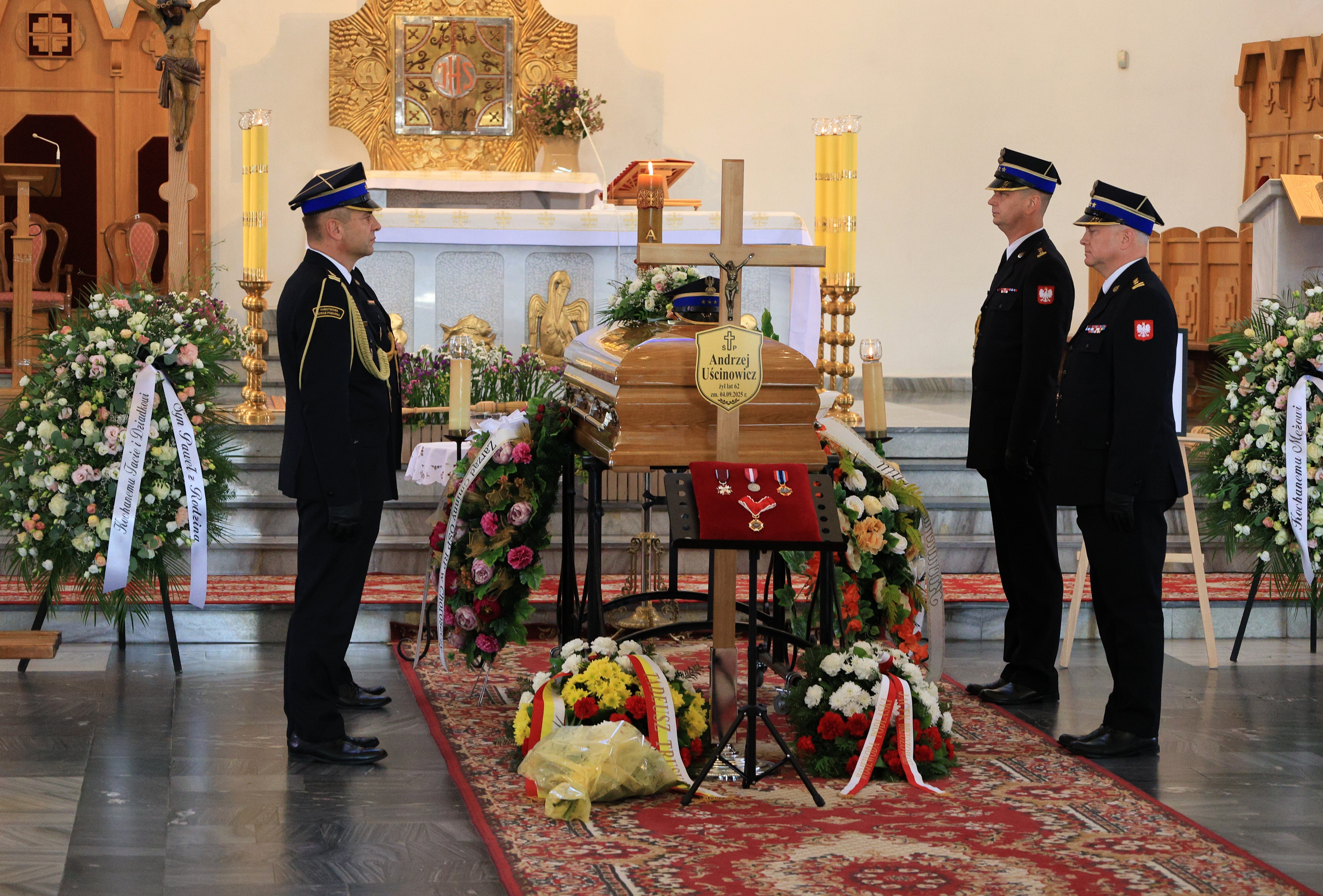 Podczas Mszy Świętej pogrzebowej we wspólnej modlitwie udział wzięła rodzina i przyjaciele śp. st. bryg. w st. spocz. Andrzeja Uścinowicza, a także delegacje funkcjonariuszy i pracowników cywilnych Państwowej Straży Pożarnej na czele z podlaskim komendantem wojewódzkimi PSP st. bryg. Januszem Kondratem, jak również druhowie Ochotniczych Straży Pożarnych.