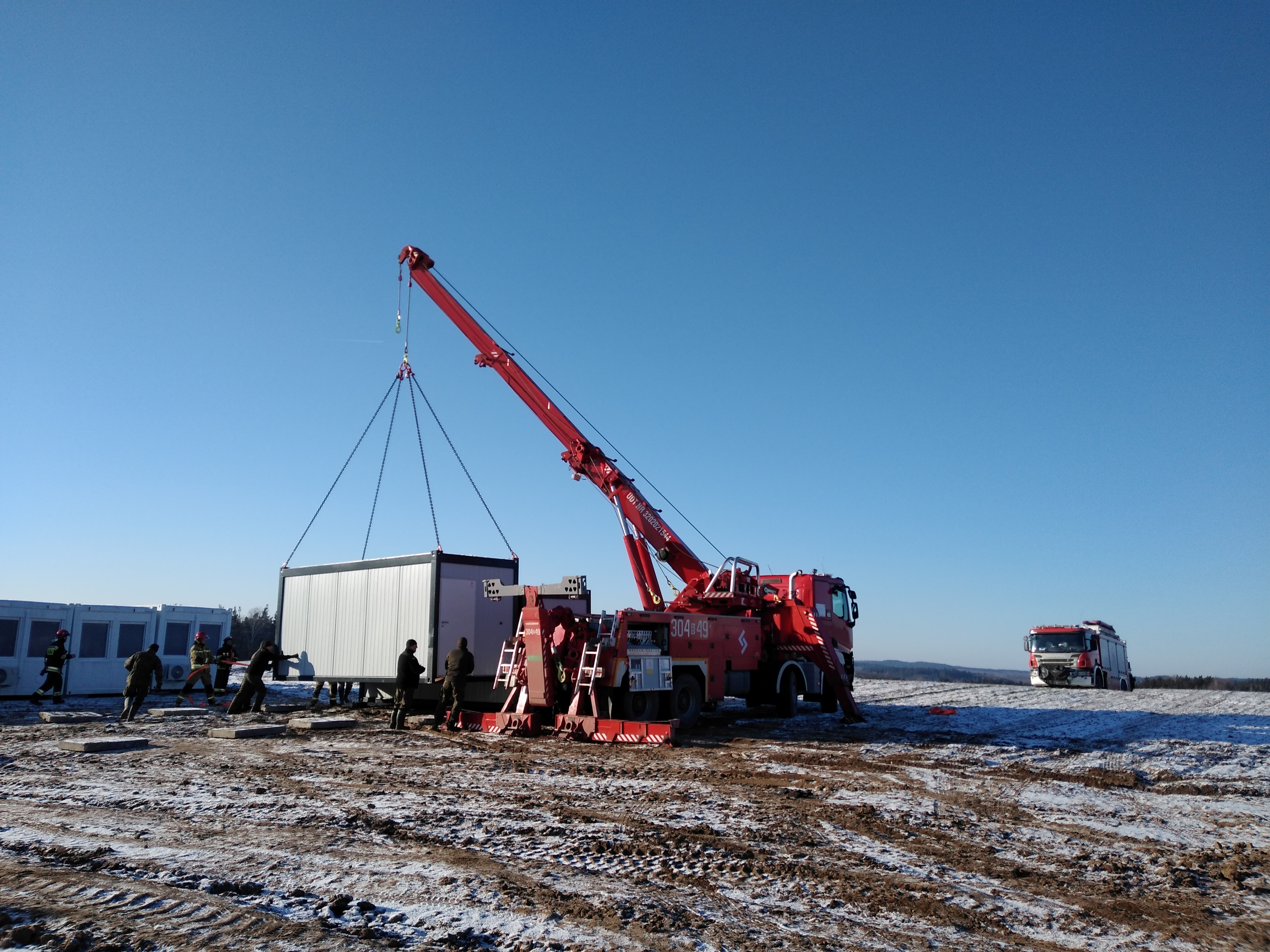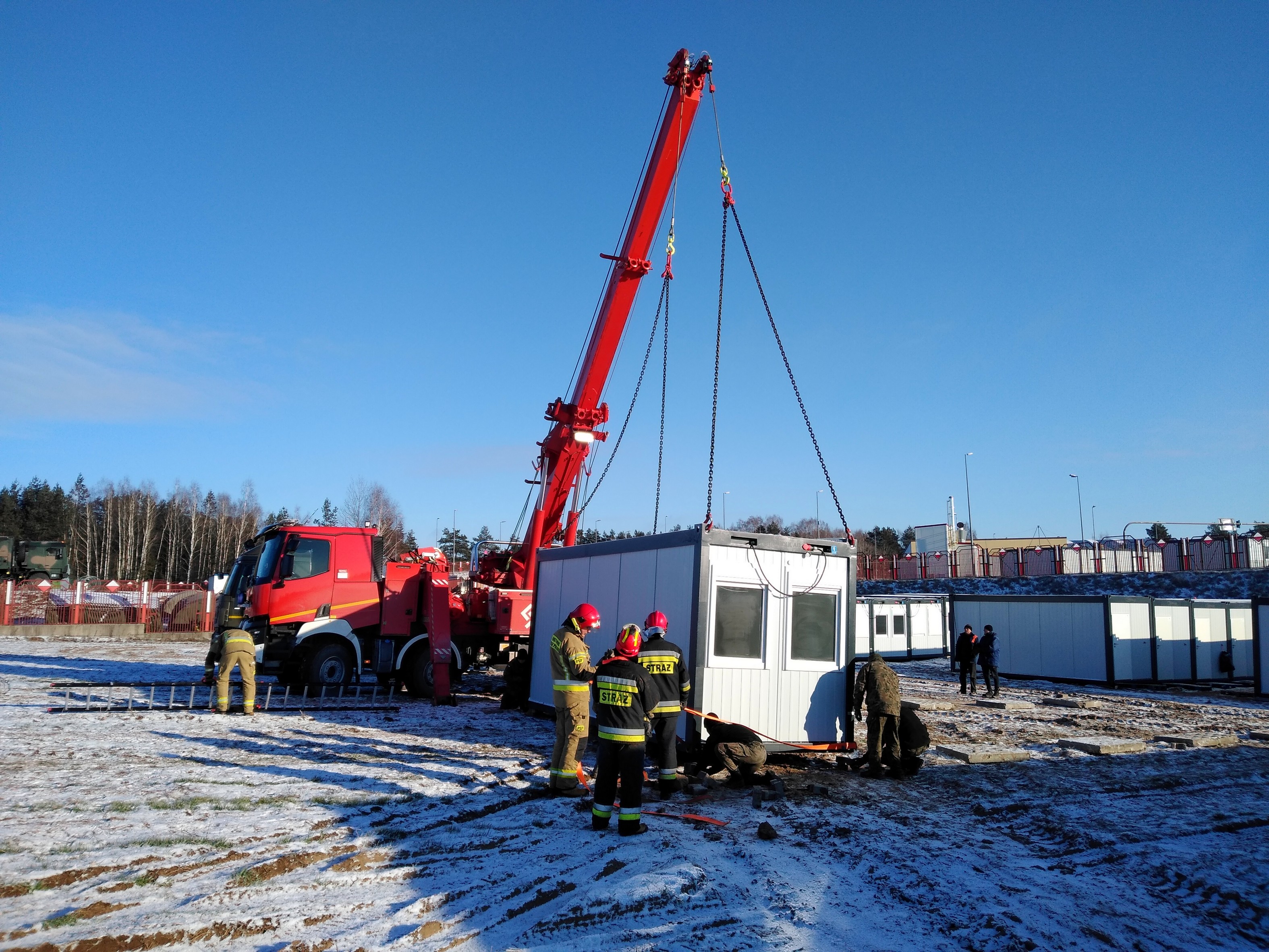 W środę 22 grudnia br. strażacy powiatu sokólskiego i białostockiego oraz Grupa Operacyjna Komendanta Wojewódzkiego PSP, kolejny dzień wspierali działania służb mundurowych w zakresie rozładunku kontenerów mieszkalnych z samochodów ciężarowych przy pomocy SCRt typ MEGA-CITY ROTATOR i SCRt Scania z JRG nr 4 KM PSP w Białymstoku. Kontenery kwaterunkowe mają za zadanie poprawić komfort pełnienia służby na polsko- białoruskiej granicy w niekorzystnych warunkach atmosferycznych.