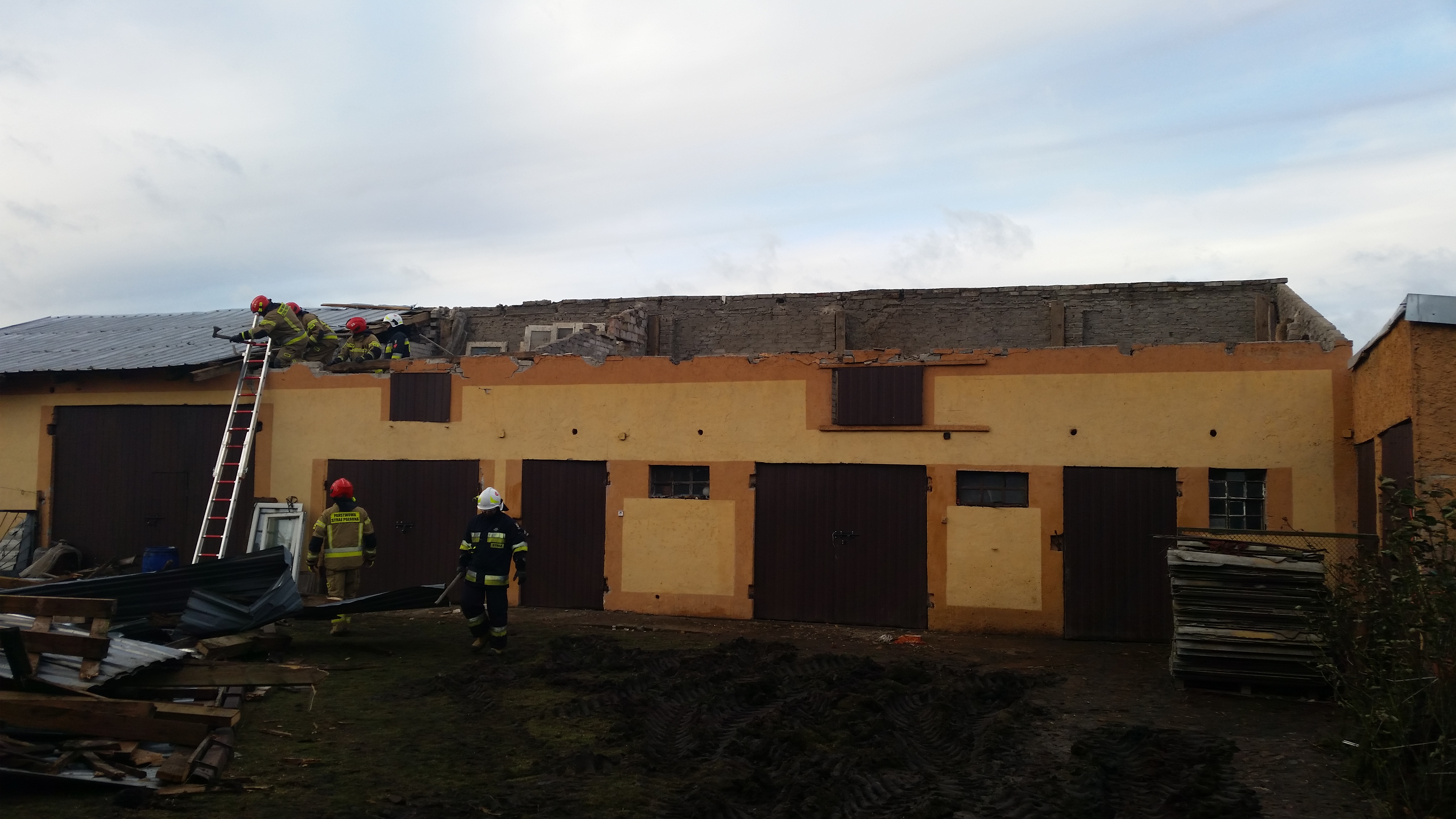 Do najpoważniejszych zdarzeń doszło w Grajewie i Szczuczynie. W pierwszym przypadku silny wiatr zerwał ze ściany szczytowej budynku wielorodzinnego elewację, która spadła na chodnik i parking. Strażacy przy użyciu podręcznego sprzętu burzącego dokładnie przeszukali gruzowisko w celu wykluczenia osób poszkodowanych. Na szczęście pod zwałami gruzu nikogo nie było. Natomiast w Szczuczynie silny wiatr zerwał dach z budynku gospodarczego na prywatnej posesji. Elementy konstrukcji dachu oparły się o pobliski budynek mieszkalny niszcząc ścianę szczytową i część dachu oraz blokując wyjście na zewnątrz właścicielom. Strażacy wspólnie w pracownikami Wielobranżowego Przedsiębiorstwa Komunalnego w Szczuczynie dysponującymi koparko-ładowarką przemieścili zerwany dach w inne miejsce umożliwiając domownikom wejście i wyjście z budynku oraz swobodne przemieszczanie się po posesji.