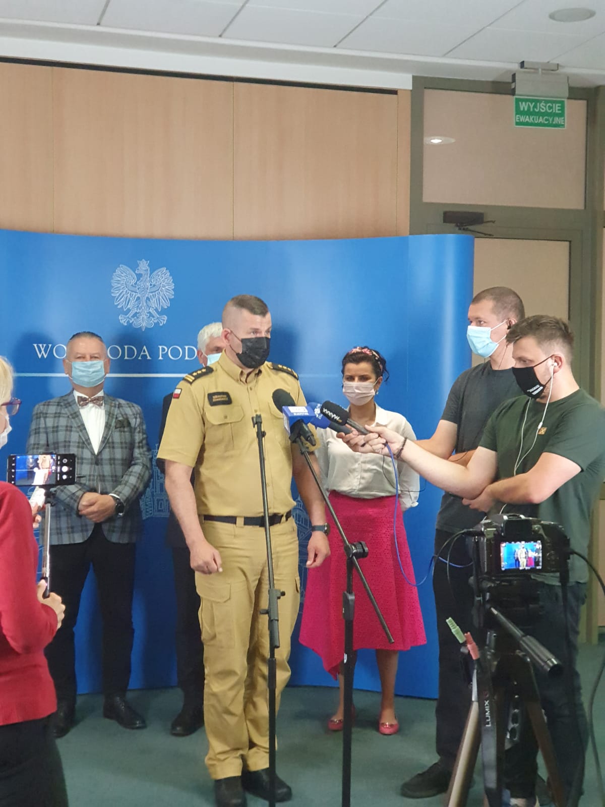 29 lipca 2021 r. Podlaski Komendant Wojewódzki Państwowej Strazy Pożatrnej st. bryg. Sebastian Zdanowicz uczestniczył w briefingu prasowym Wojewody Podlaskiego.