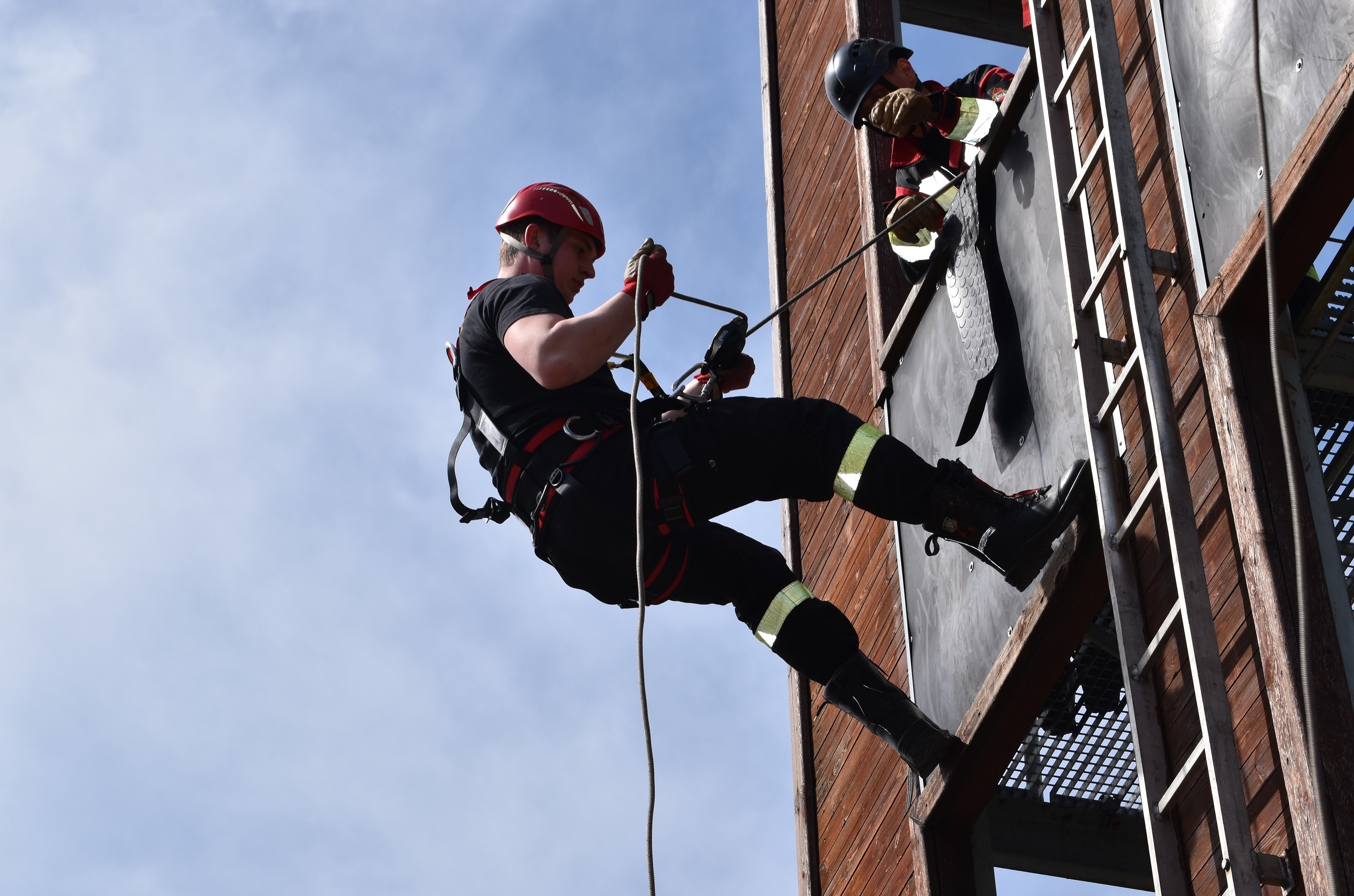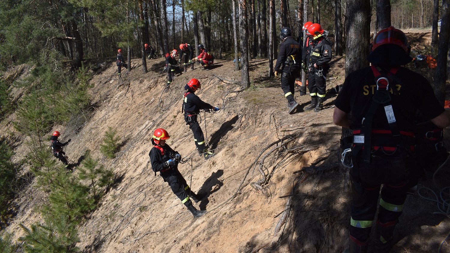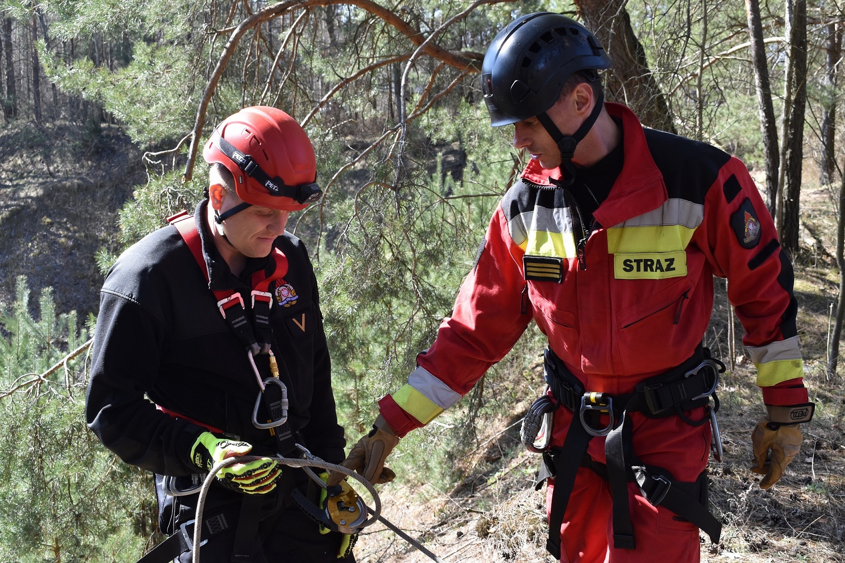 - Techniki dotarcia do miejsca zdarzenia/poszkodowanego oraz asekuracja i autoasekuracja podczas działań na wysokości. Zjazd w sytuacji awaryjnej w technice jednej liny;