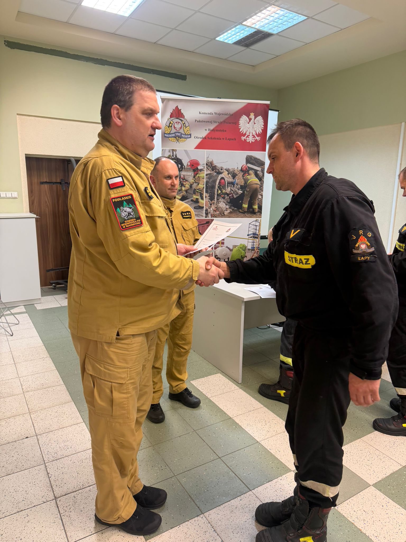 Zaświadczenia o ukończeniu szkolenia wręczył uczestnikom st. bryg. Dariusz Łukaszewicz – zastępca podlaskiego komendanta wojewódzkiego PSP.