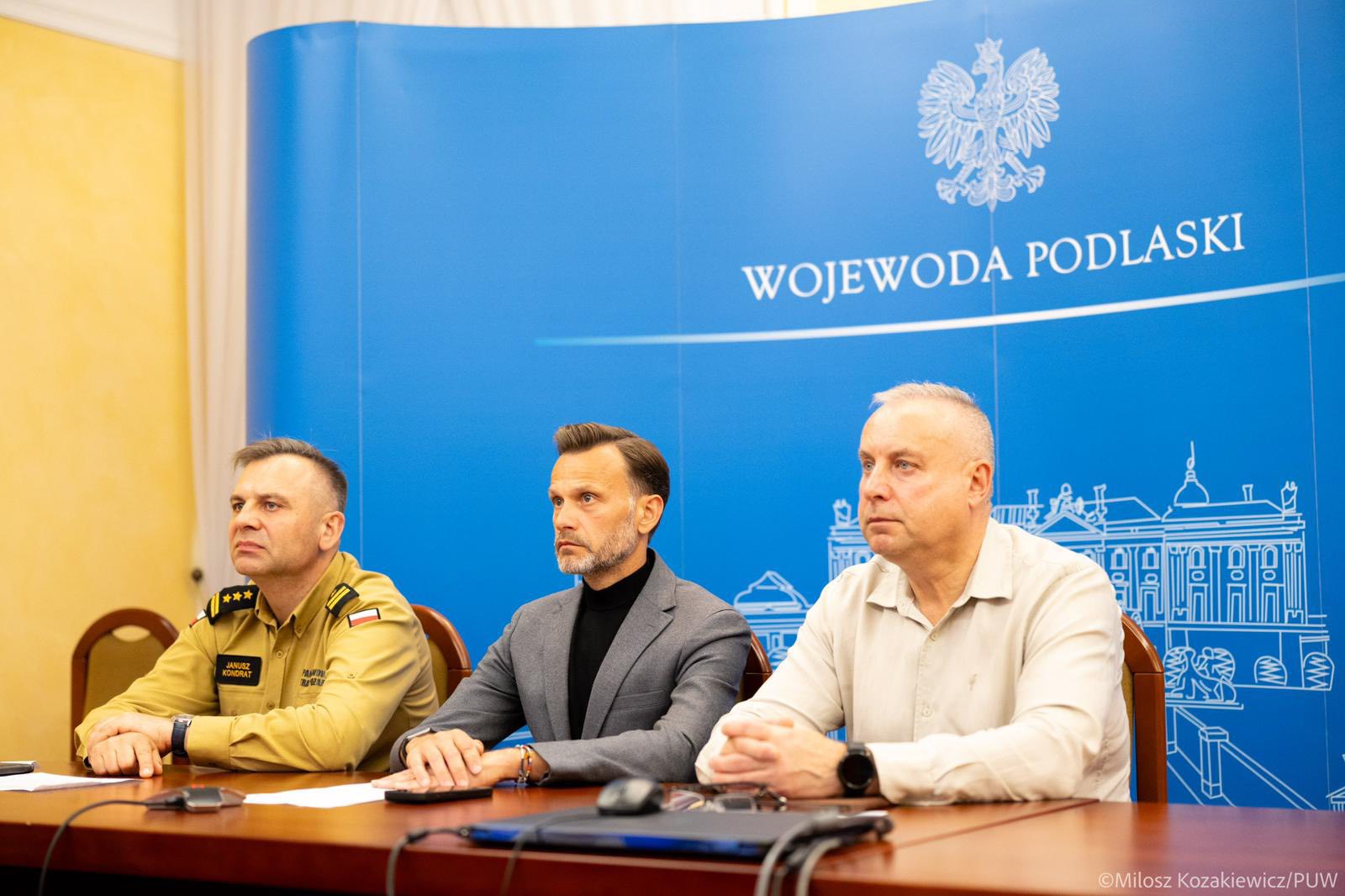 W wideokonferencji, zwołanej przez ministra Spraw Wewnętrzych i Administracji, w której uczestniczyli również minister Obrony Narodowej, minister Infrastruktury Piotr Malepszak, wzięli udział wojewoda Jacek Brzozowski, zastępca dyrektora Wydziału Bezpieczeństwa i Zarządzania Kryzysowego Bogumił Matwiejuk, a także podlaski komendnt wojewódzki PSP - st. bryg. Janusz Kondrat.
