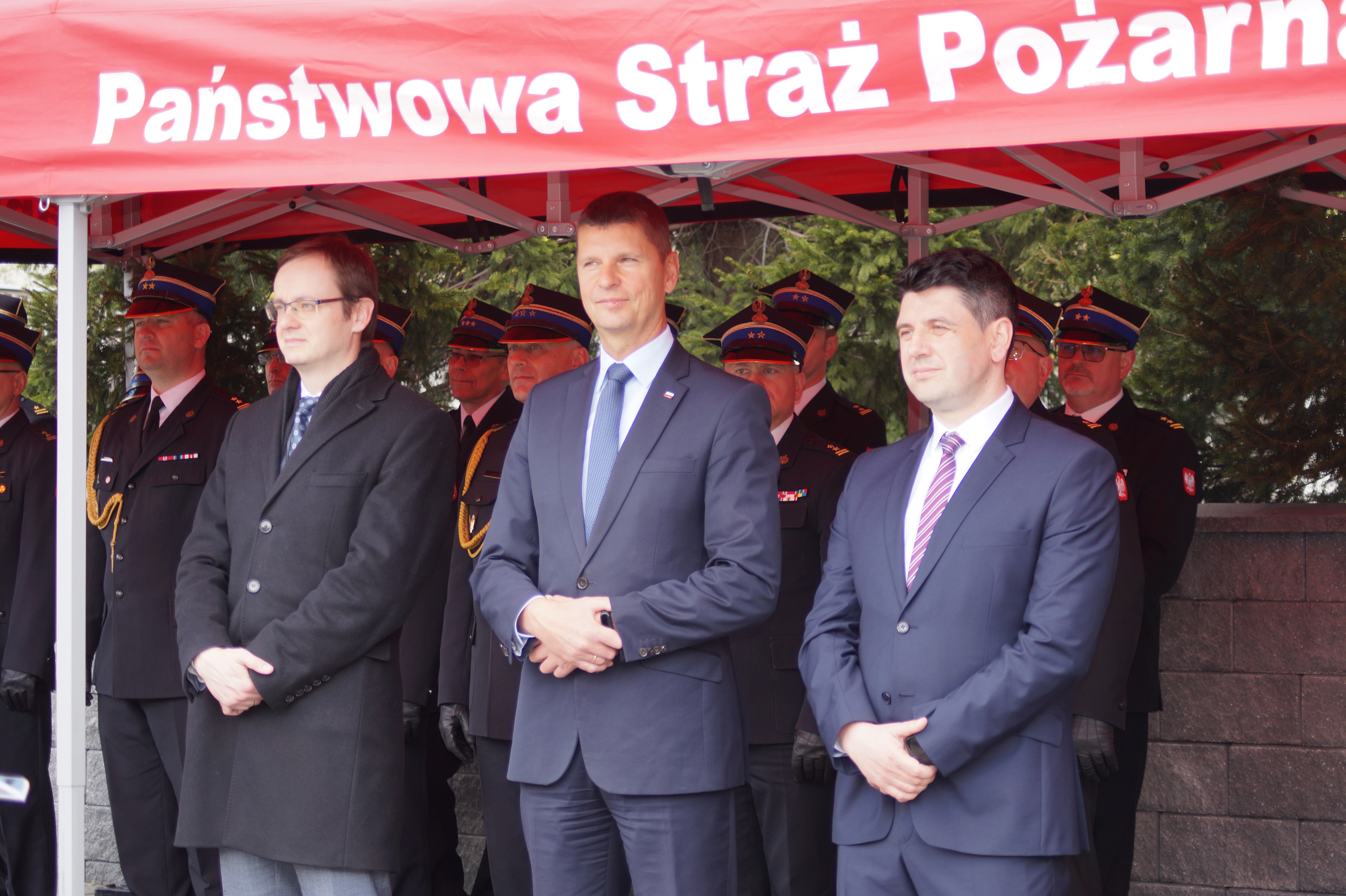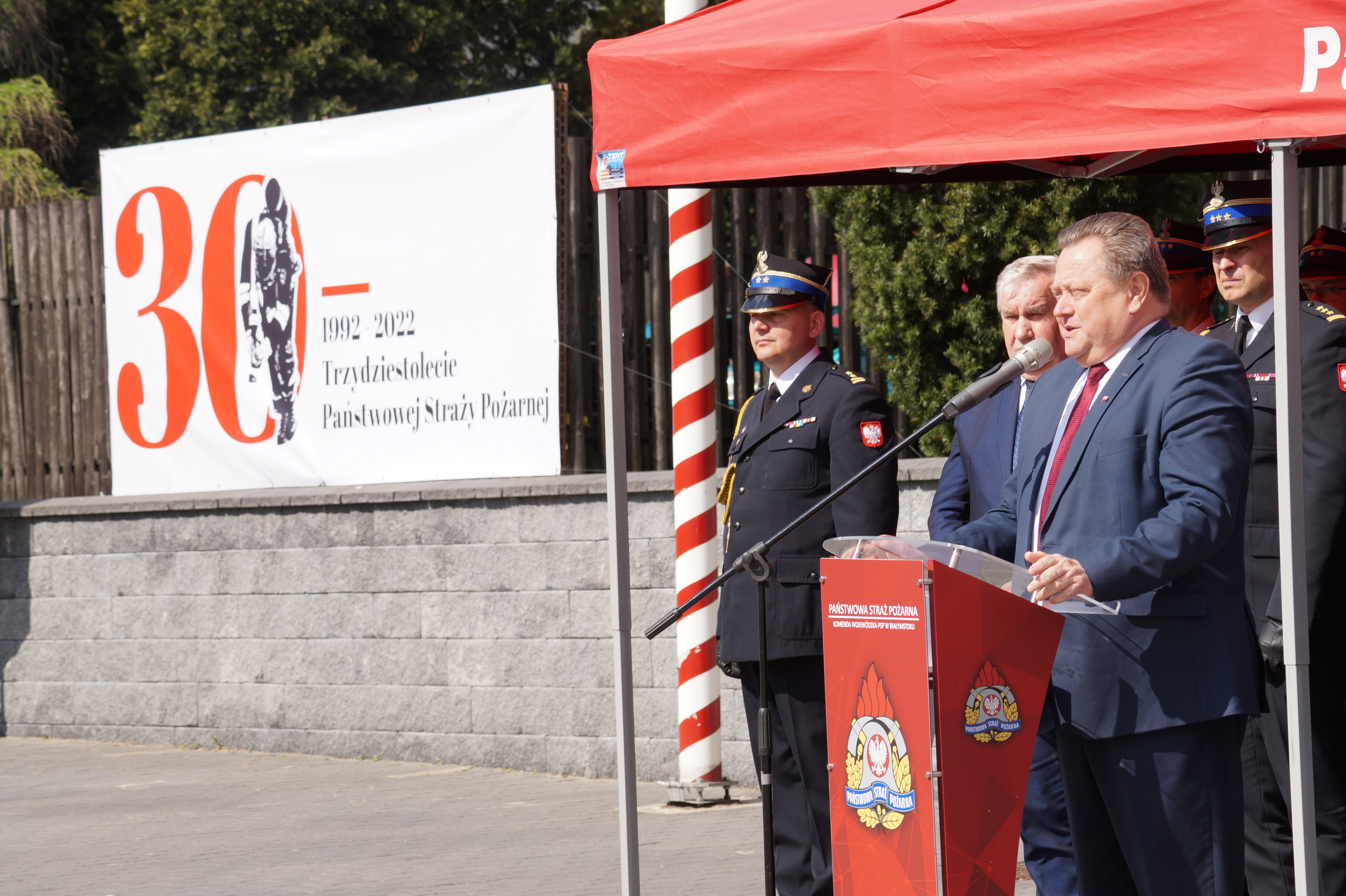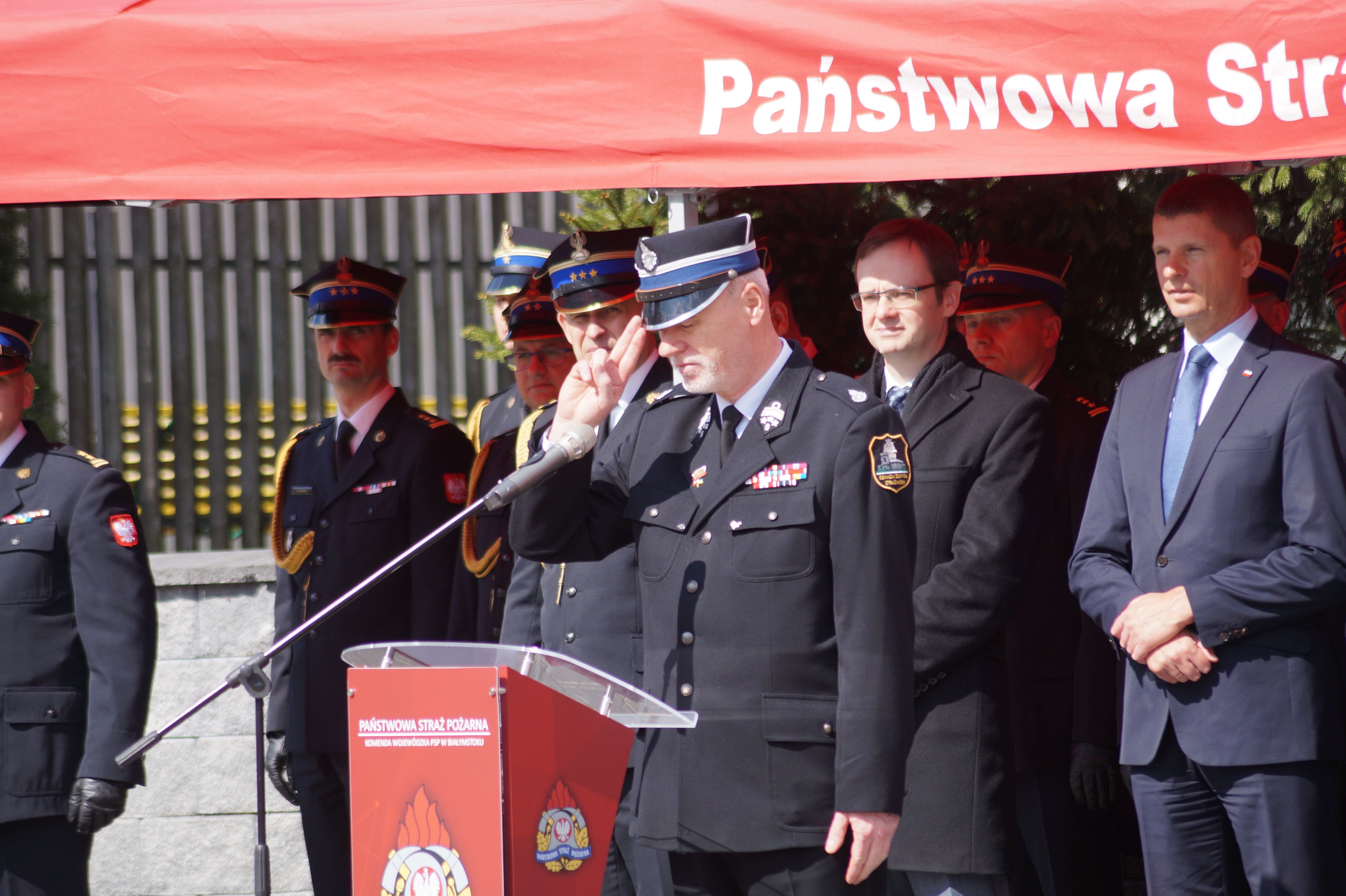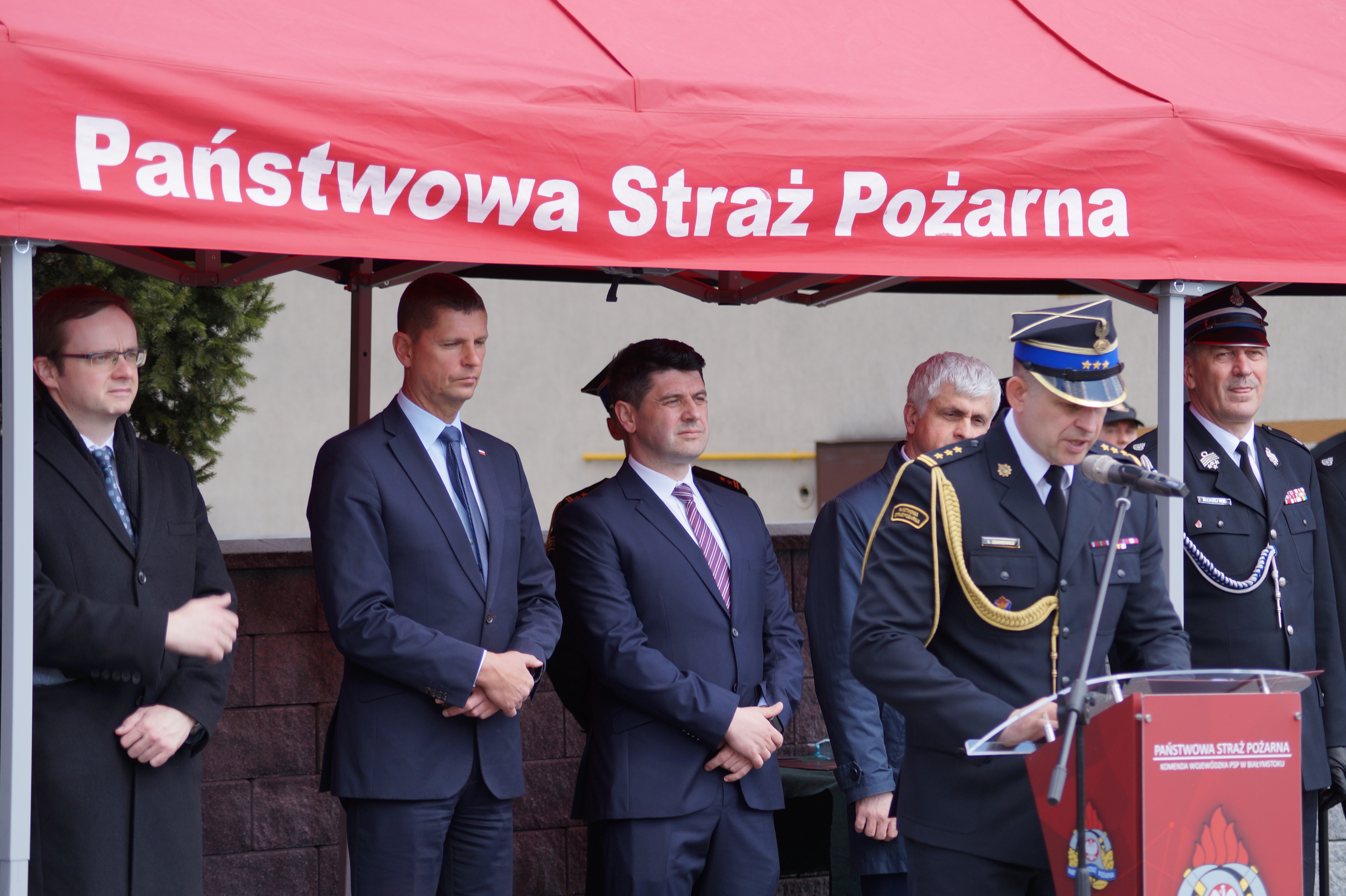 Decyzje wręczał Pan Bohdan PASZKOWSKI - Wojewoda Podlaski, w asyście st. bryg. Sebastiana Zdanowicza - Podlaskiego Komendanta Wojewódzkiego PSP i druha Andrzeja Koca - Prezes Zarządu Oddziału Wojewódzkiego Związku Ochotniczych Straży Pożarnych Rzeczypospolitej Polskiej.