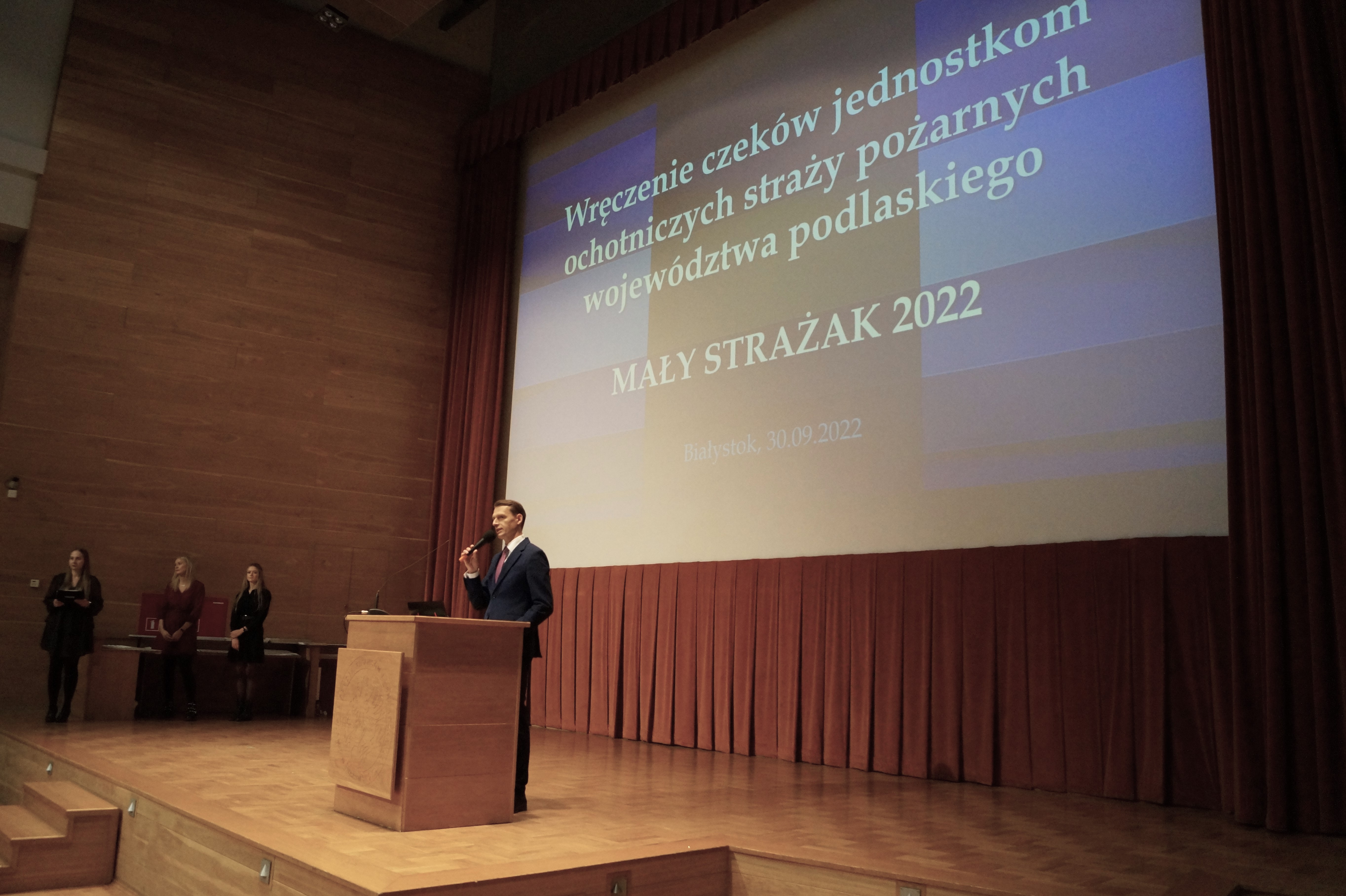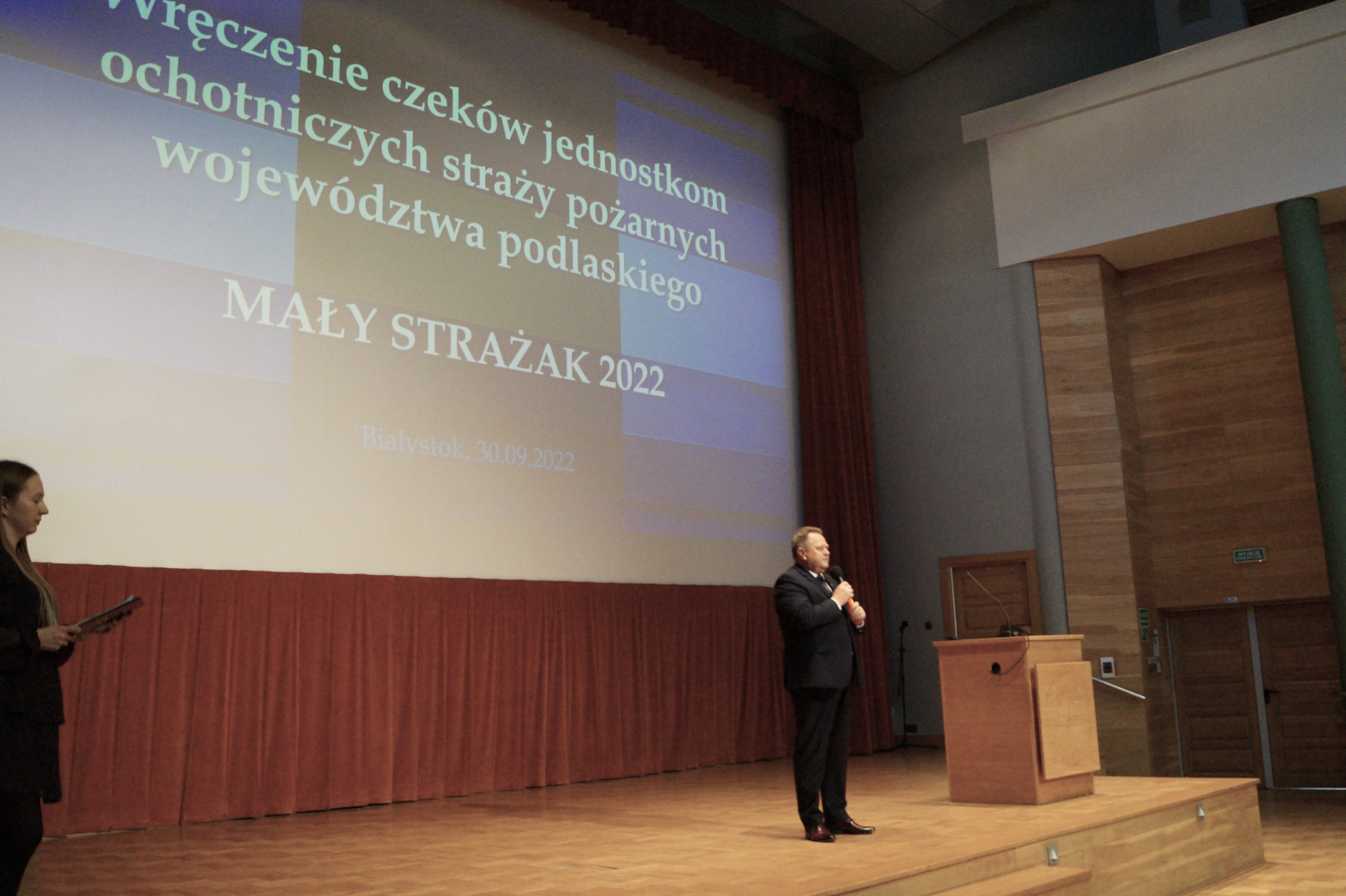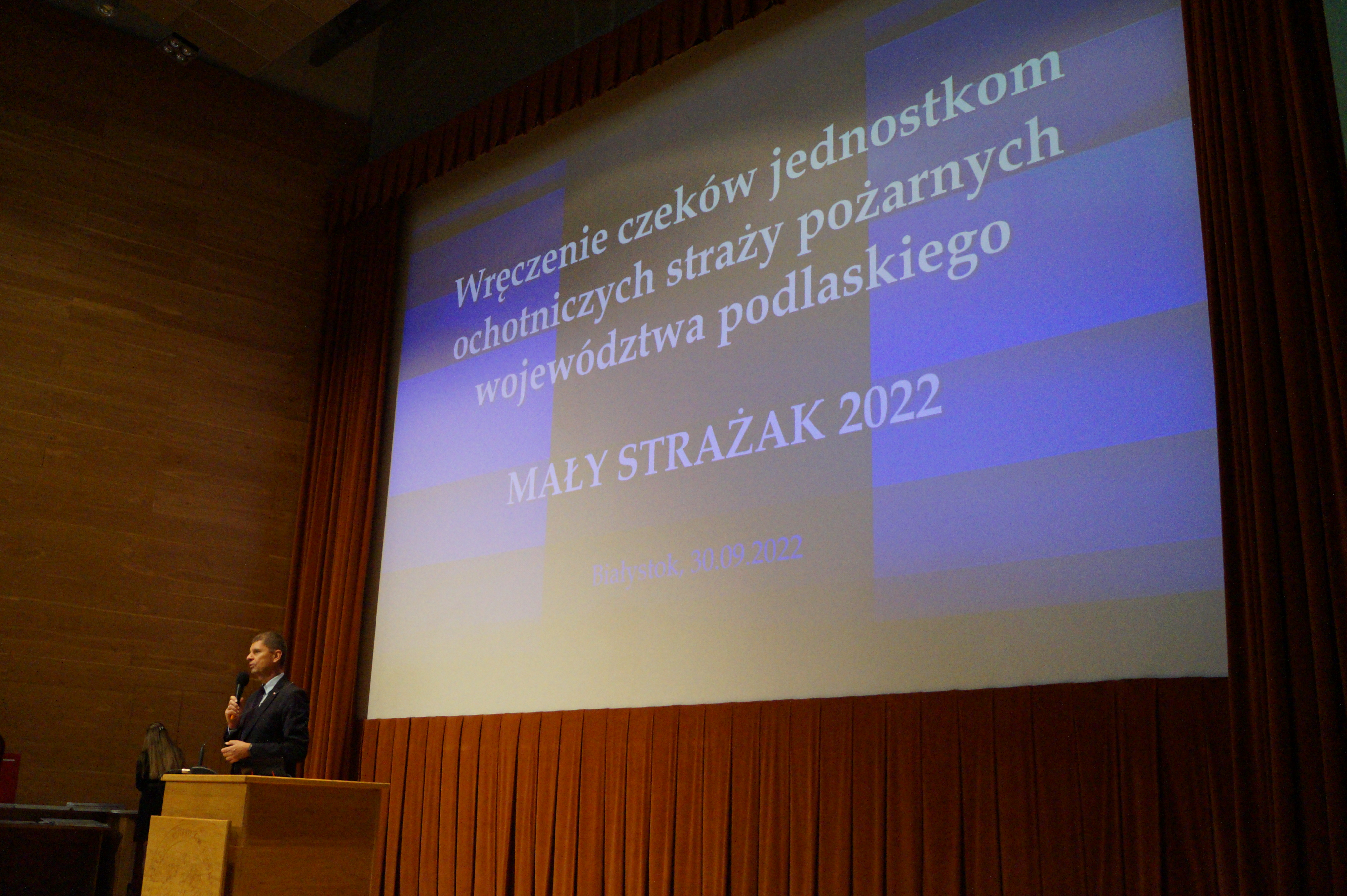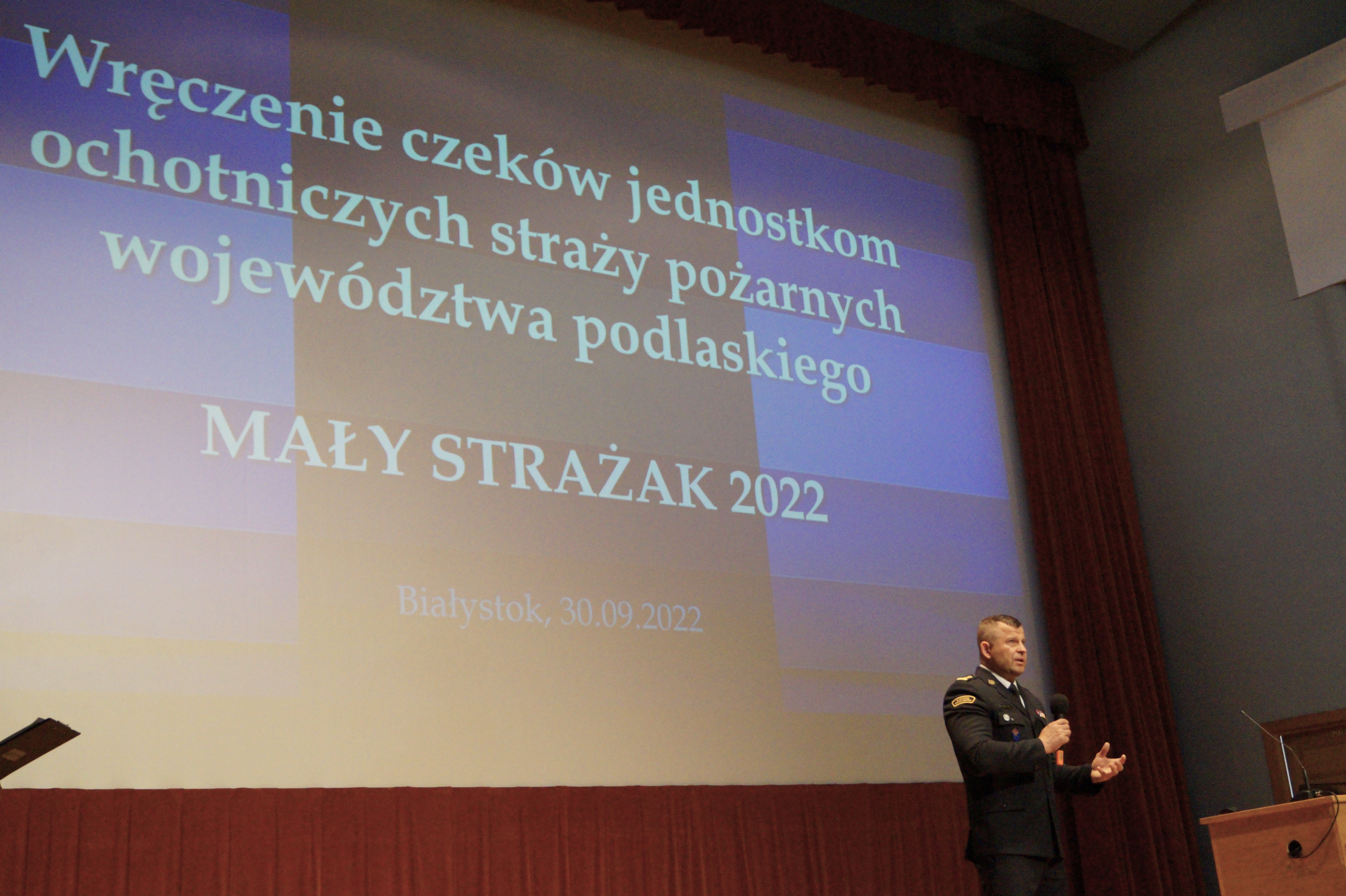 Dnia 30.09.2022 Podlaski Komendant Wojewódzki PSP st. bryg. Sebastian Zdanowicz, uczestniczył w uroczystym wręczeniu czeków jednostkom Ochotniczych Straży Pożarnych z województwa podlaskiego w ramach programu „Mały Strażak 2022”. Celem programu jest wsparcie w zakupie specjalistycznego sprzętu wykorzystywanego w akcjach ratowniczych oraz podczas usuwania skutków zagrożeń.