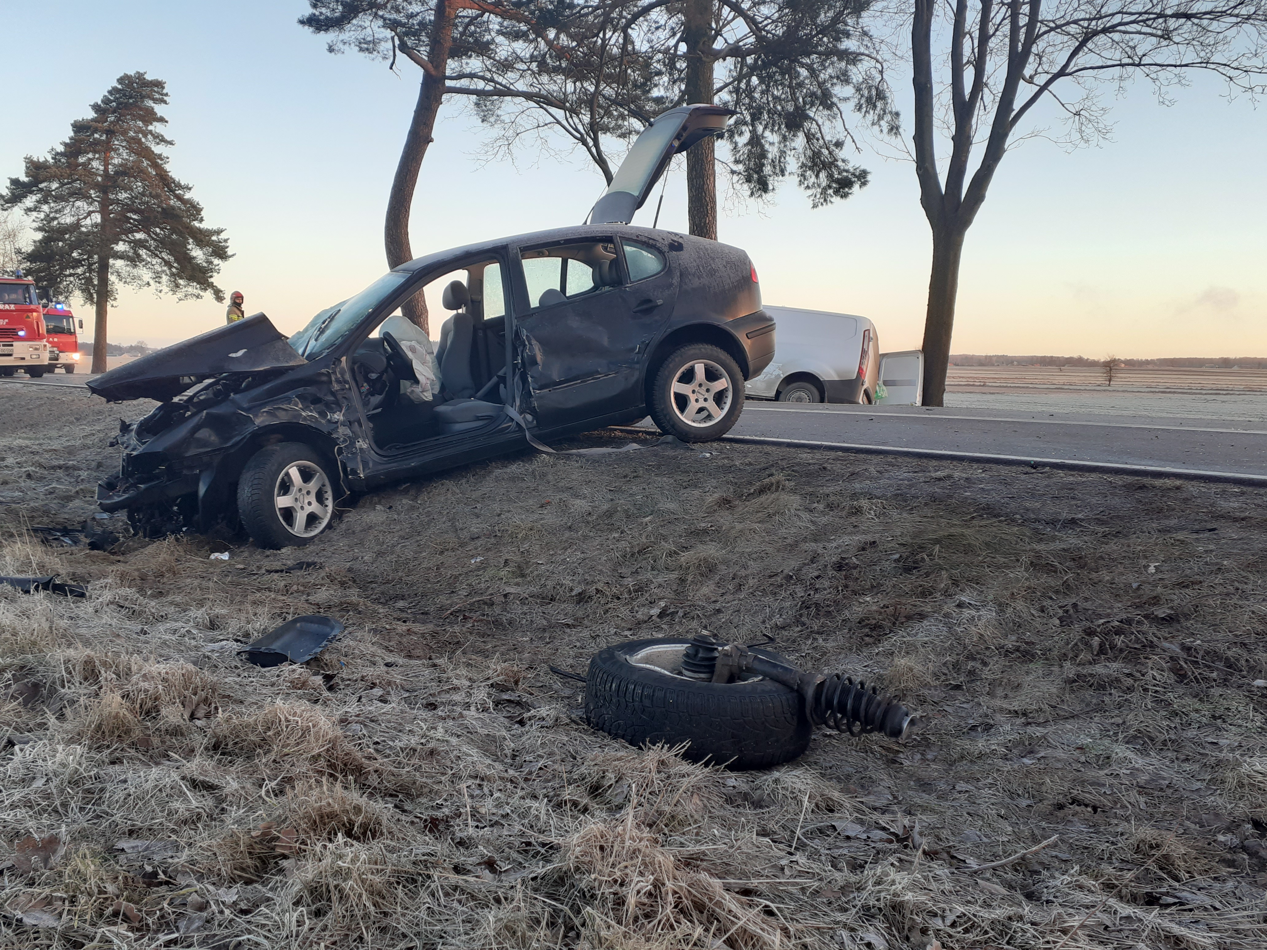 Wypadek z udziałem dwóch samochodów osobowych i samochodu ciężarowego.