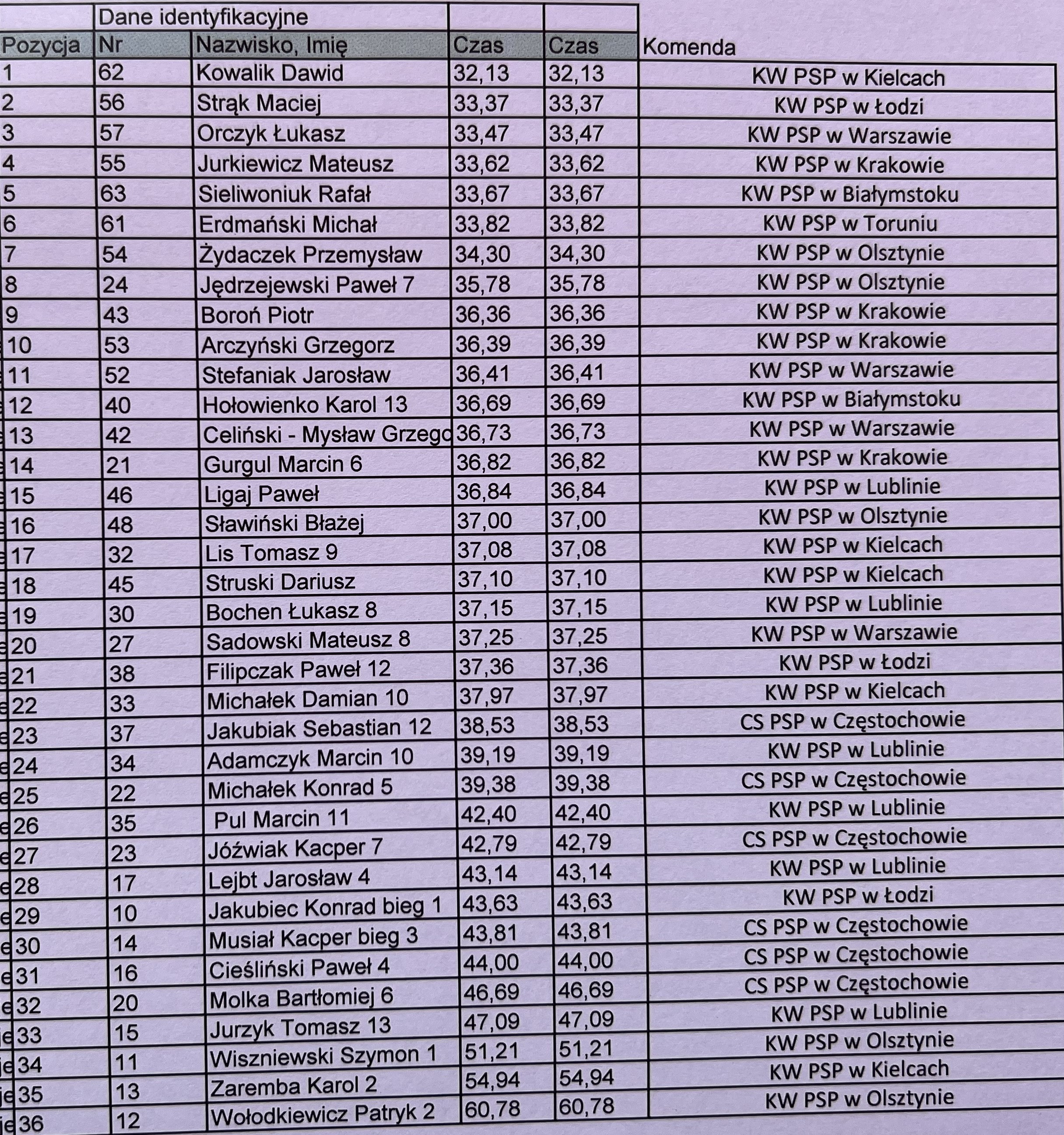 - Dawid Kowalik reprezentujący KW PSP w Kielcach z łącznym czasem 32,13 s,