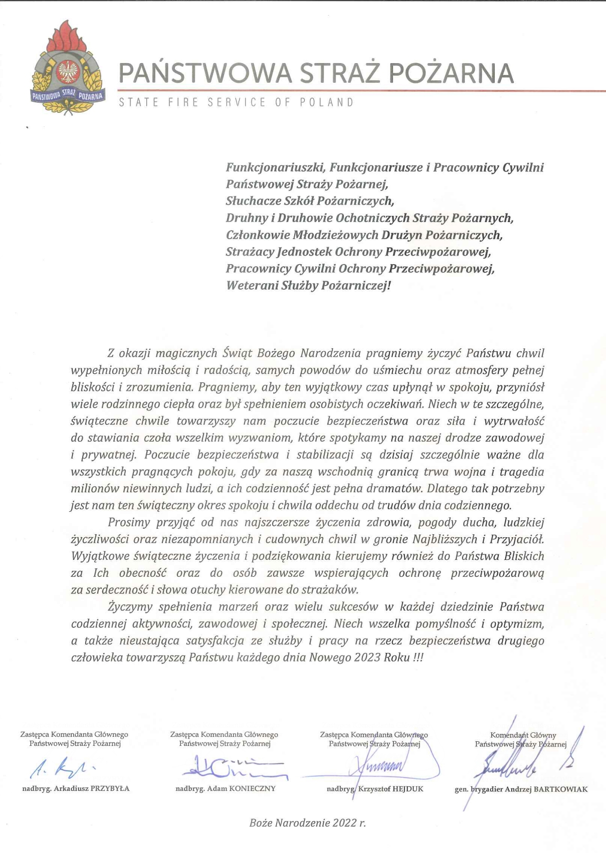 Święta Bożego Narodzenia to czas, który pragniemy przeżyć w gronie najbliższych. Pragnę złożyć wszystkim funkcjonariuszom i pracownikom cywilnym Państwowej Straży Pożarnej, strażakom Ochotniczych Straży Pożarnych oraz weteranom pożarnictwa województwa podlaskiego, a także Waszym rodzinom serdeczne życzenia pogodnych, radosnych i rodzinnych świąt. Mam nadzieję,