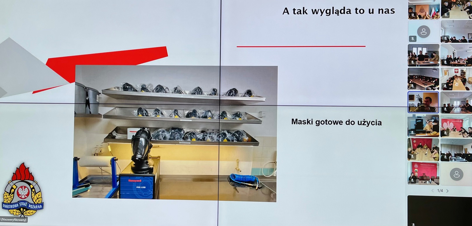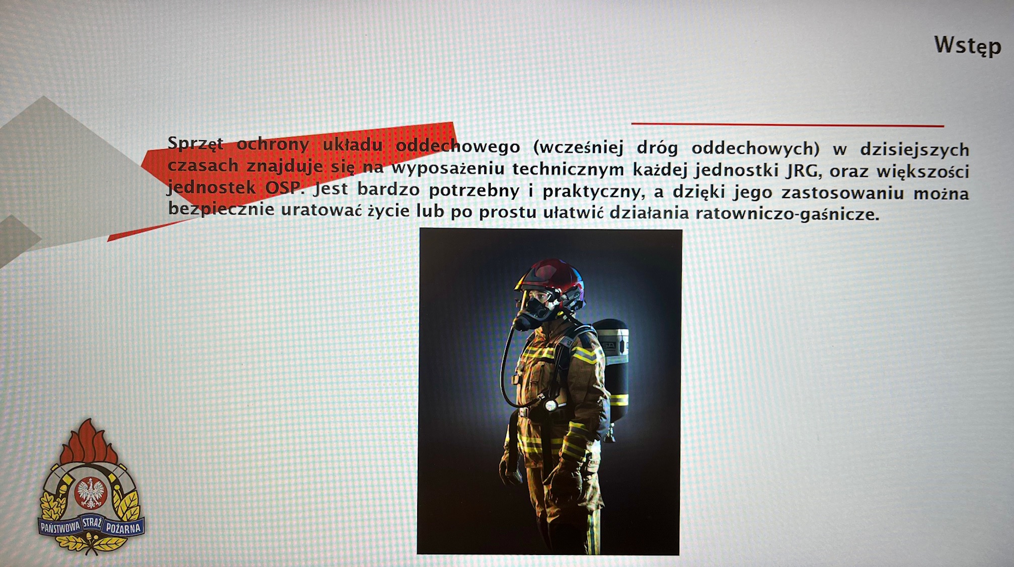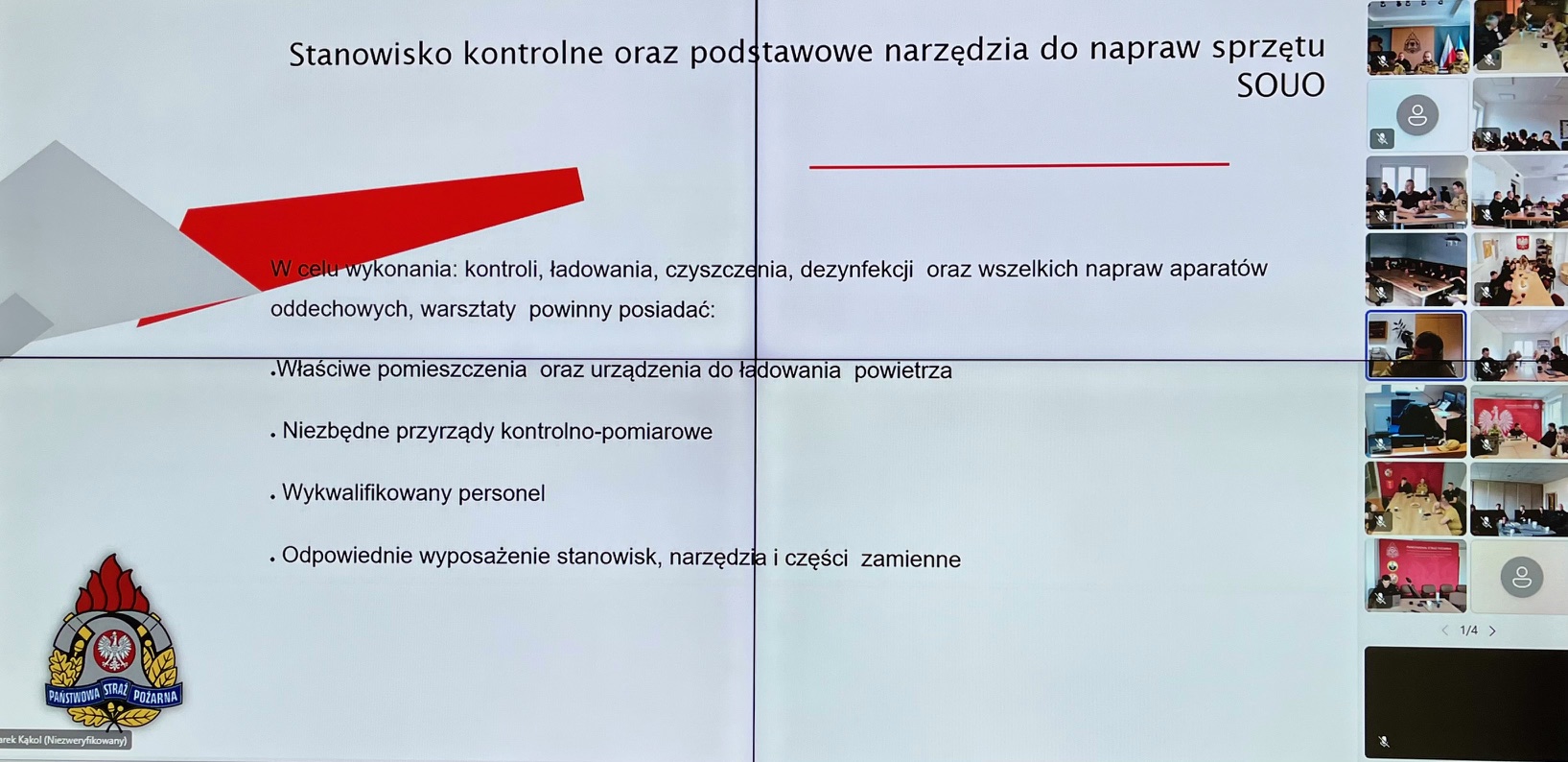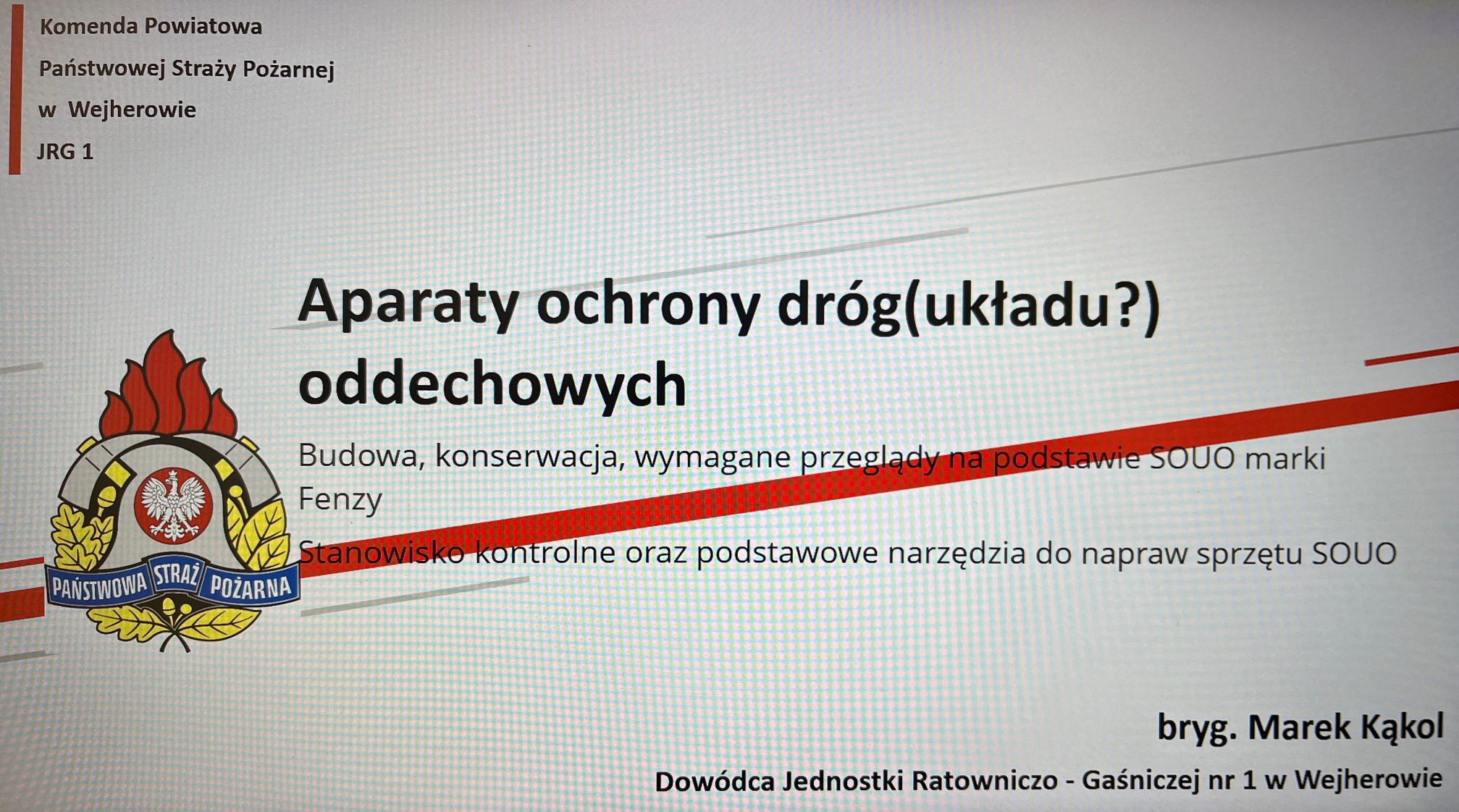 Szkolenie przeprowadził bryg. Marek Kąkol – Dowódca JRG 1 w Wejherowie, który związany jest zawodowo z ochroną przeciwpożarową od 2004 r., a od 2017 zajmuje się przeglądami i konserwacją sprzętu ochrony układu oddechowego marki FENZY. Podczas zajęć omówiono podstawową budowę oraz wykorzystanie sprzętu ochrony układu oddechowego. Przedstawioną szczegółową budowę poszczególnych elementów maski oraz aparatu ochrony dróg oddechowych marki Fenzy. Zakres koniecznych czynności serwisowych sprzętu SOUO oraz podstawowe czynności serwisowe napraw i regulacji. Przedstawiono niezbędne wymagania oraz konieczne wyposażenie stanowiska do kontroli i badań SOUO. Pokazano praktyczne wykorzystanie stacji kontroli POSI USB 3 podczas badania maski Fenzy OPTIPRO oraz aparatu Fenzy XPRO.