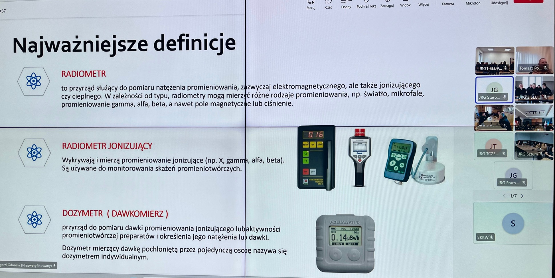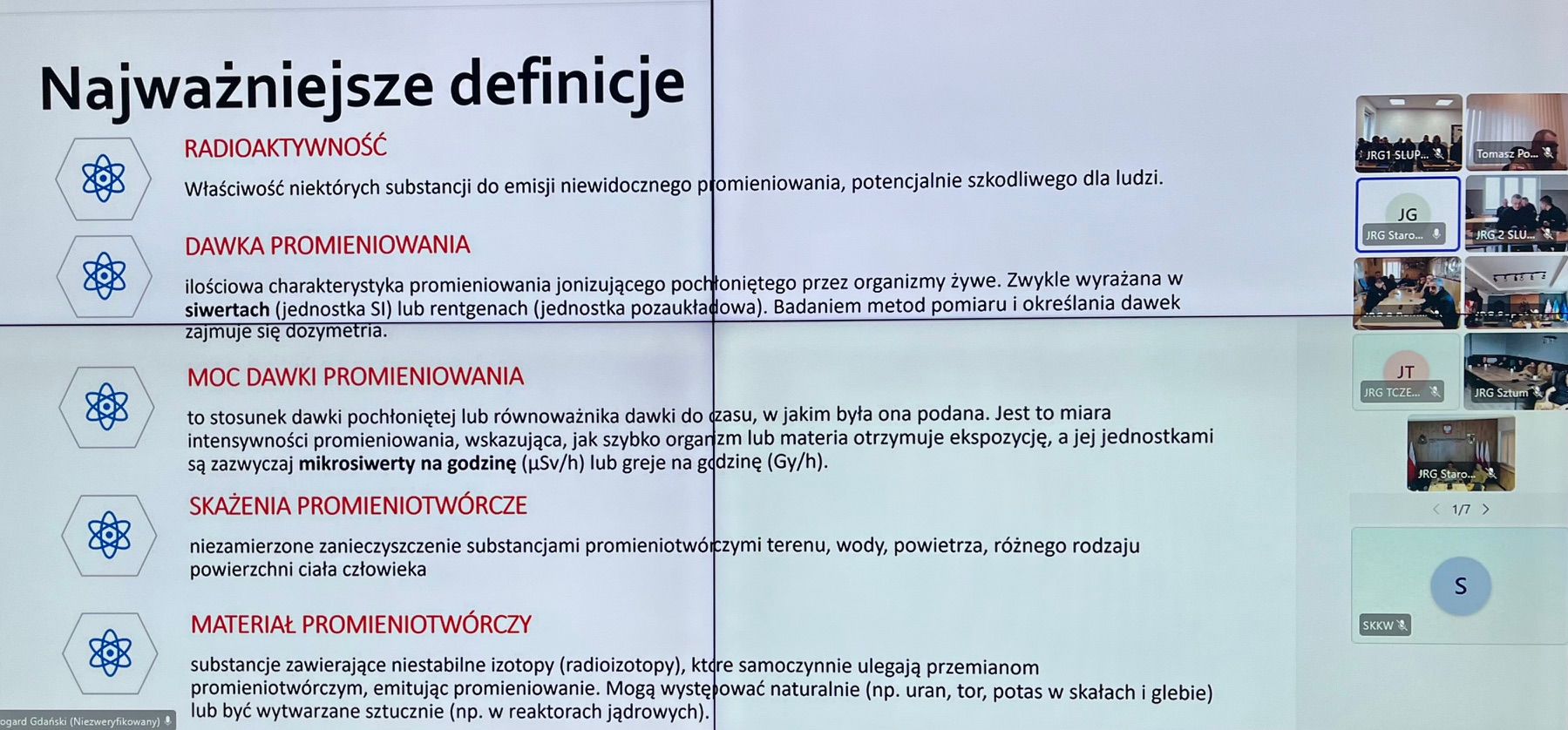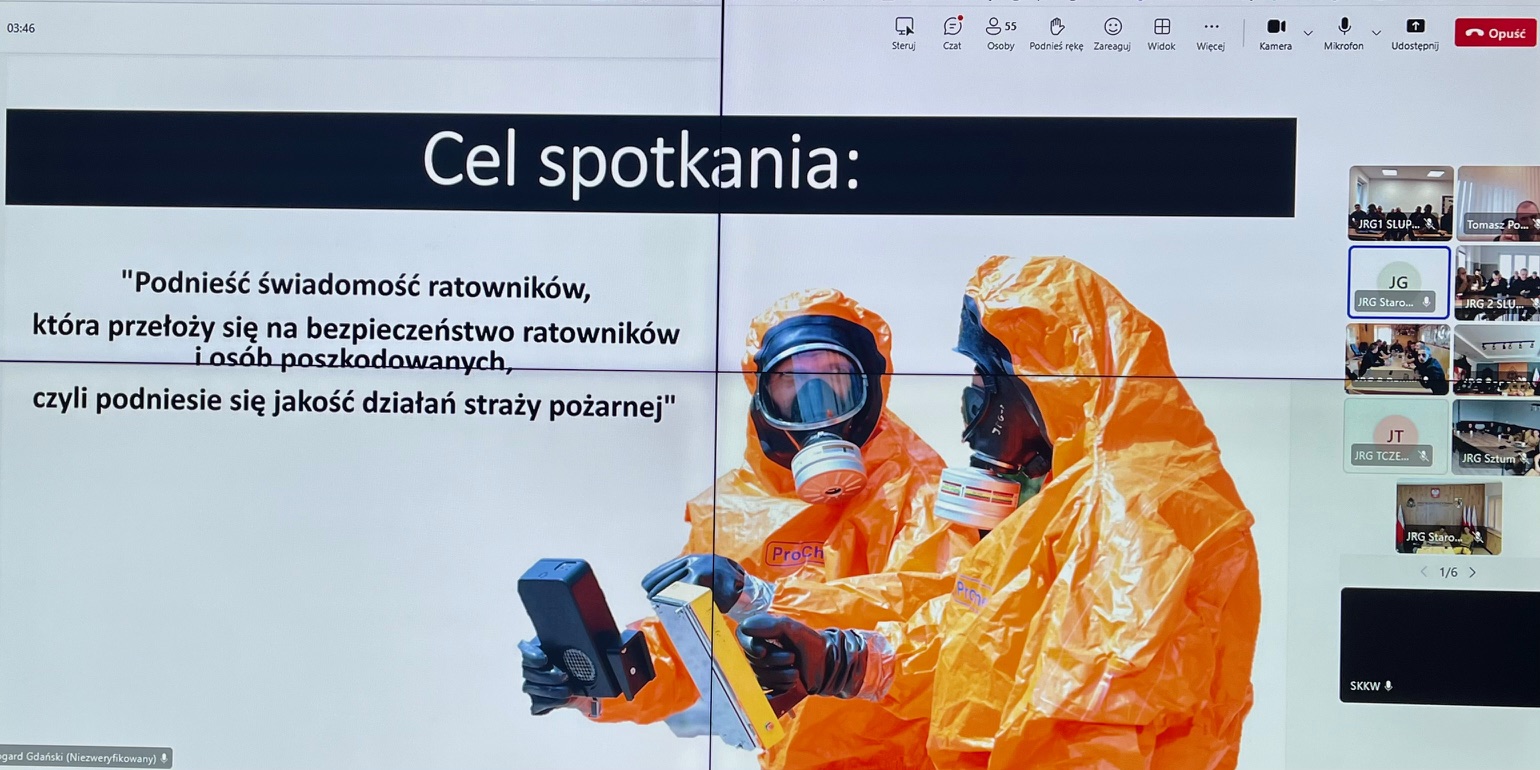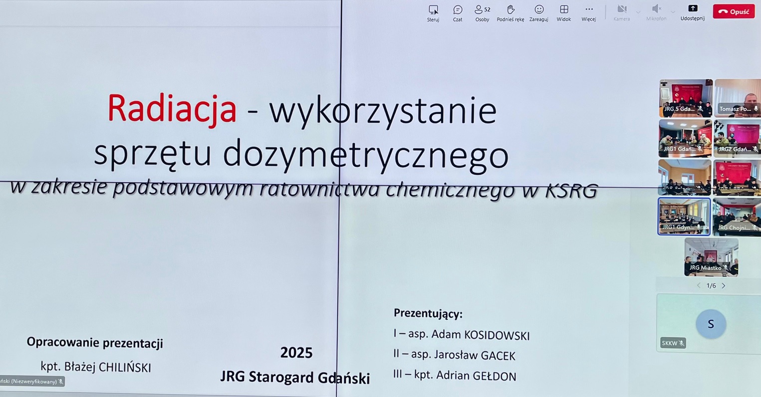 W dniach 25 - 27 listopada 2025 r. w Jednostkach Ratowniczo – Gaśniczych oraz w Stanowiskach Kierowania woj. pomorskiego odbyło się kolejne szkolenie wideokonferencyjne w ramach doskonalenia zawodowego. W trzydniowych zajęciach wzięło udział łącznie 841 osób, a ich głównym tematem była „Radiacja - wykorzystanie sprzętu dozymetrycznego”.