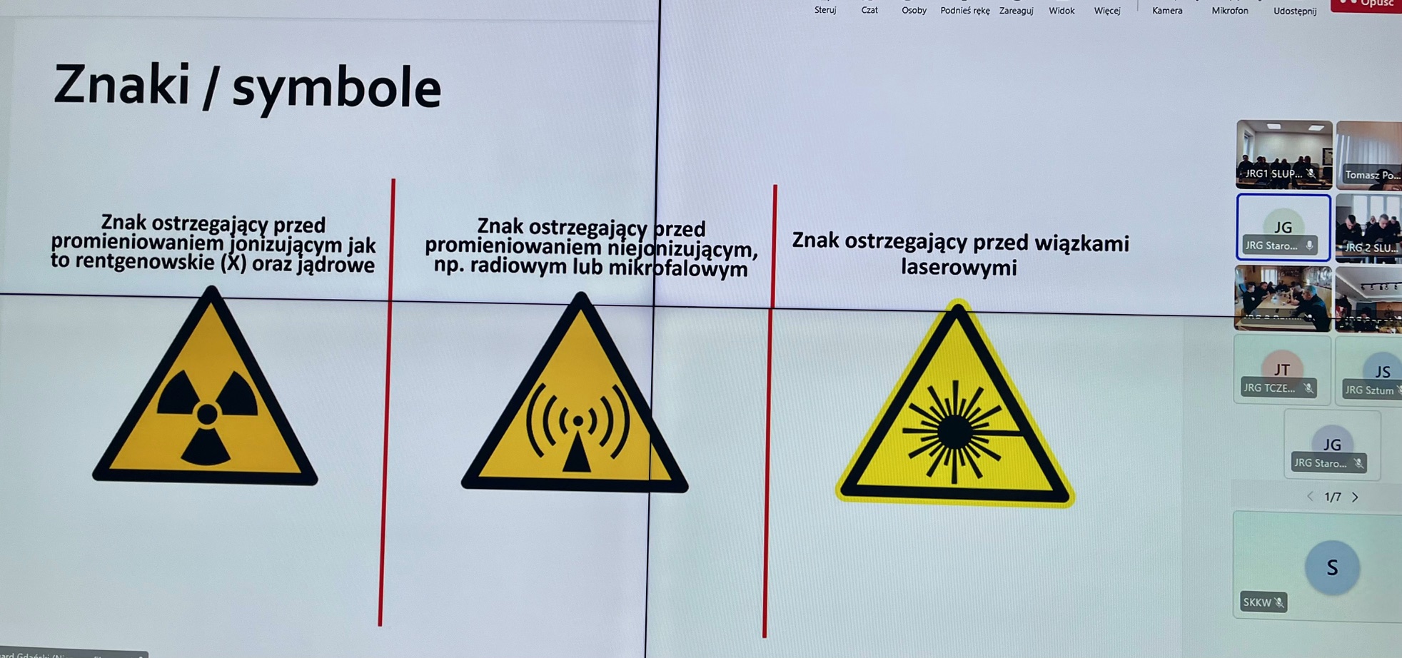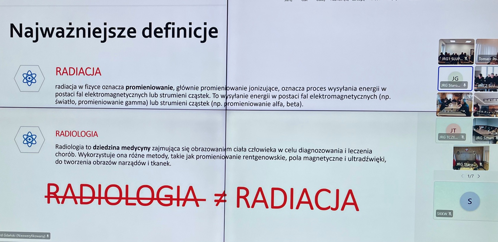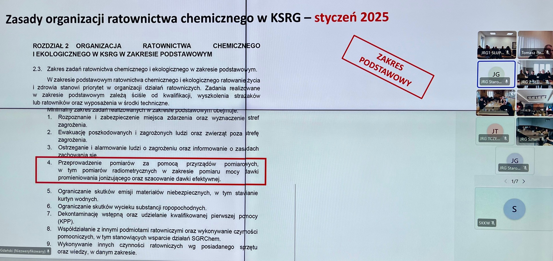 W dniach 25 - 27 listopada 2025 r. w Jednostkach Ratowniczo – Gaśniczych oraz w Stanowiskach Kierowania woj. pomorskiego odbyło się kolejne szkolenie wideokonferencyjne w ramach doskonalenia zawodowego. W trzydniowych zajęciach wzięło udział łącznie 841 osób, a ich głównym tematem była „Radiacja - wykorzystanie sprzętu dozymetrycznego”.