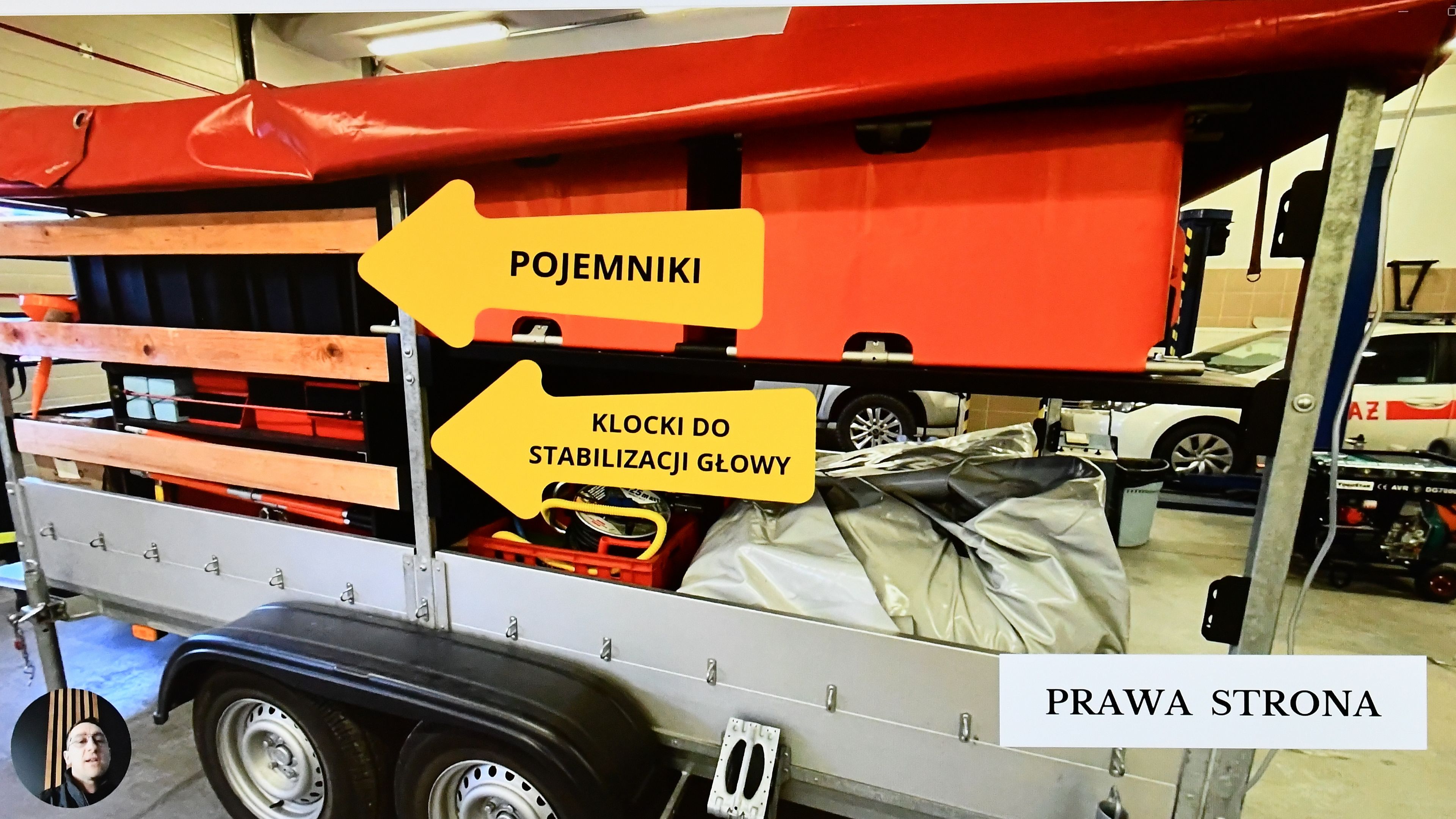 Podczas zajęć omówiono sprzęt znajdujący się na przyczepce medycznej, możliwości jego wykorzystania oraz omówiono organizację terenu akcji i zasad segregacji poszkodowanych „TRIAGE”.