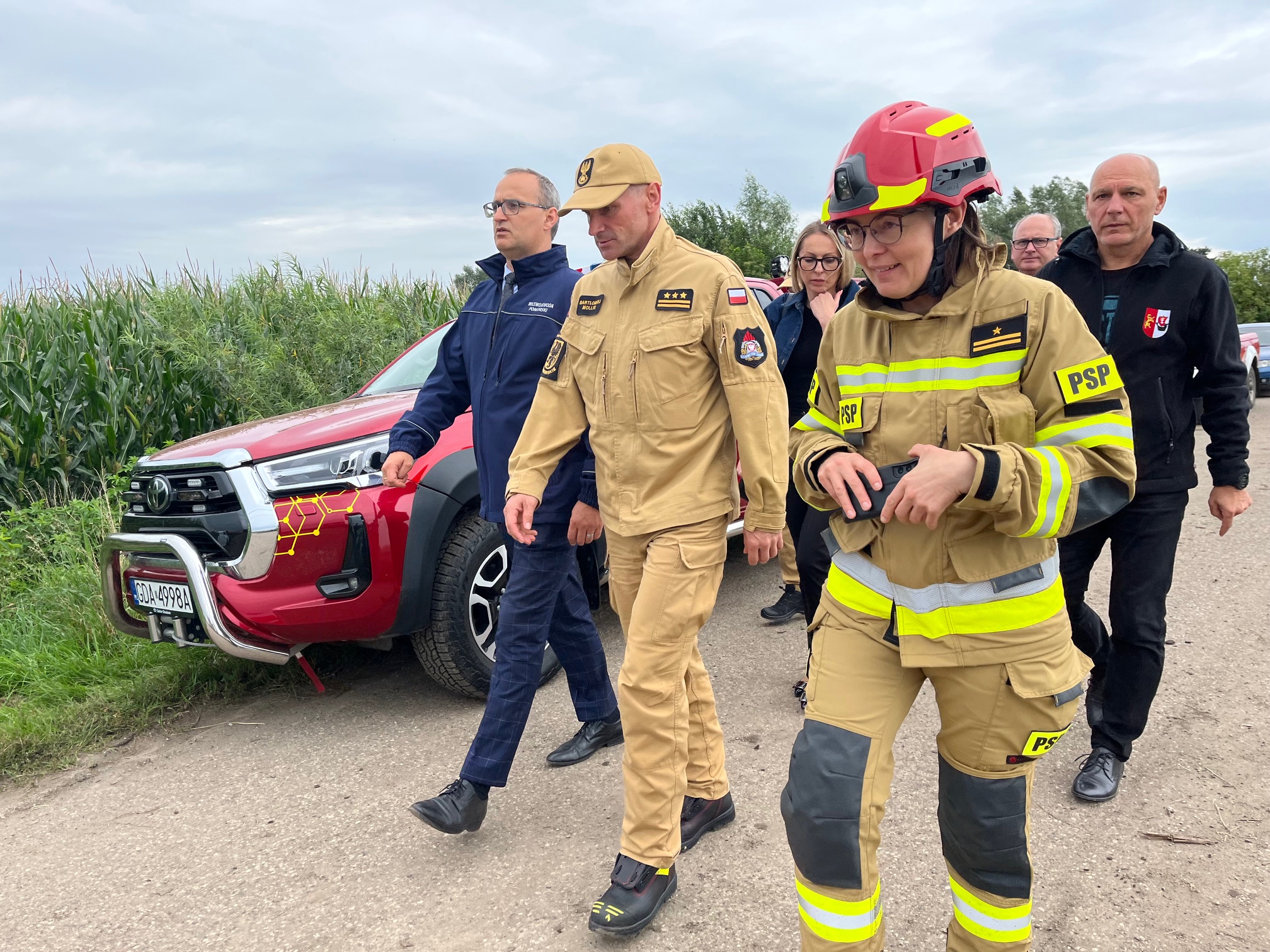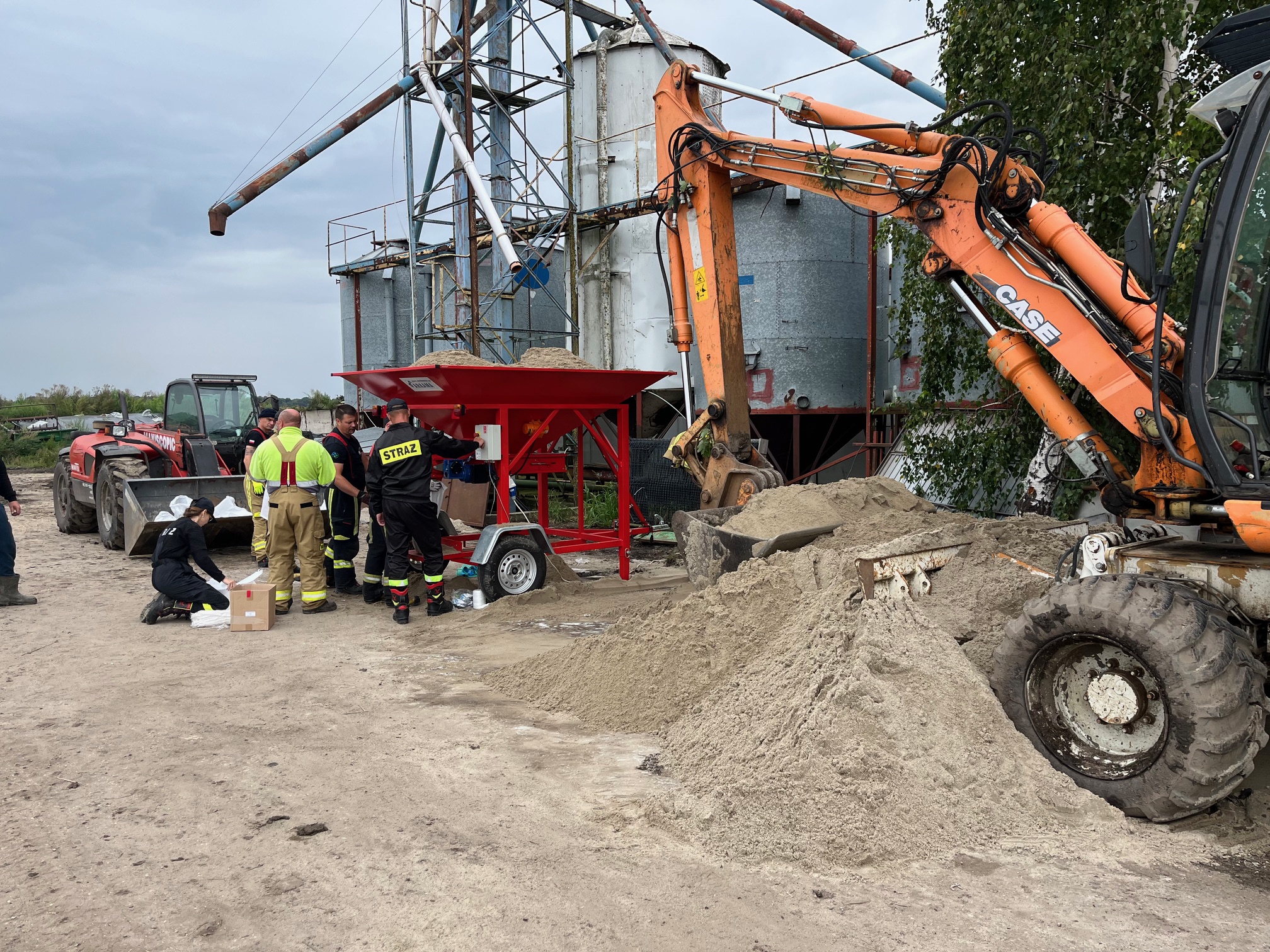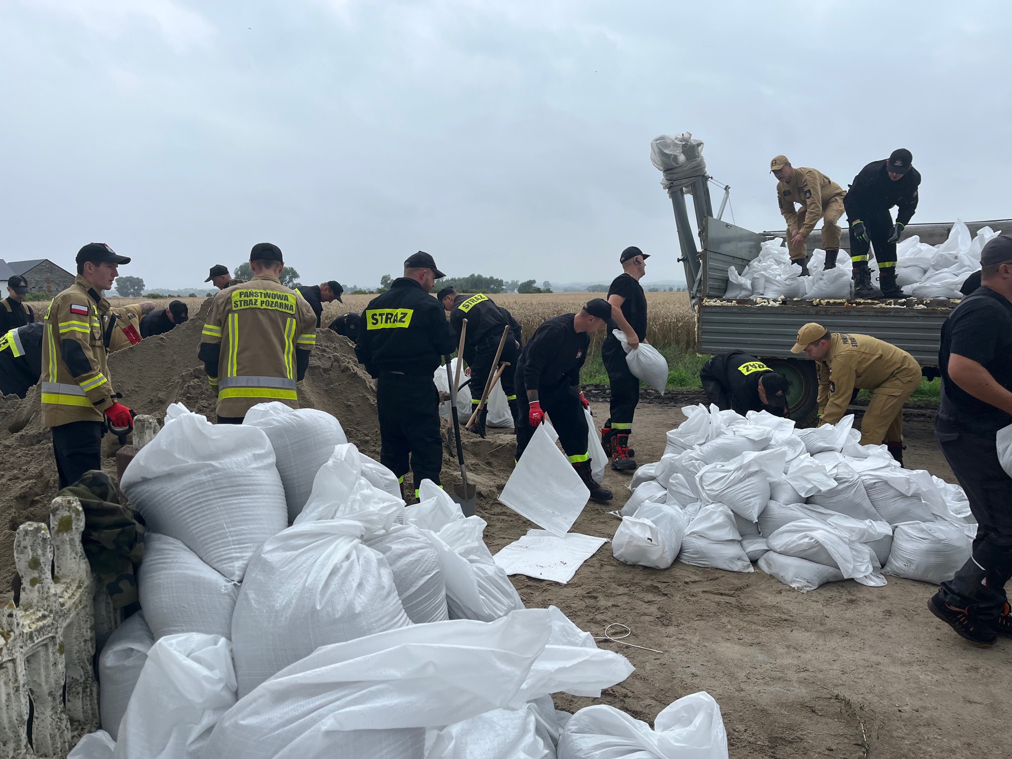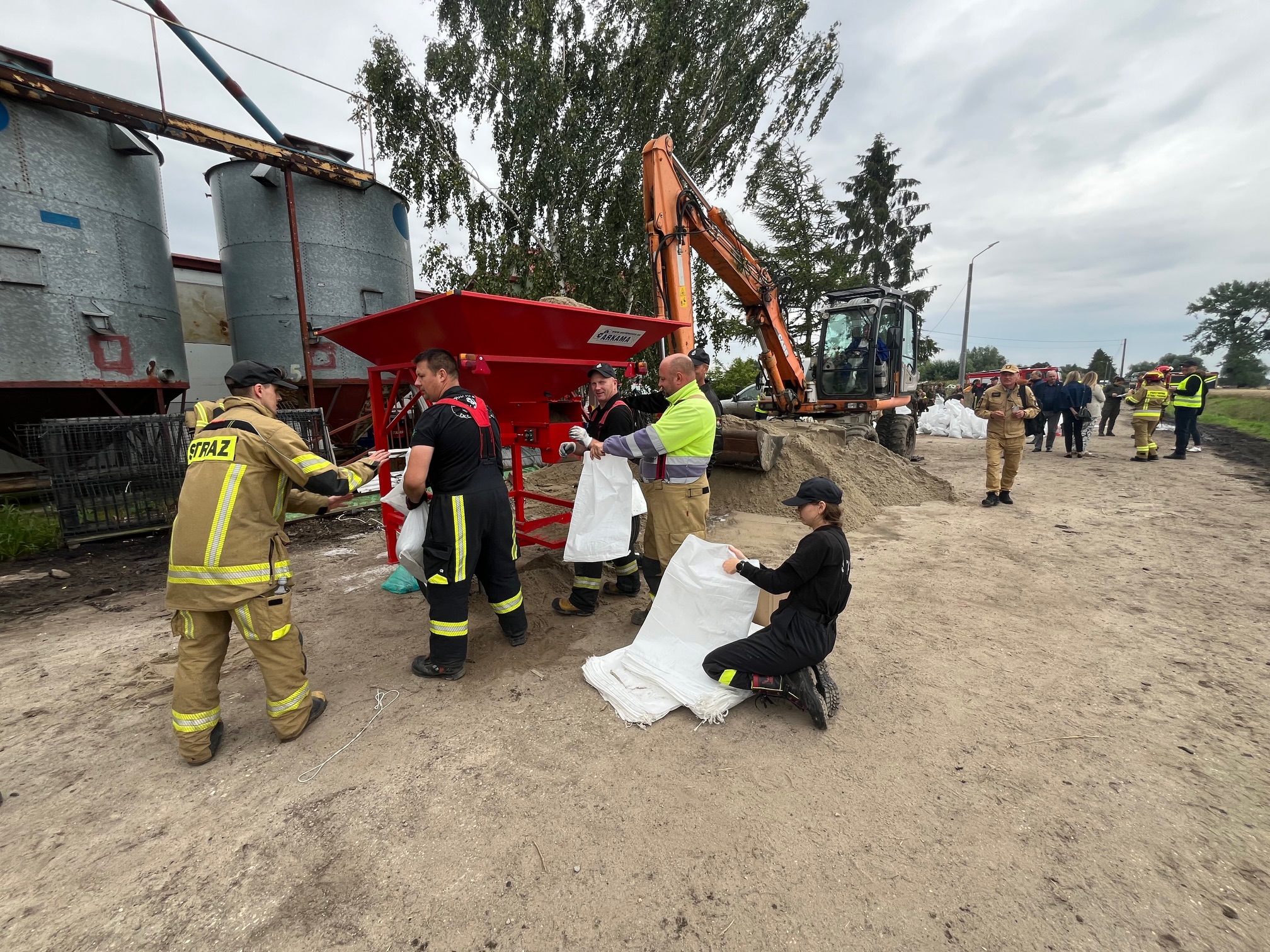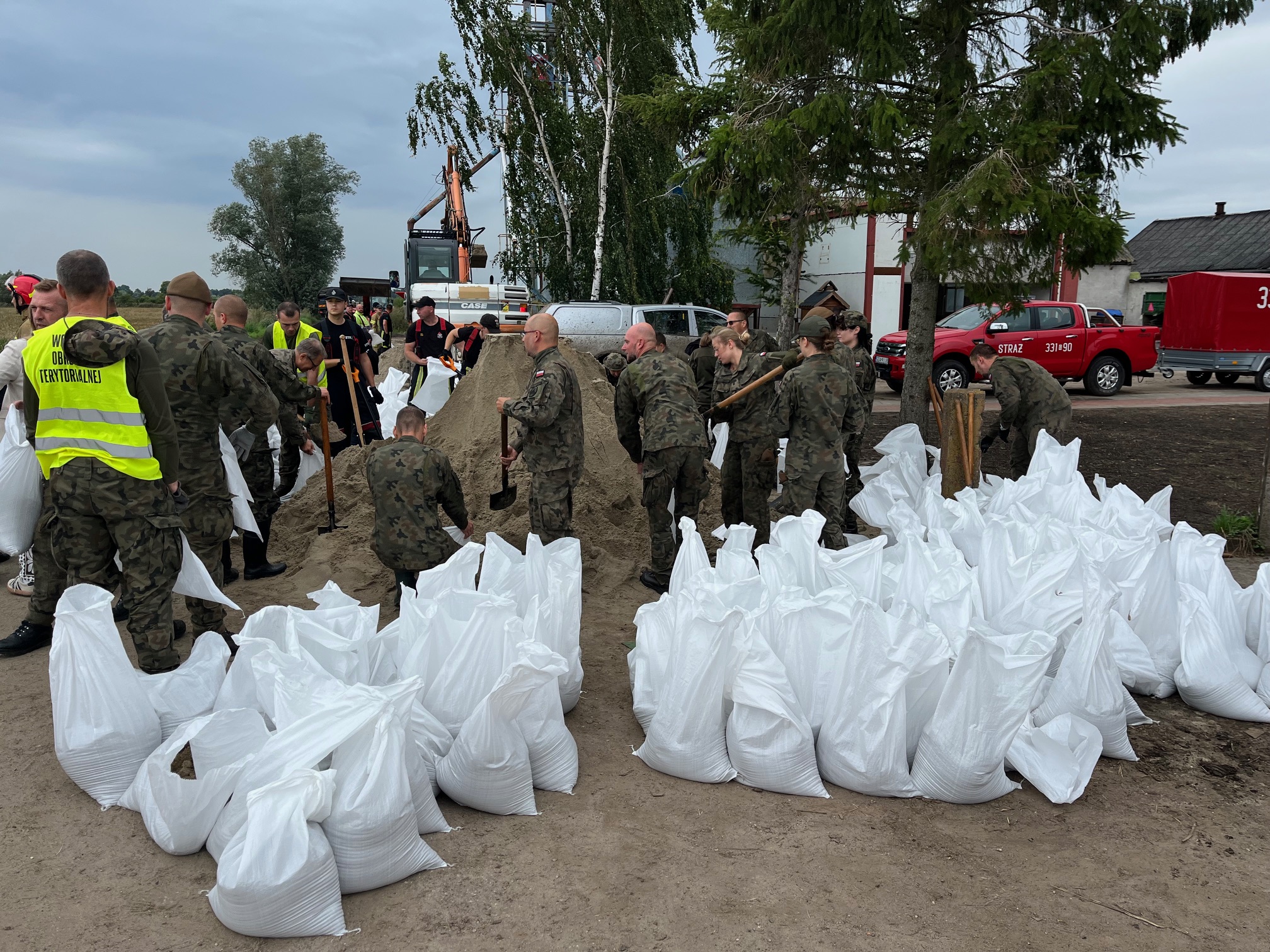 Działania pomorskich strażaków przy wzmacnianiu wału przeciwpowodziowego