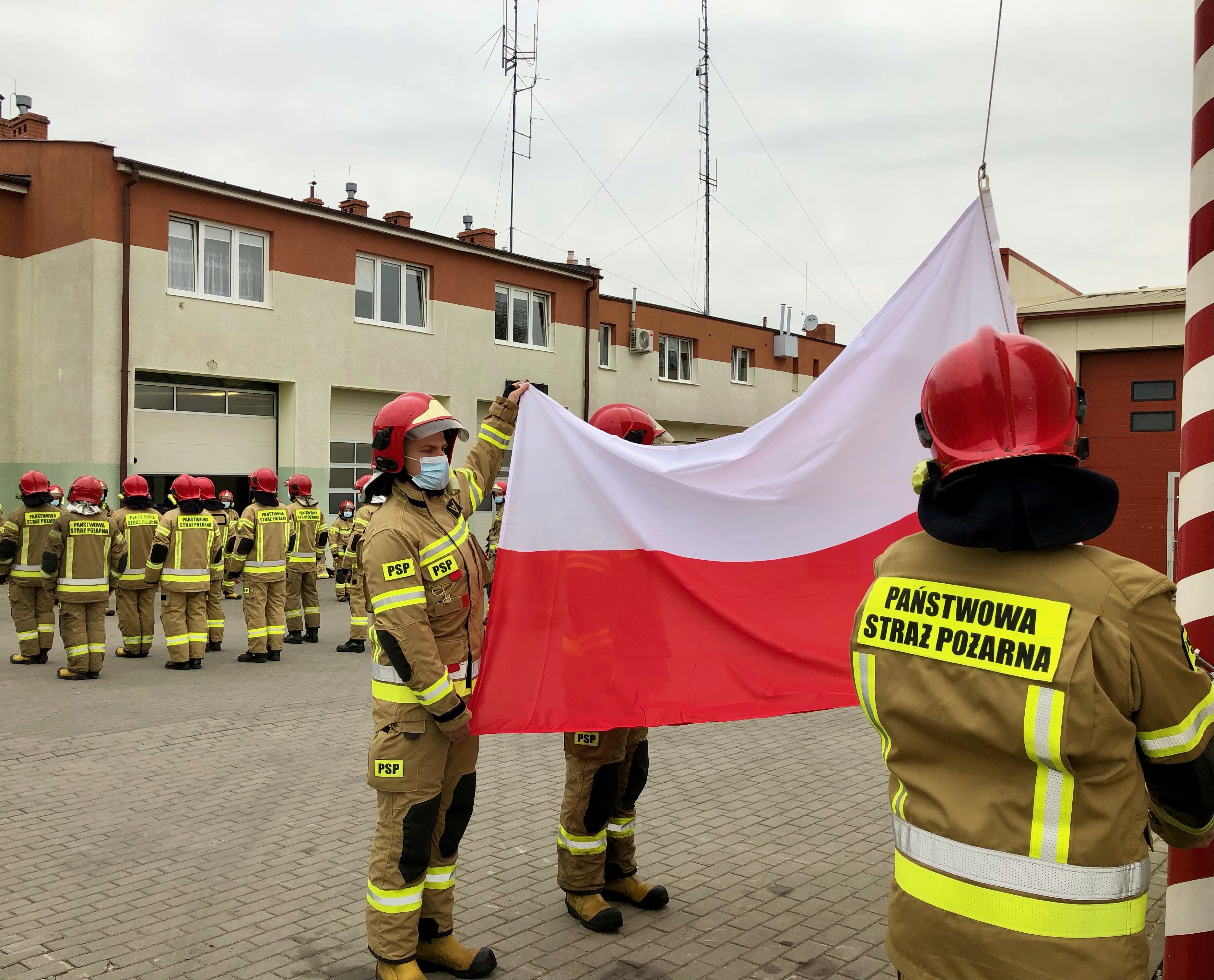 Uroczyste podniesienie flagi państwowej na maszt w jednostkach organizacyjnych PSP na terenie województwa pomorskiego.