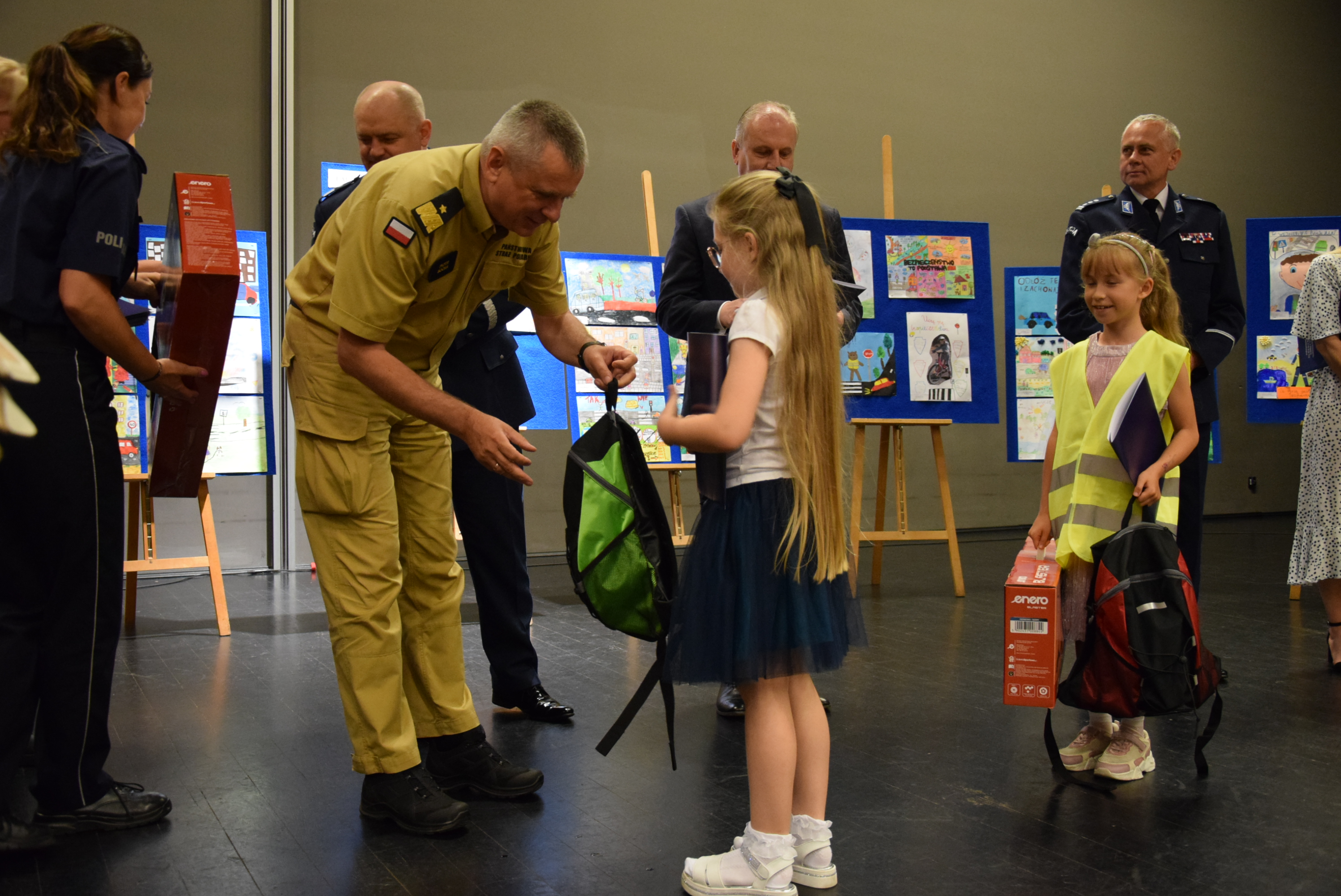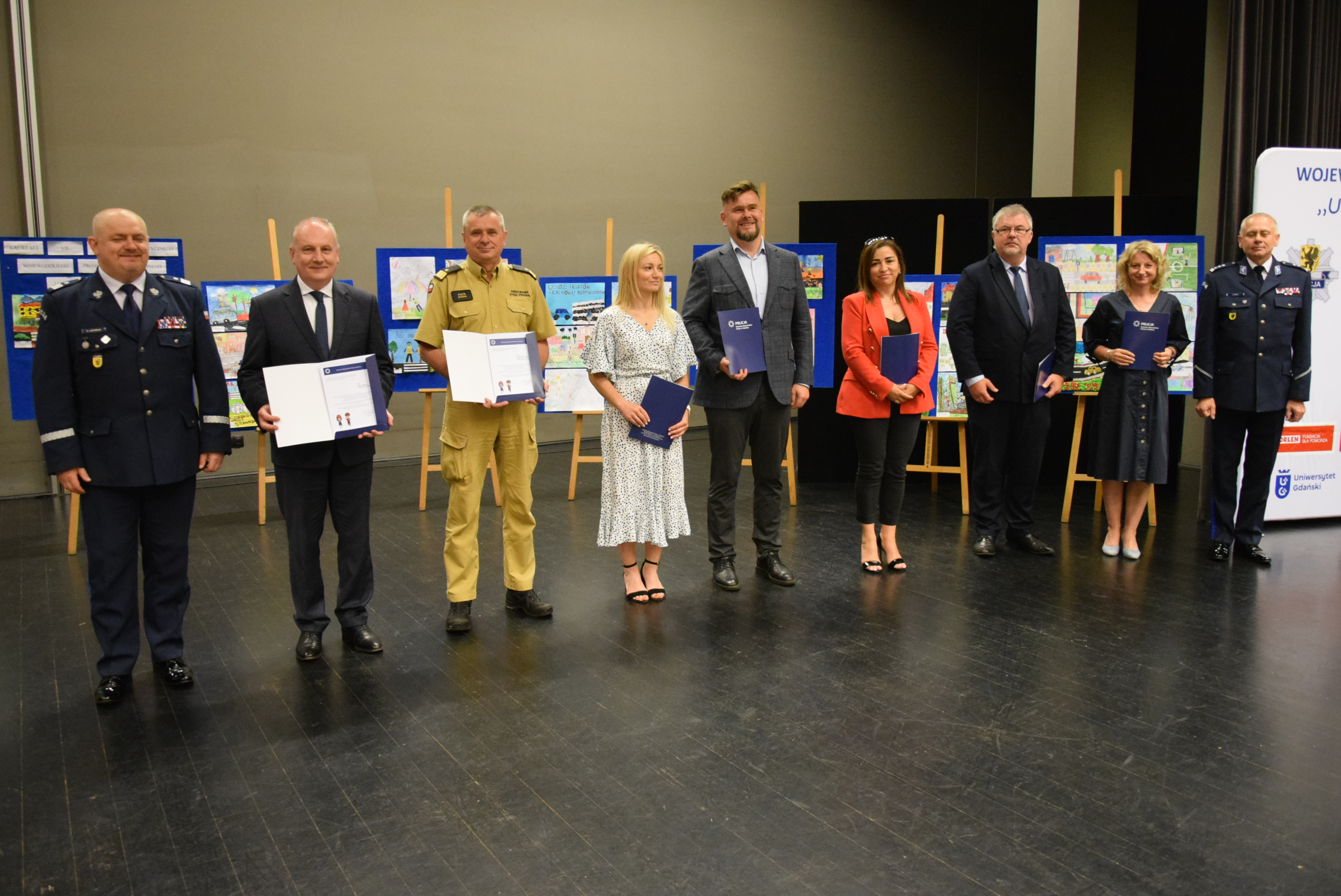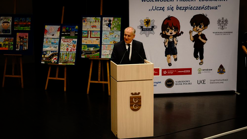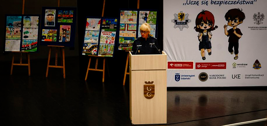 Na zakończenie spotkań edukacyjno-profilaktycznych w ramach wszystkich siedmiu obszarów zagadnieniowych dzieci przygotowały prace plastyczne, które w realny sposób odzwierciedlają zdobytą przez nich wiedzę w zakresie bezpieczeństwa w poszczególnych obszarach tematycznych. W trakcie uroczystej gali laureatom konkursu plastycznego wręczone zostały nagrody i dyplomy. Uczniowie przyjęli gratulację z rąk Komendanta Wojewódzkiego Policji w Gdańsku oraz Wojewody Pomorskiego. Na zakończenie na scenie swój występ artystyczny zaprezentowali uczniowie ze Szkoły Podstawowej im. Kunegundy Pawłowskiej w Trąbkach Wielkich a całość wydarzenia swoim występem artystycznym uświetnił funkcjonariusz z Komendy Powiatowej Policji w Człuchowie. Nie zabrakło również maskotki pomorskiej Policji - słonia POPO, który jak zwykle wywołał uśmiech na twarzach najmłodszych.
