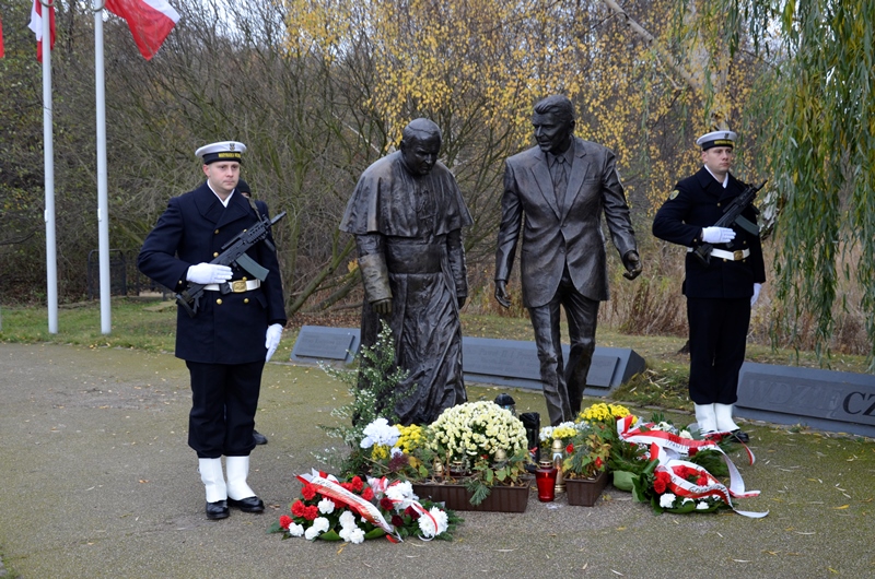 Uczestnicy obchodów złożyli kwiaty pod pomnikami Jana Pawła II, Ronalda Reagana na Pomorzu oraz Marszłaka Józefa Piłsudskiego w Gdańsku.