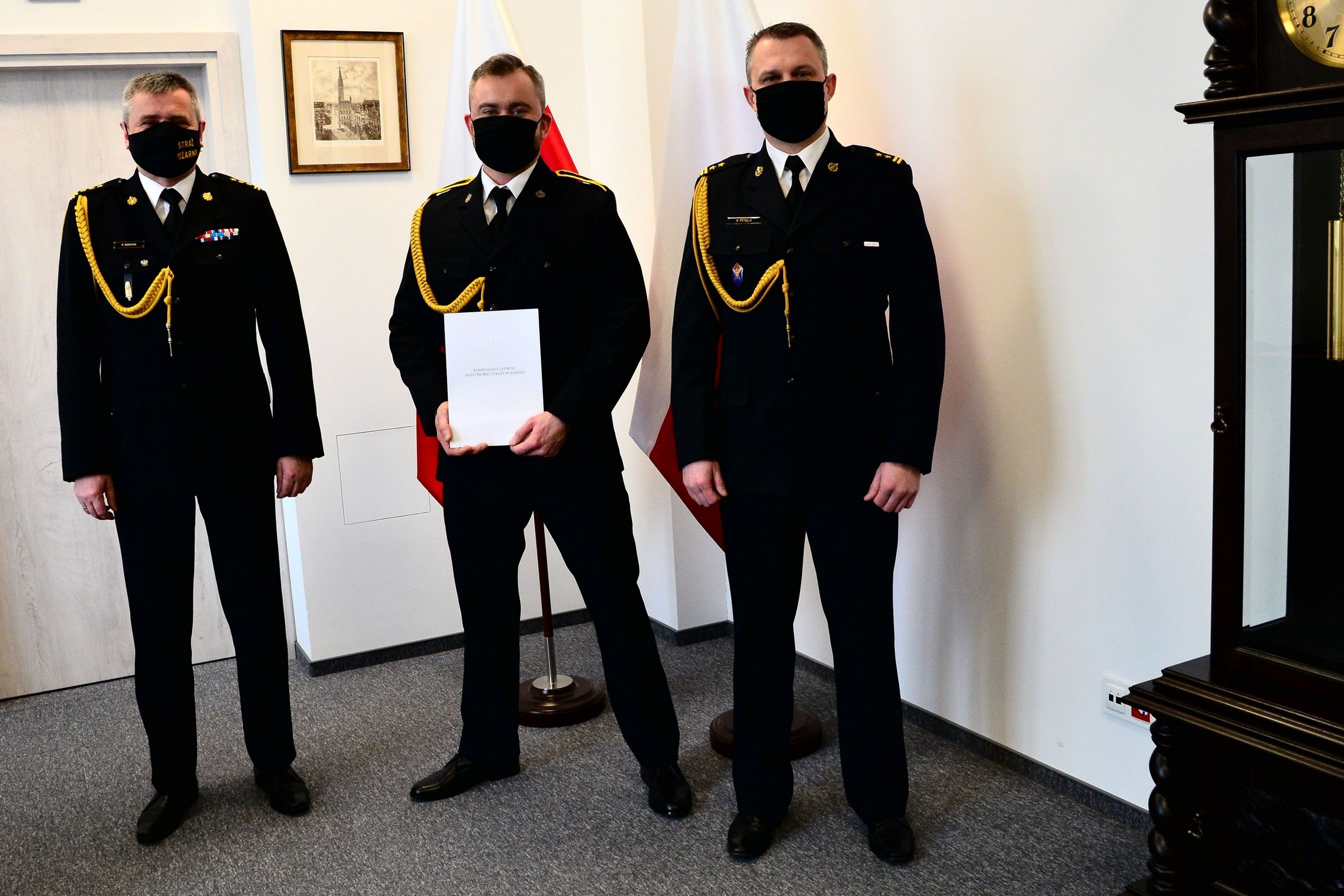 Pomorski komendant wojewódzki PSP st. bryg. Piotr Socha w imieniu komendanta głównego PSP nadbryg. Andrzeja Bartkowiaka wręczył ogn. Bartłomiejowi Czochara, podziękowanie za determinację i zaangażowanie w pomoc poszkodowanym w pożarze budynku wielorodzinnego zlokalizowanego w Gdańsku w dniu 2 stycznia 2021 roku.