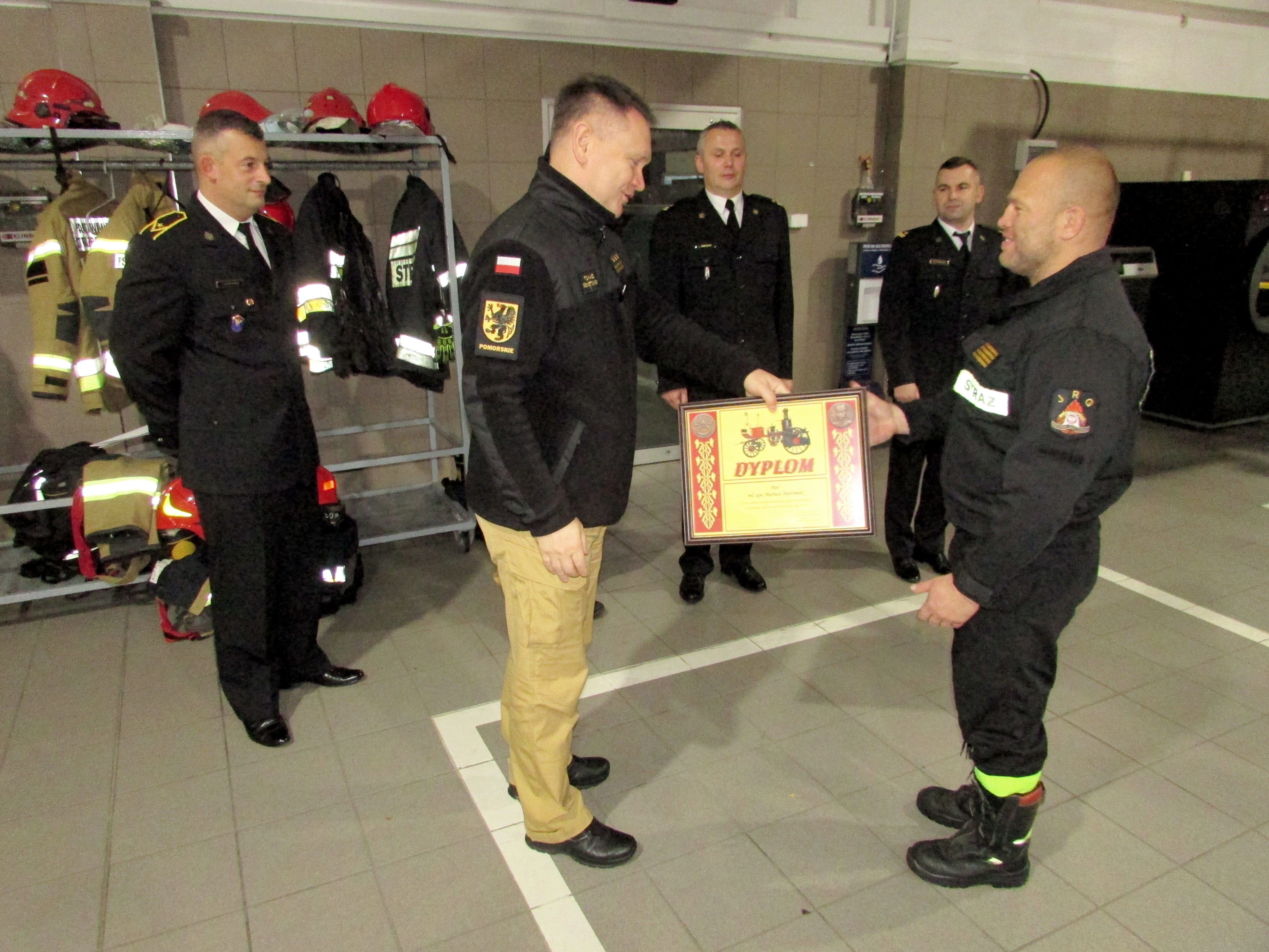 Zastępca pomorskiego komendant wojewódzki PSP st. bryg. Tomasz Siemiętowski w imieniu komendanta głównego PSP nadbryg. Andrzeja Bartkowiaka wręczył dyplom KG PSP mł. ogn. Mariuszowi Marciniakowi oraz listy gratulacyjne zmianie służbowej w podziękowaniu za szybkie udzielenie kwalifikowanej pierwszej pomocy dziecku w stanie zagrożenia życia w dniu 4 października 2021 roku.