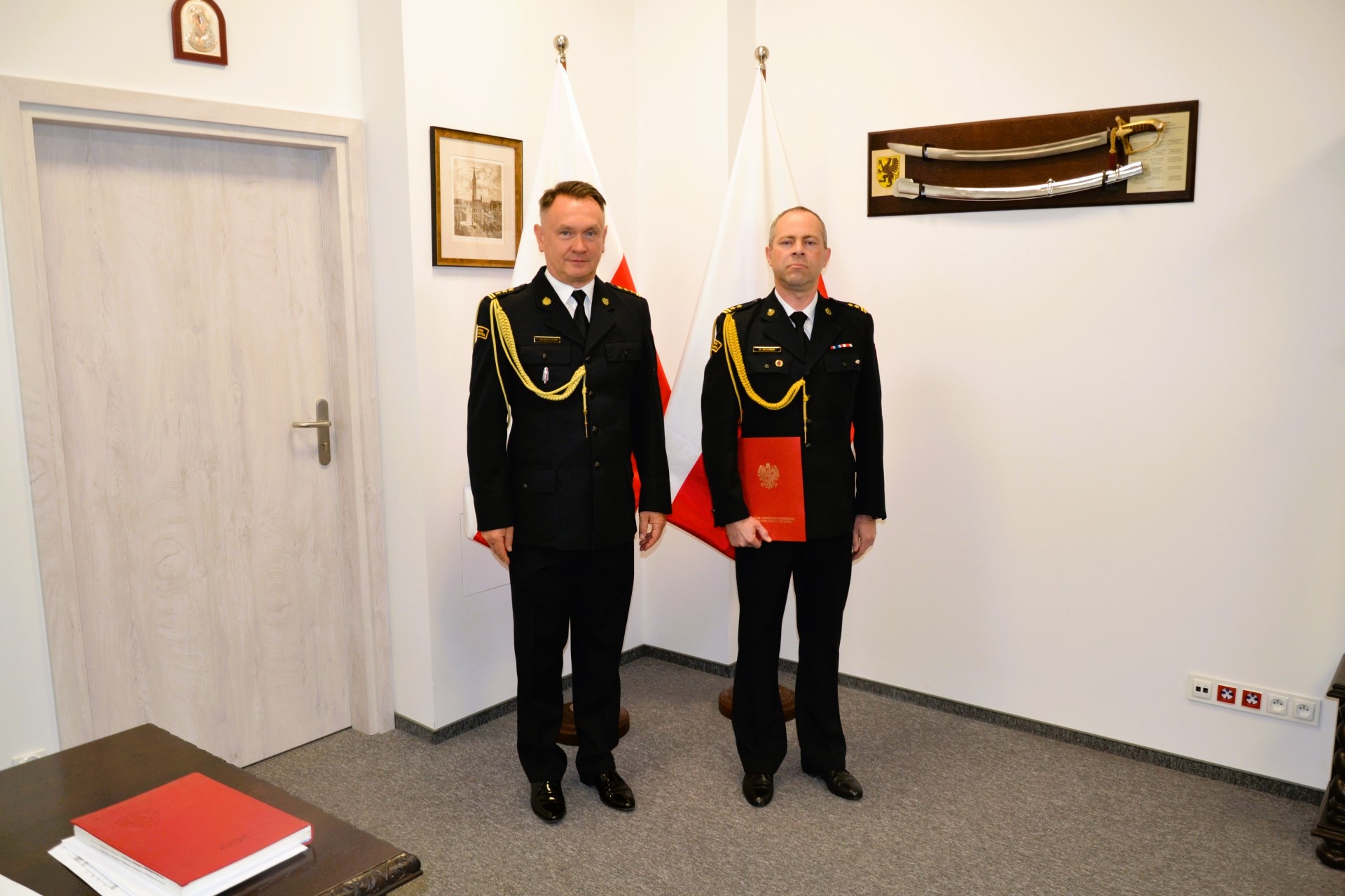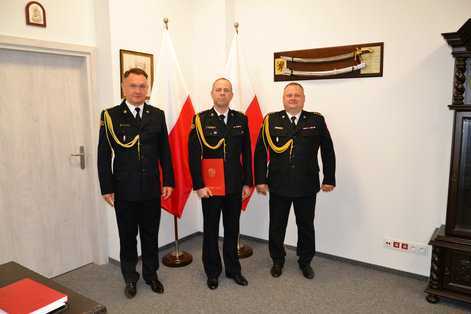 Zastępca pomorskiego komendanta wojewódzkiego Państwowej Straży Pożarnej stoi z trzema strażakami. Funkcjonariusz w środku trzyma czerwoną teczkę.