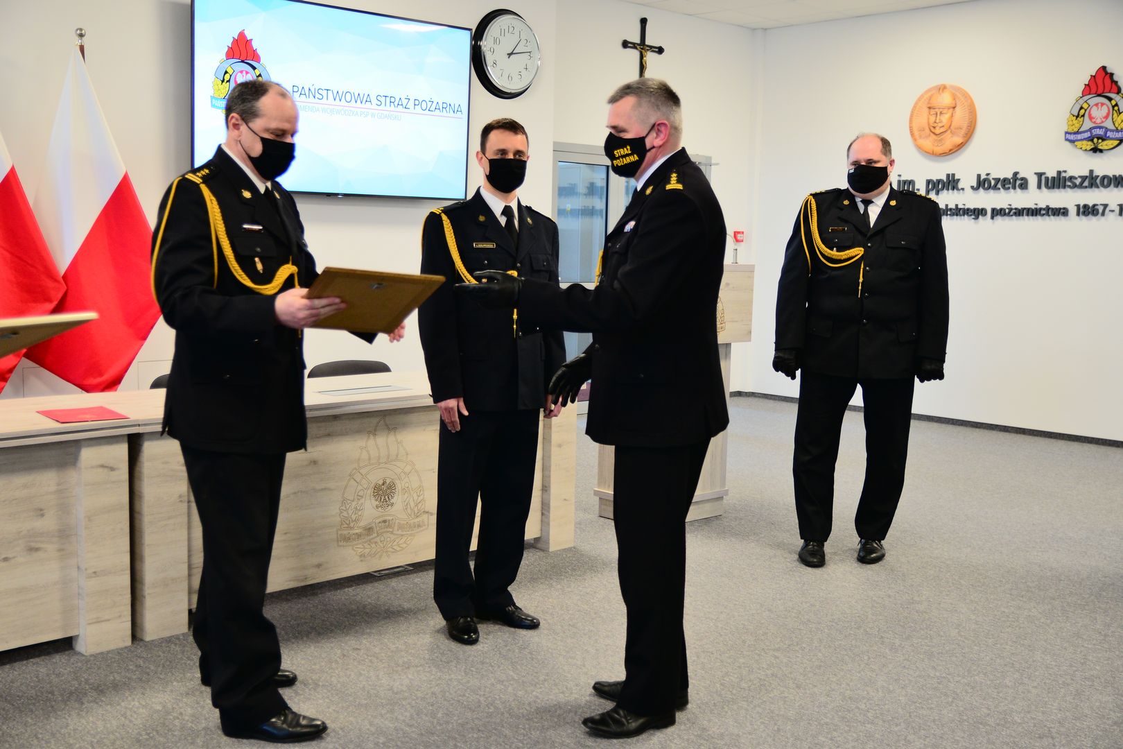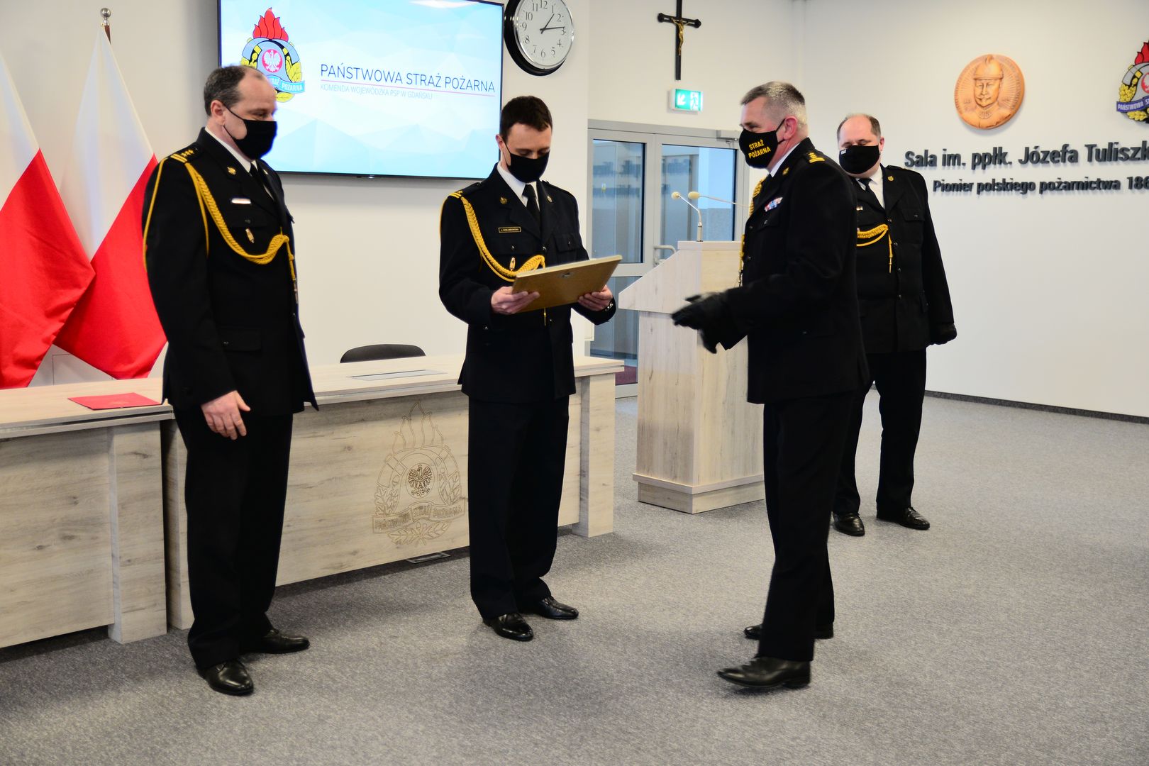 Następnie pomorski komendant wojewódzki PSP st. bryg. Piotr wspólnie z zastępcą pomorskiego komendanta wojewódkiego PSP st. bryg. Dariuszem Żywickim wręczyli funkcjonariuszom komendy przyznane przez ministra Spraw Wewnętrznych i Administracji Odznaki "Zasłużony dla Ochrony Przeciwpożarowej".