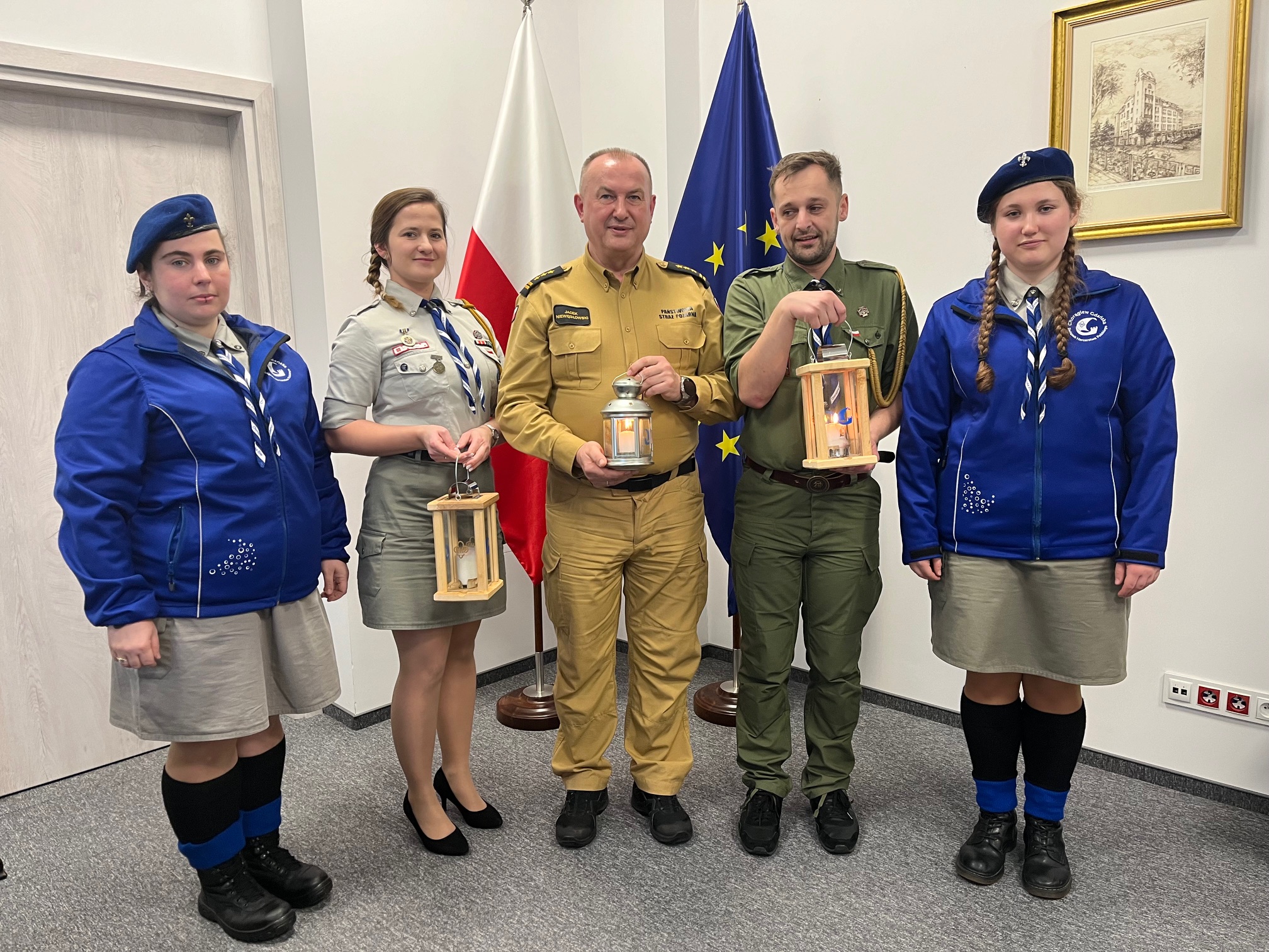 Komendant Chorągwi Gdańskiej ZHP hm. Łukasz Kochowski, skarbniczka hm. Katarzyna Musyt-Łanowska oraz zastępczyni komendanta hm. Anna Bąk wraz z członkami drużyny reprezentacyjnej naszej chorągwi przekazali Światło z Betlejem na ręce st. bryg. Jacka Niewęgłowskiego pomorskiego komendanta wojewódzkiego PSP.