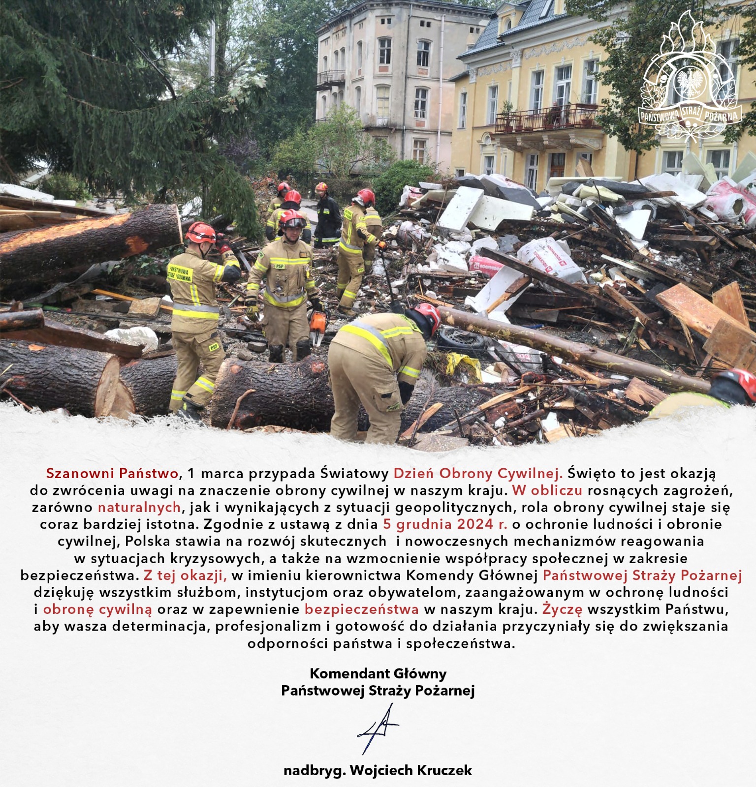W tym dniu w sposób szczególny warto przypomnieć, że od 1 stycznia 2025 roku obowiązuje ustawa, która tworzy nowoczesny, kompleksowy, całodobowy system ochrony ludności i obrony cywilnej w naszym kraju. Z tej okazji komendant główny PSP nadbryg. Wojciech Kruczek pragnie złożyć wszystkim życzenia.