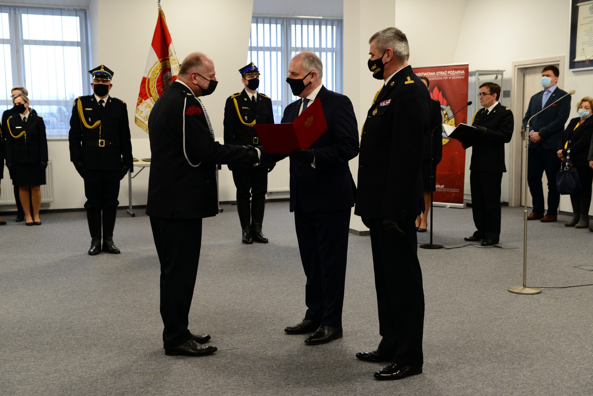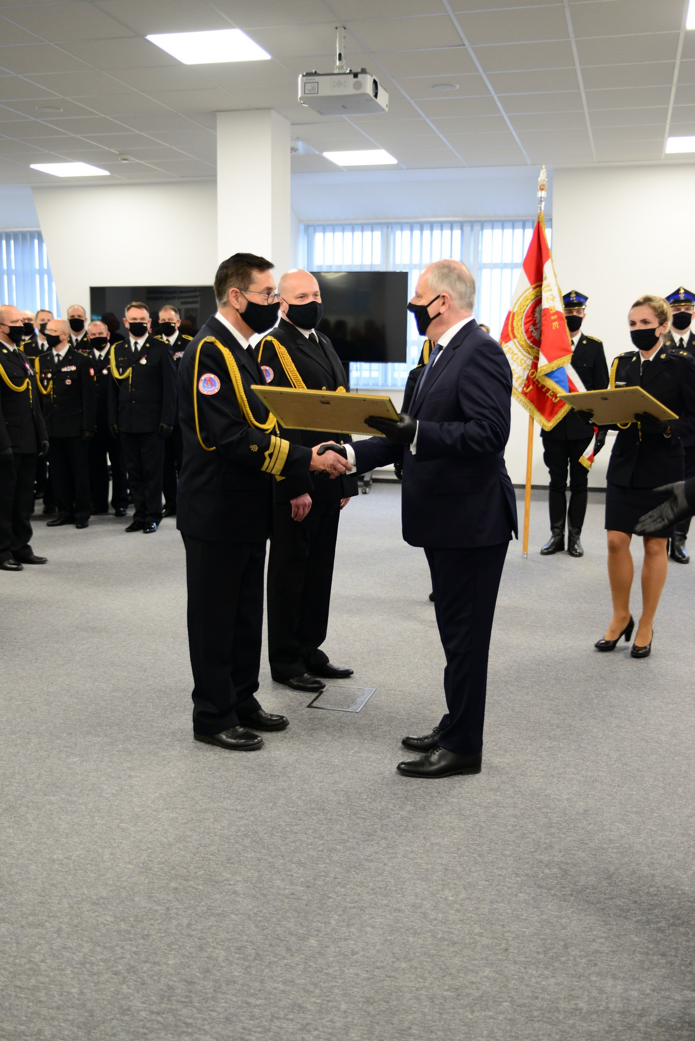 Kolejnym punktem uroczystości było wręczenie "Dyplomów uznania Komendanta Głównego Państwowej Straży Pożarnej" dyrektorowi Portowej Straży Pożarnej "Florian" Zdzisławowi Olechnowiczowi oraz zastępcy dyrektora Portowej Straży Pożarnej "Florian" Karolowi Madej.