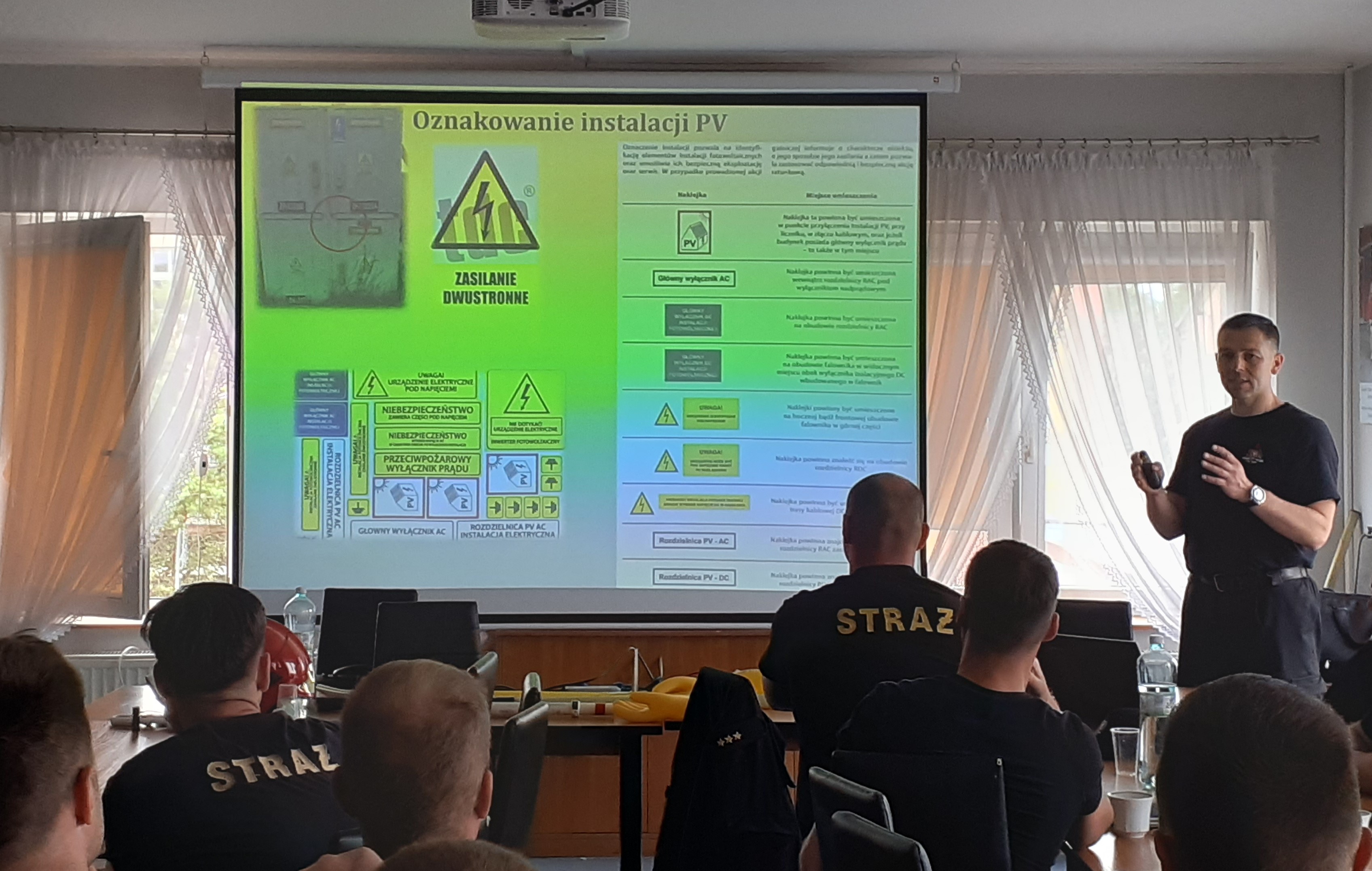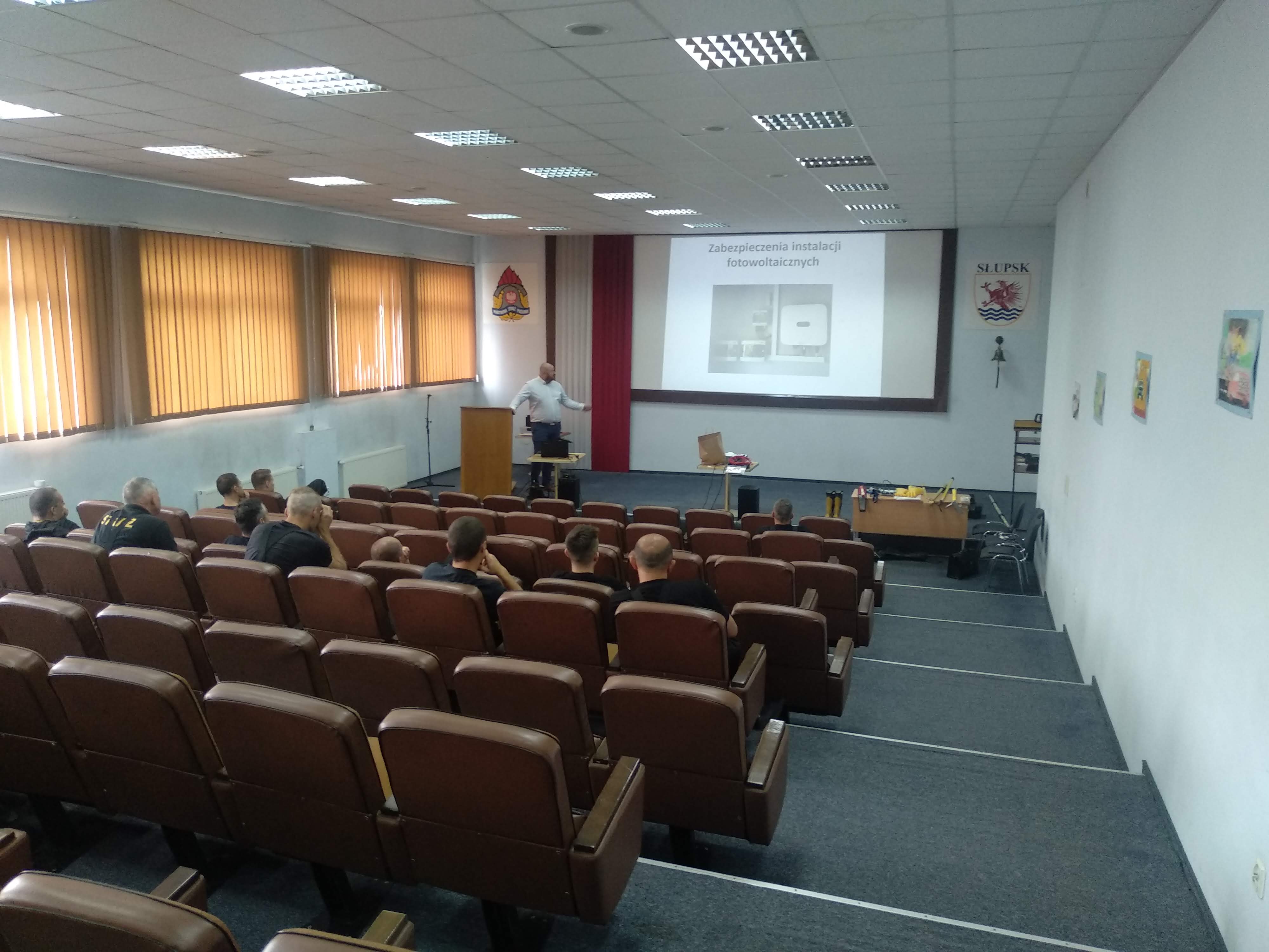 Prelekcję dotyczącą teorii PV, zasad doboru instalacji fotowoltaicznej, zabezpieczeń oraz praktycznych aspektów fotowoltaiki przygotował przedstawiciel Polskiej Grupy Paneli Fotowoltaicznych w Starogardzie Gdańskim Karol Rogoziński. Natomiast aspekty postępowania w czasie pożaru budynków z instalacją fotowoltaiczną omówił mł. bryg. Lech Boryła, naczelnik Ośrodka Szkolenia KW PSP w Słupsku.