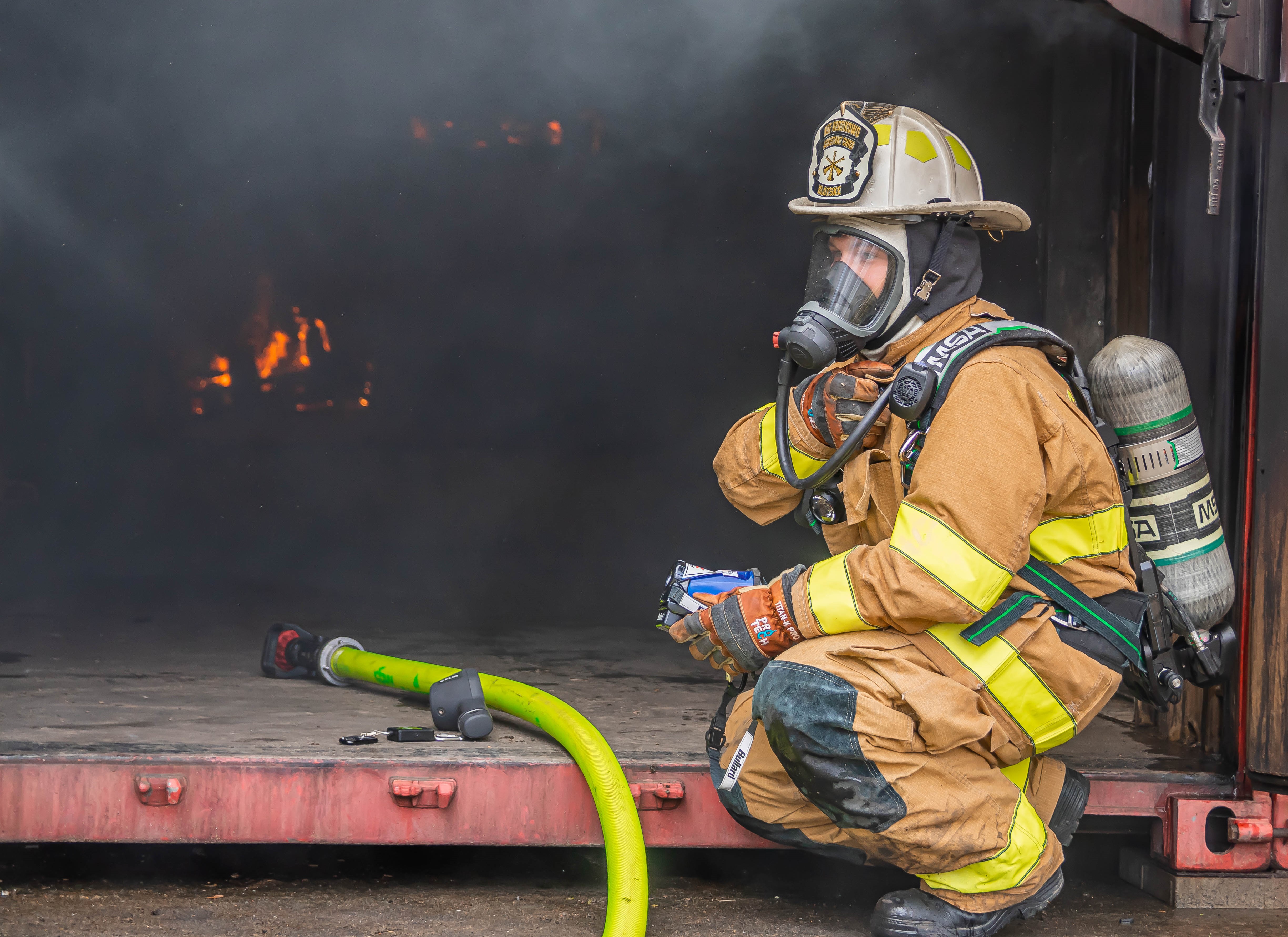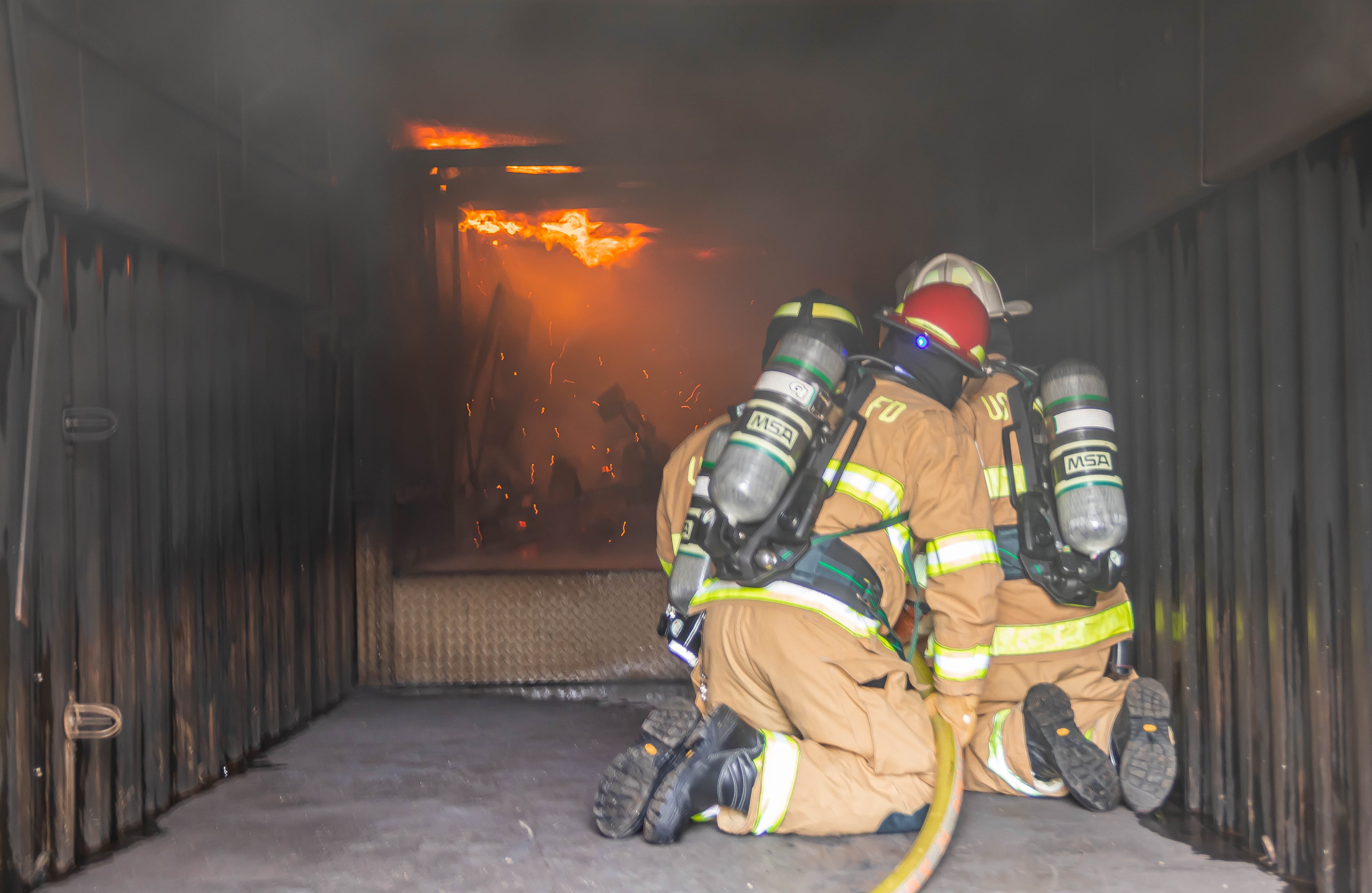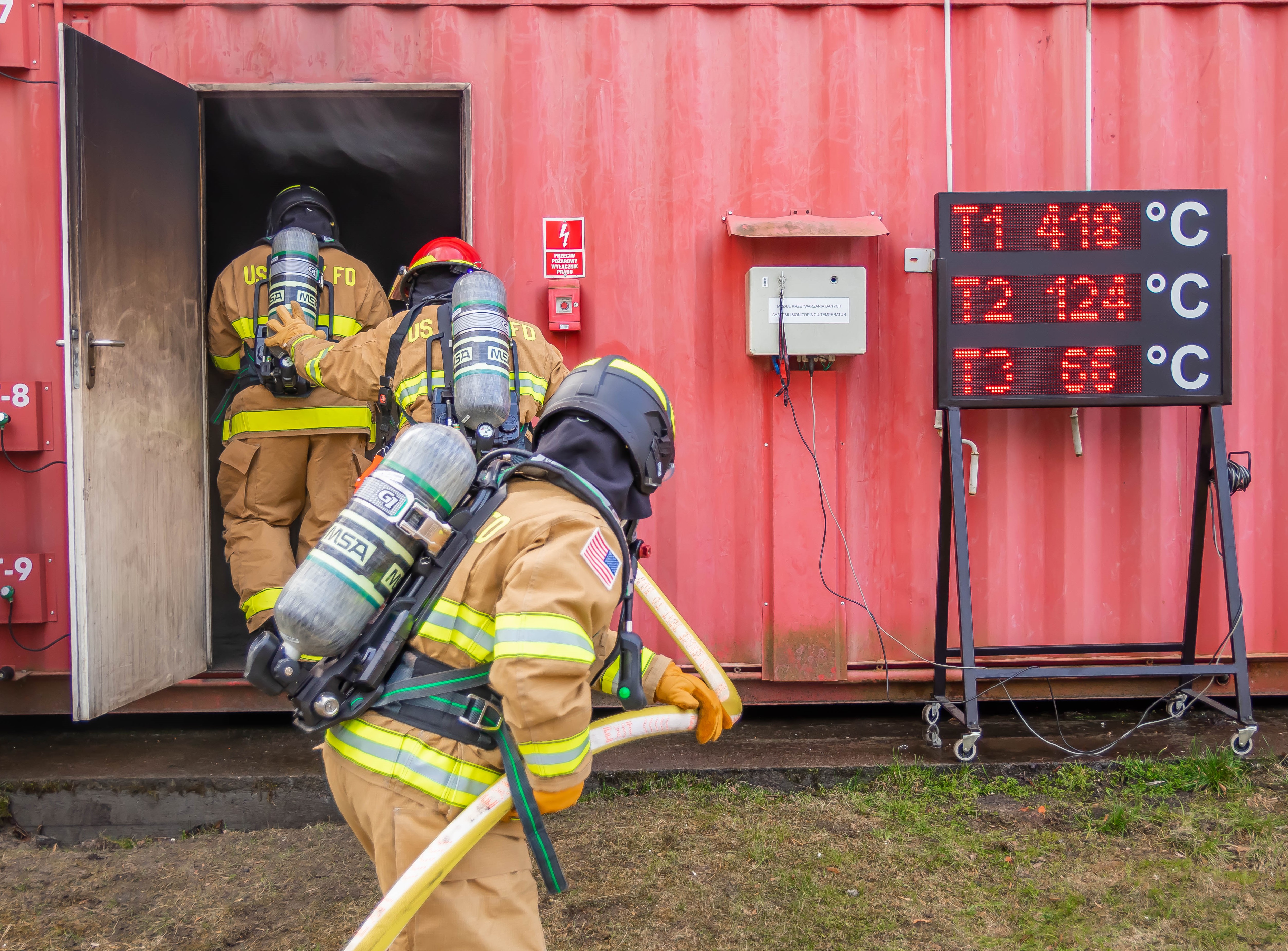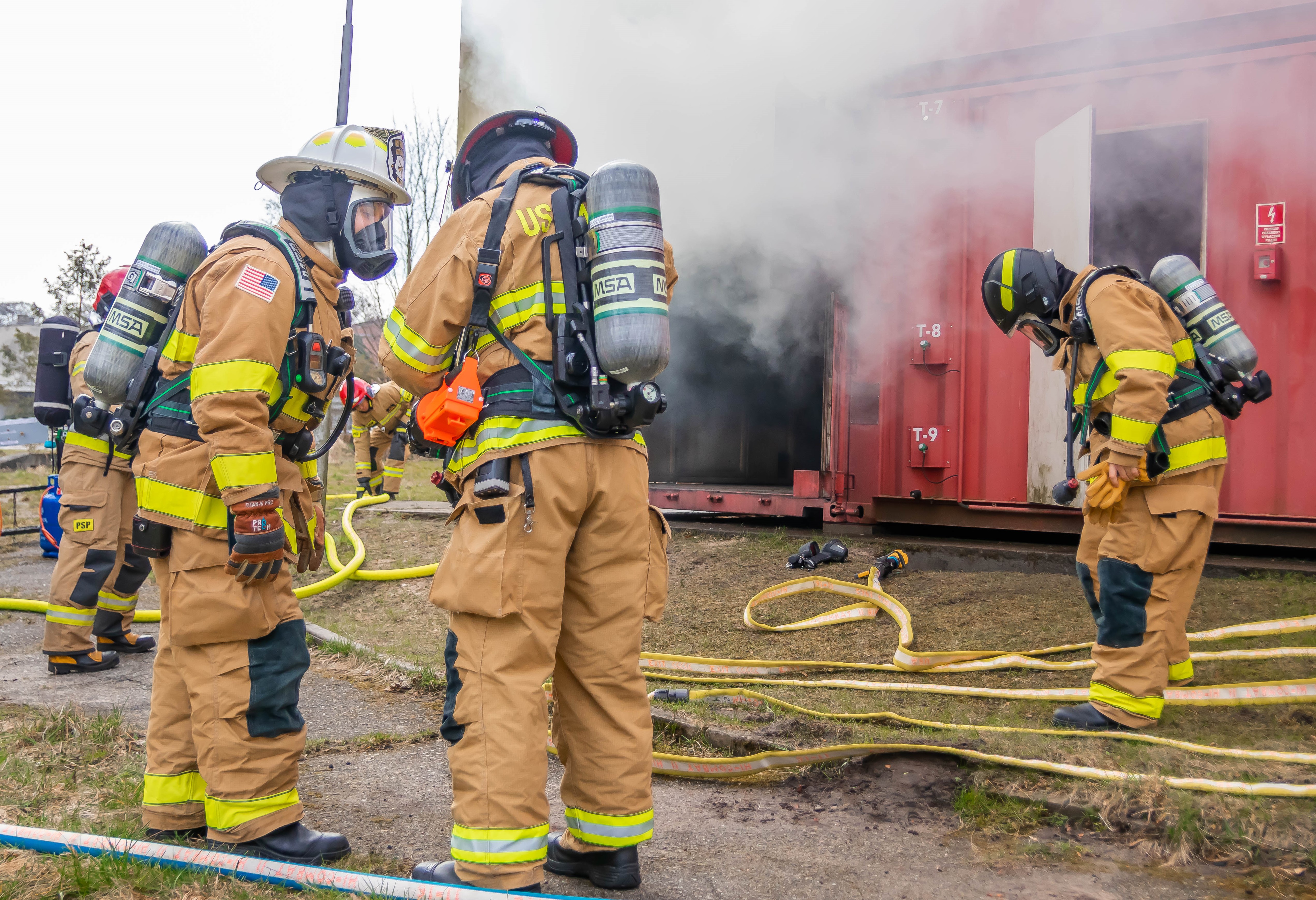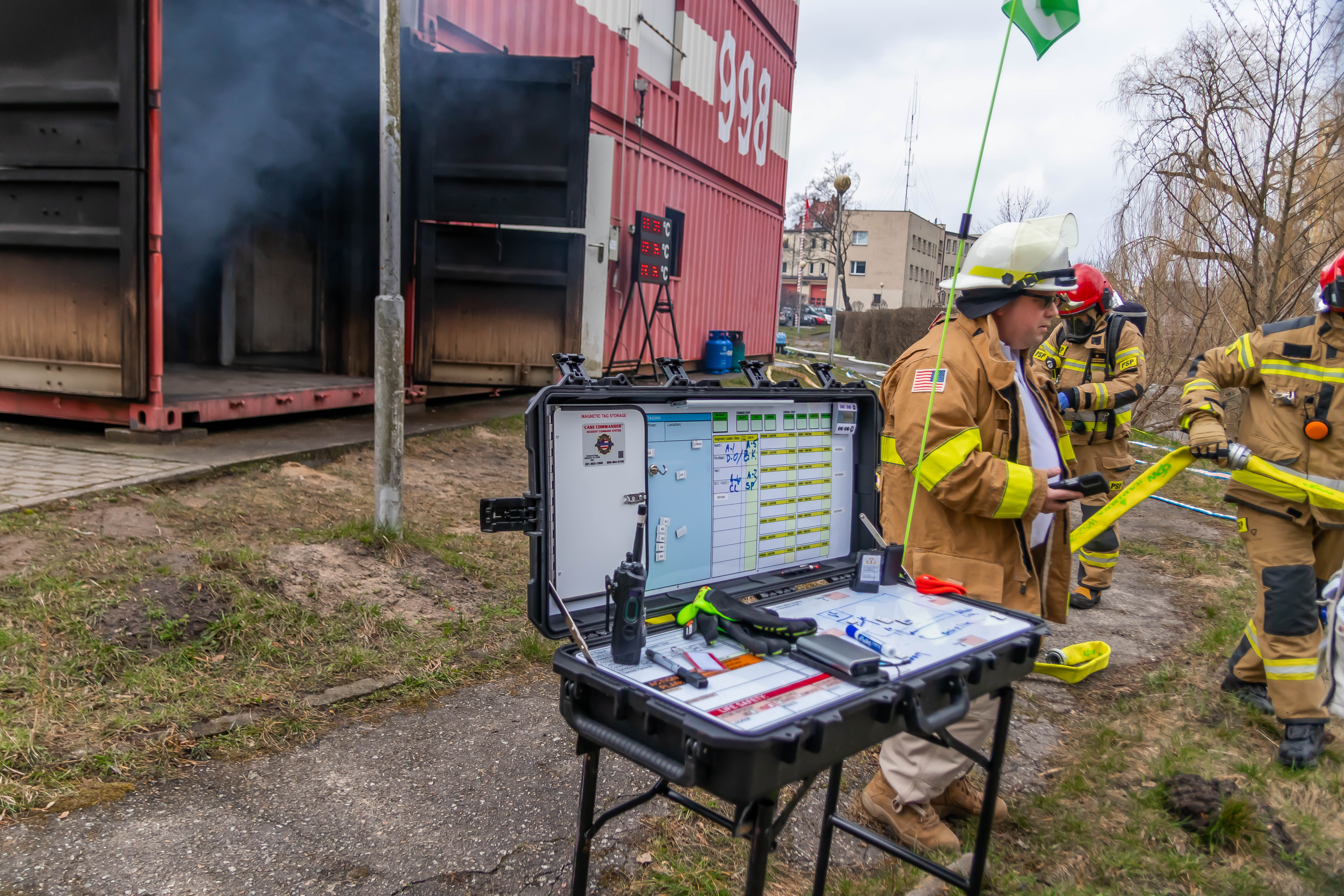 Jako obserwatorzy ćwiczeń amerykańskich strażaków zauważono wydzielone stanowisko kierującego ćwiczeniami. Dodatkowo bardzo ciekawym rozwiązaniem była budowa węża strażackiego oraz jego oznakowanie określające kierunek ewakuacji.