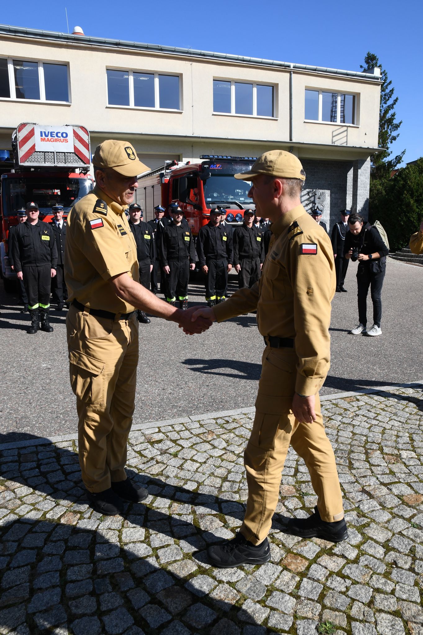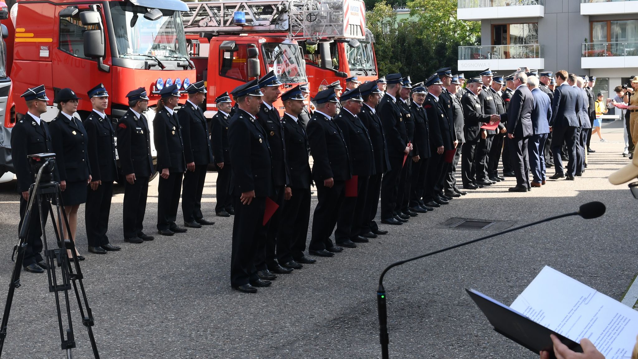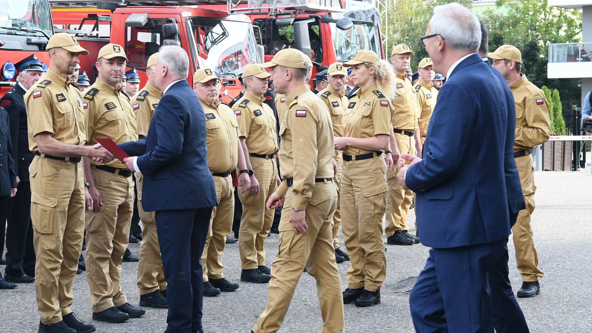 Wręczenie promes dla druhów OSP, przekazanie samochodów ratowniczych, kontenera sanitarnego oraz wsparcia finansowego dla strażaków PSP.
