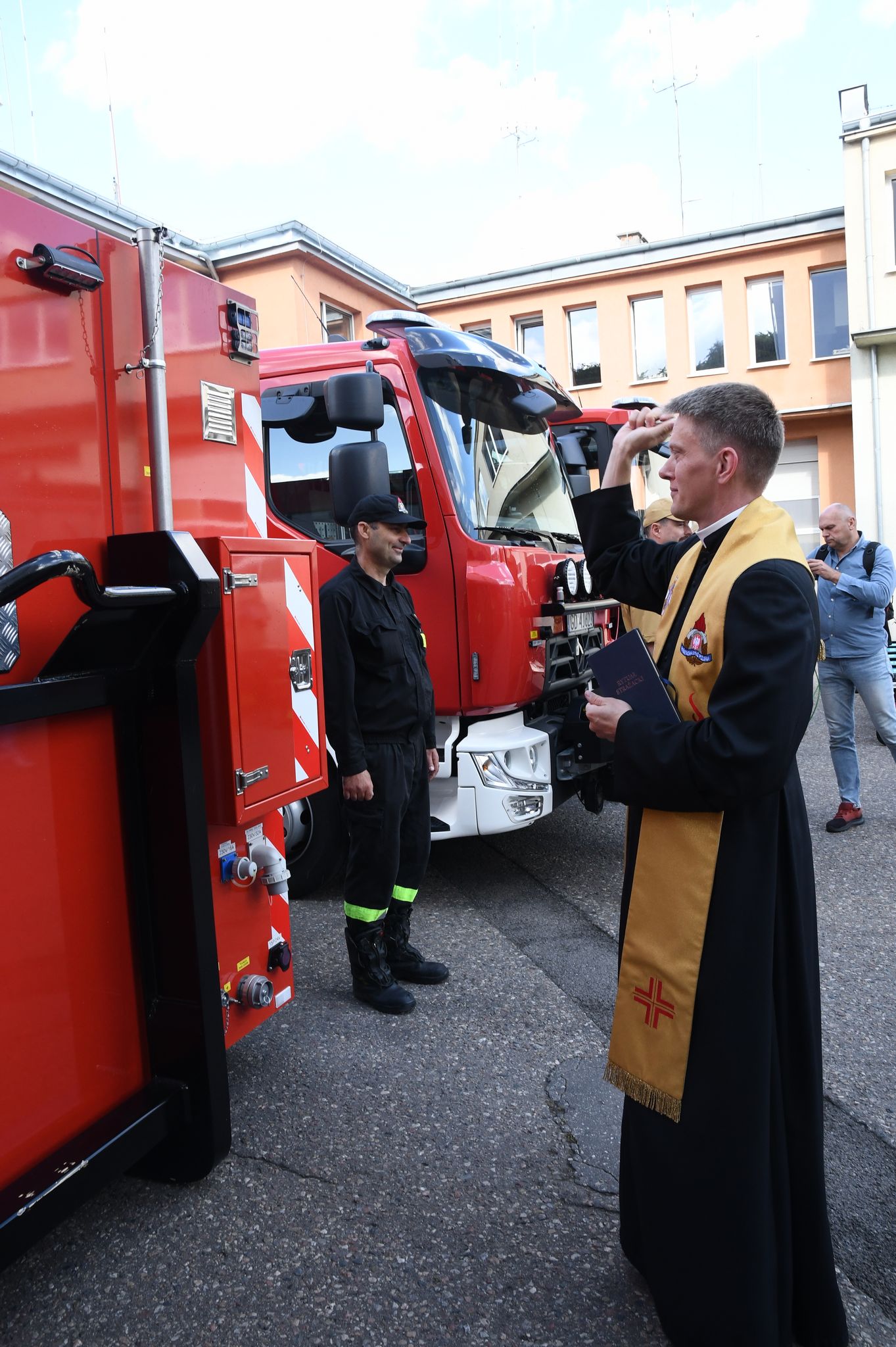 Kolejnym punktem uroczystości było wręczenie kluczyków do dwóch samochodów gaśniczych oraz kontenera sanitarnego dla Komendy Miejskiej PSP w Gdańsku. Łączna kwota zakupu to 3 886 800,00 zł.