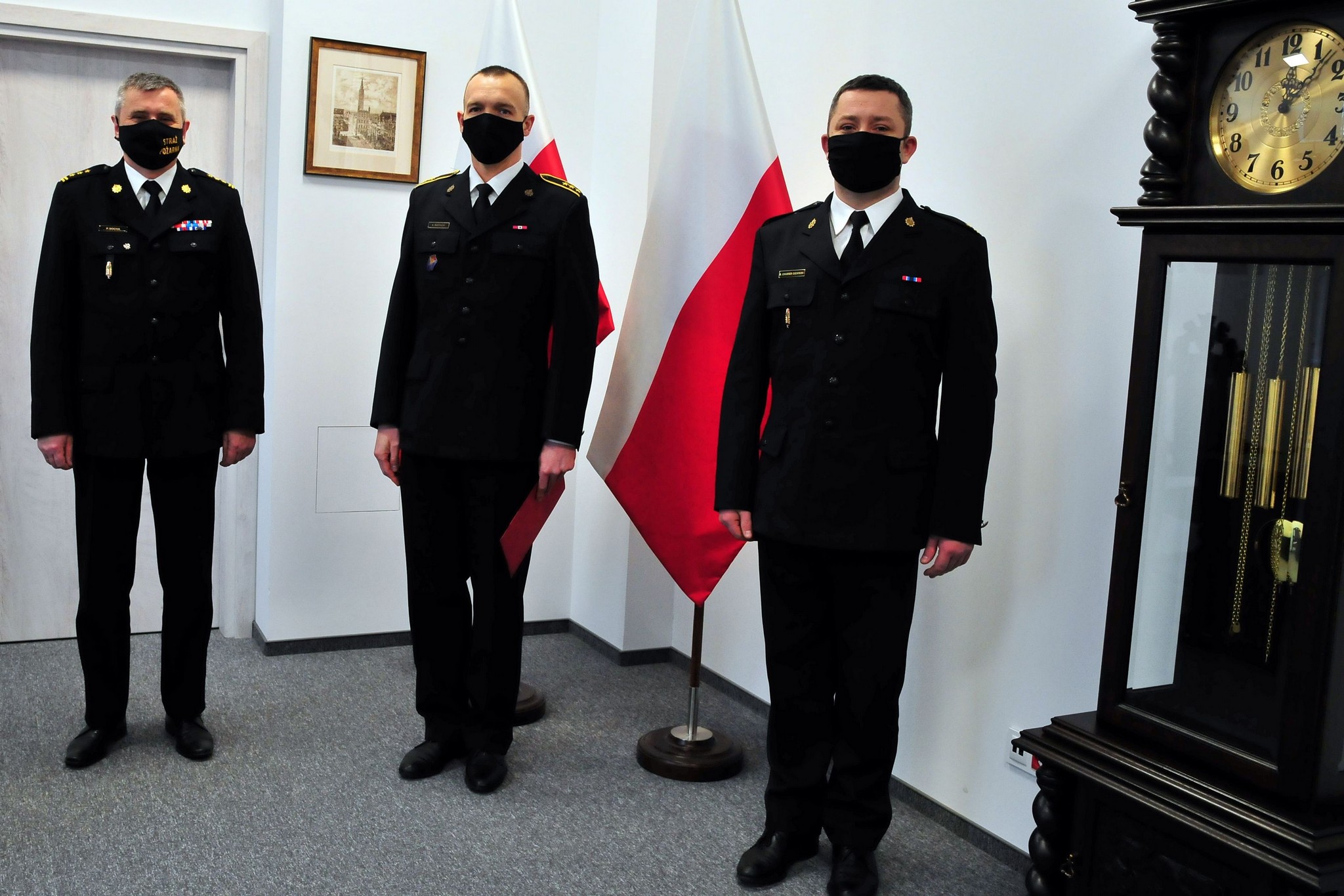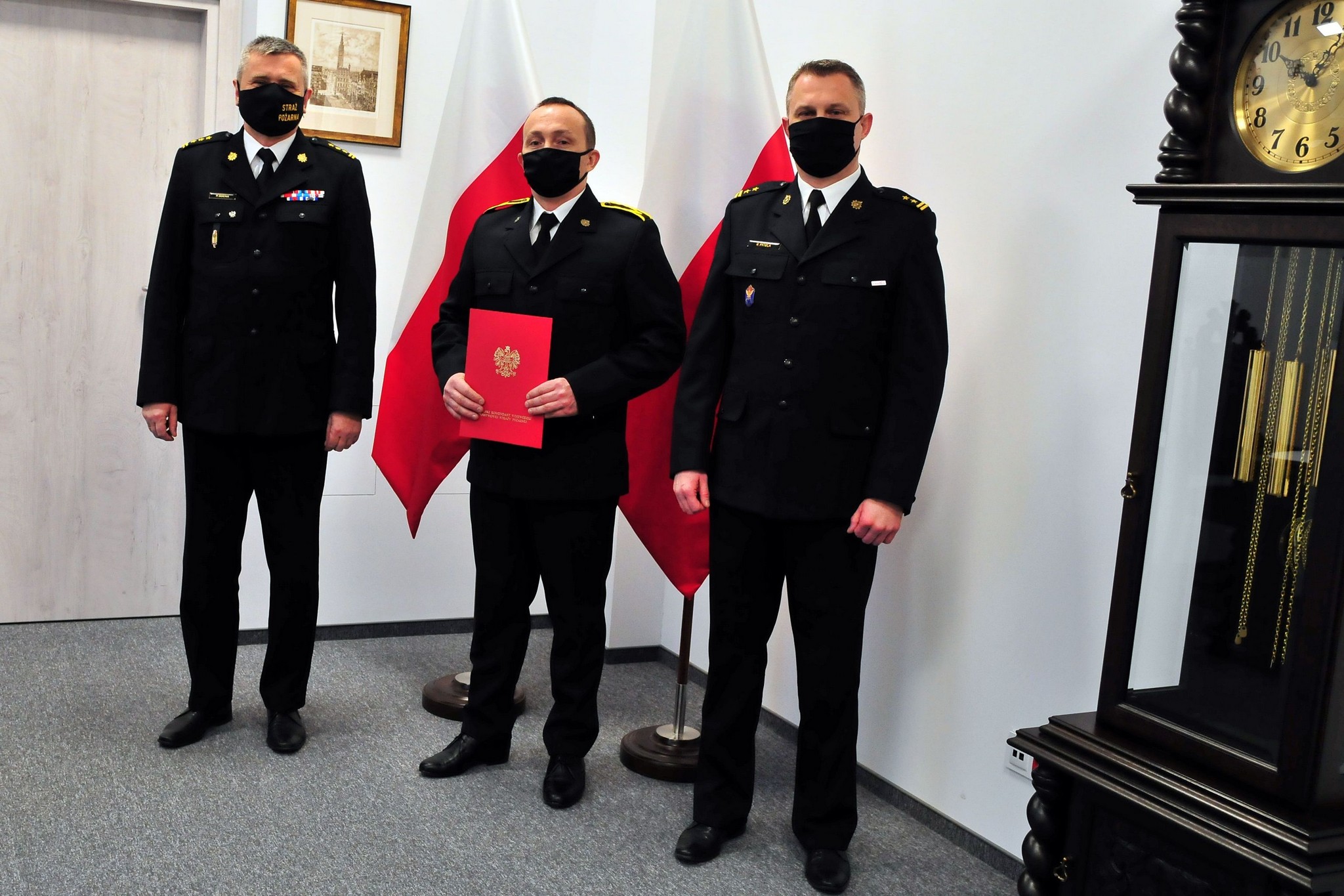 Pomorski komendant wojewódzki PSP st. bryg. Piotr Socha wraz z zastępcą pomorskiego komendanta wojewódzkiego PSP st. bryg. Tomaszem Siemiętowskim wręczyli funkcjonariuszom Państwowej Straży Pożarnej nagrody przyznnane przez ministra Spraw Wewnętrznych i Administracji za szczególne zaangażowanie w działania ratowniczo-gaśnicze.