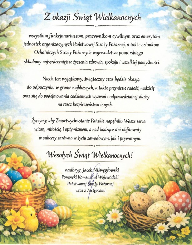 Z okazji Świąt Wielkanocnych publikujemy życzenia przekazane przez pomorskiego Komendanta Wojewódzkiego Państwowej Straży Pożarnej nadbryg. Jacka Niewęgłowskiego wraz z Jego Zastępcami.