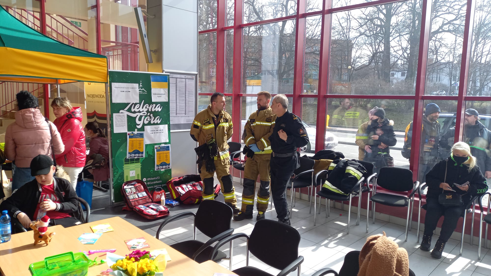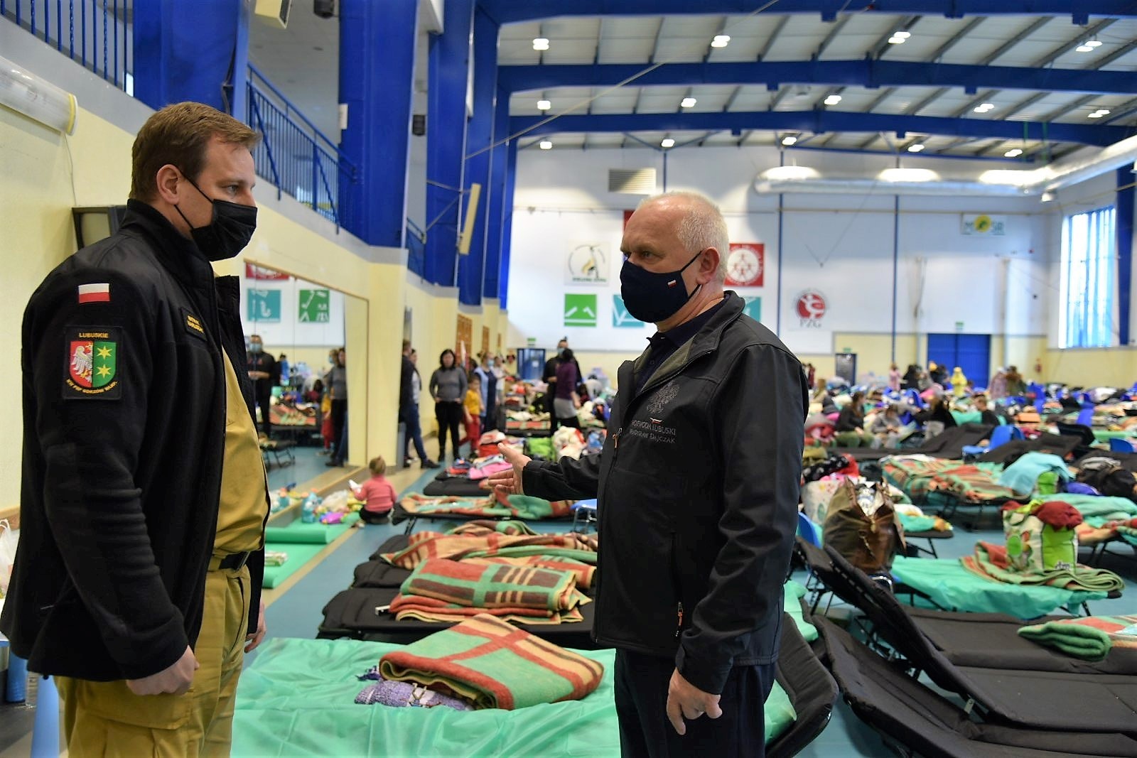 Lubuski komendant wojewódzki Państwowej Straży Pożarnej wizytował również punkt relokacyjny dla uchodźców zlokalizowany na hali akrobatycznej MOSiR w Zielonej Górze.