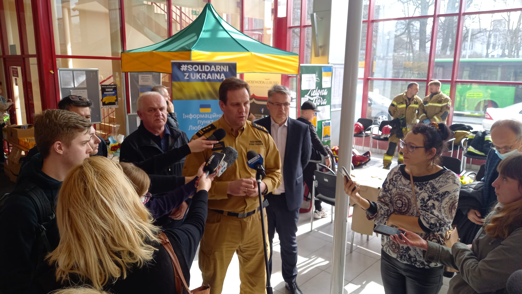 Na konferencji prasowej st. bryg. Patryk Maruszak podsumował bieżącą działalność oraz dotychczasowe zaangażowanie strażaków na dworcach kolejowych oraz w przygotowaniu punktów relokacyjnych. Bezpieczeństwo uchodźców, przygotowanie miesc czasowego pobytu i sprawna relokacja to priorytety strażaków.