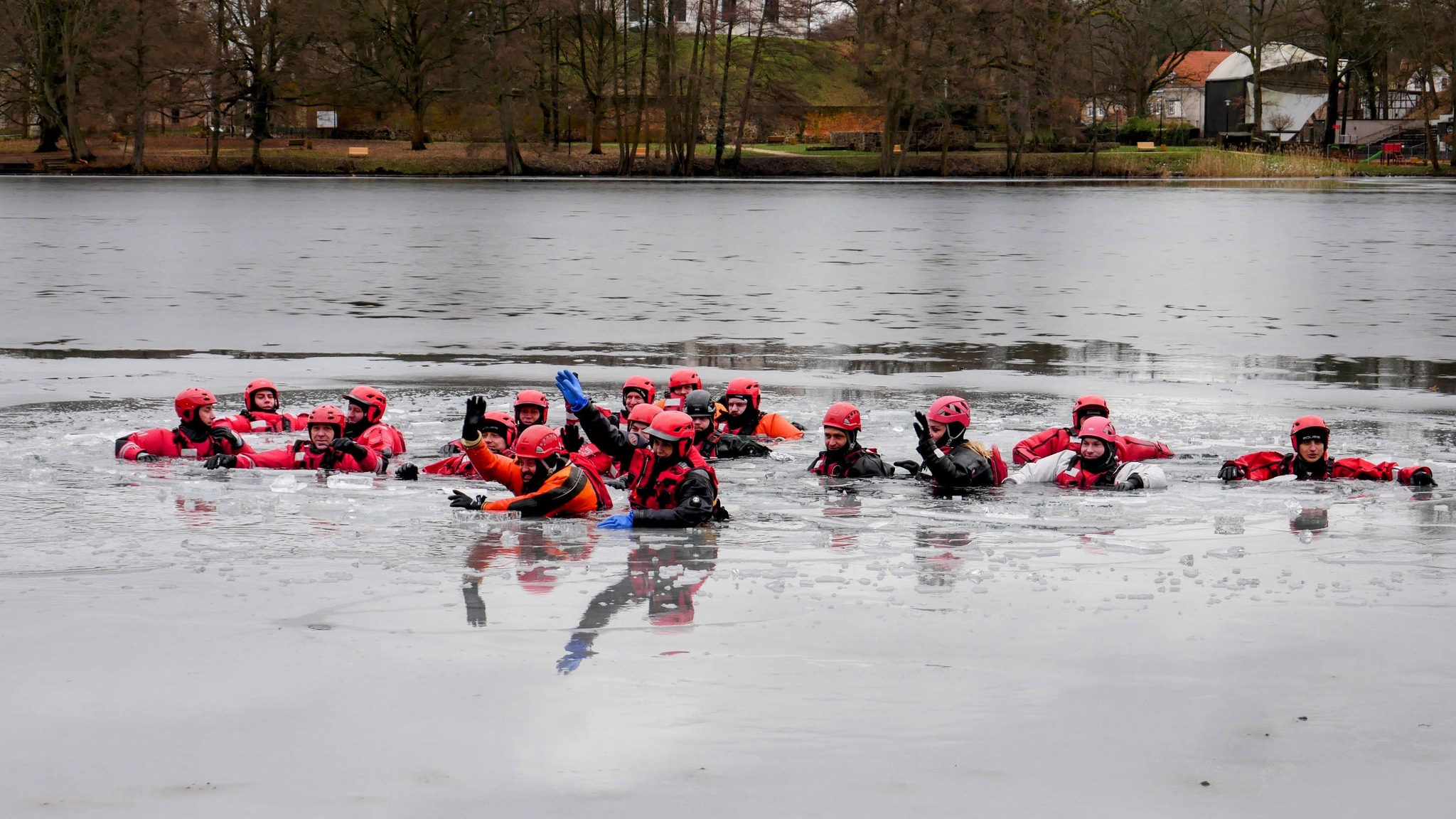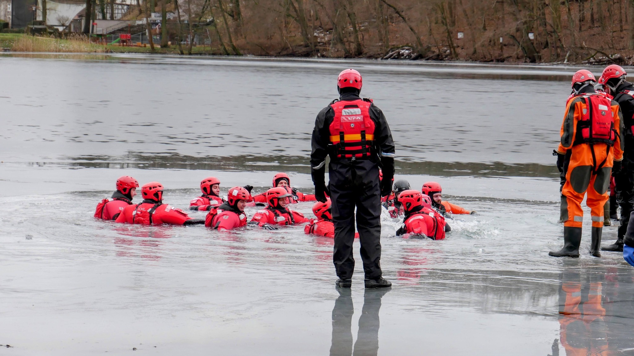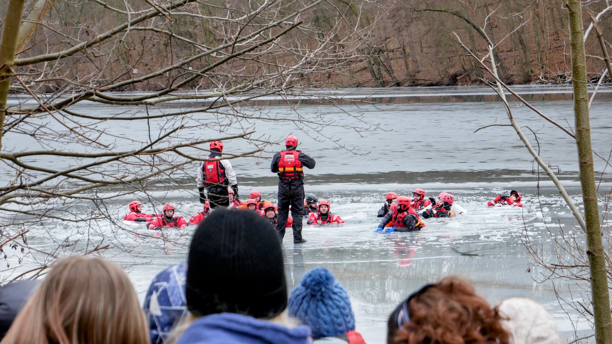 Prowadzący spotkanie bryg. Rafał Naks z Ośrodka Szkolenia Komendy Wojewódzkiej PSP w Gorzowie Wielkopolskim oraz kpt. Tomasz Teleśnicki z Komendy Powiatowej PSP w Międzyrzeczu mówili o czym należy pamiętać przed wejściem na lód, co zrobić w przypadku wpadnięcia do marznącej wody oraz jak pomóc osobie, pod którą zarwał się lód.