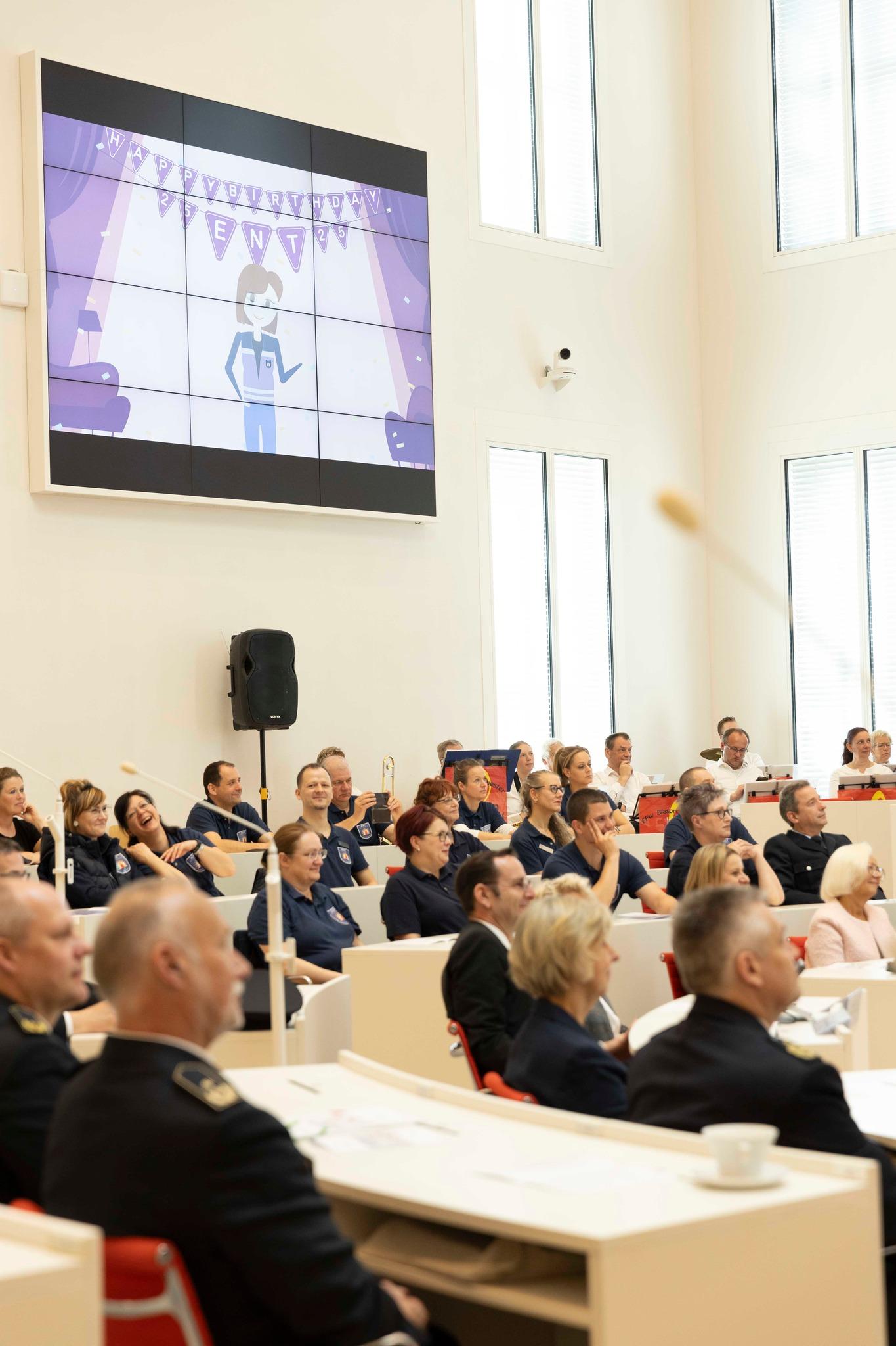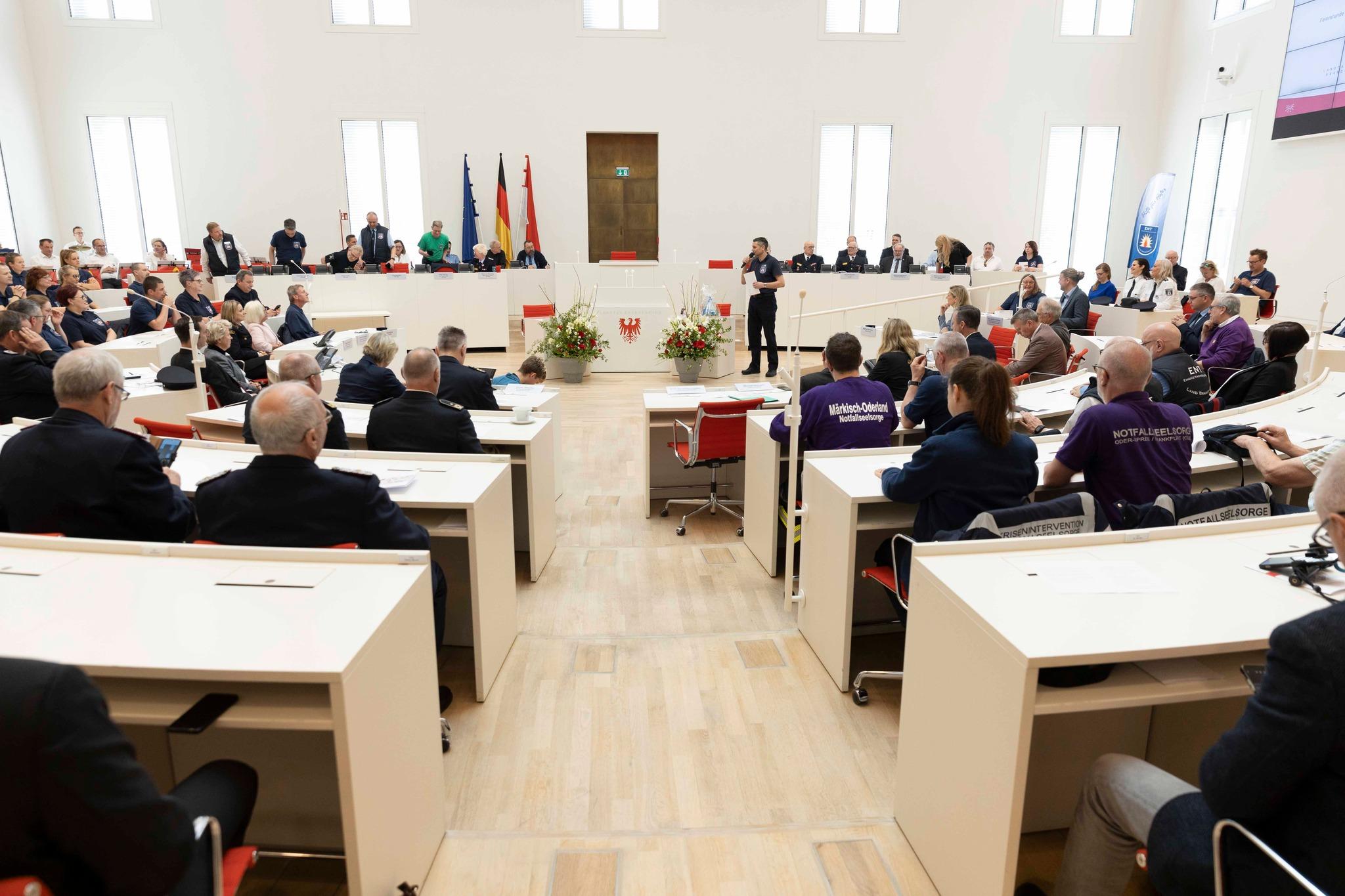 Na zaproszenie Przewodniczącej Parlamentu Krajowego pani prof. dr Ulrike Liedtke przybyło wielu gości i reprezentantów instytucji zaangażowanych w funkcjonowanie zespołu udzielającego wsparcia psychologicznego strażakom, policjantom, członkom różnych służb ratowniczych oraz ich rodzinom.