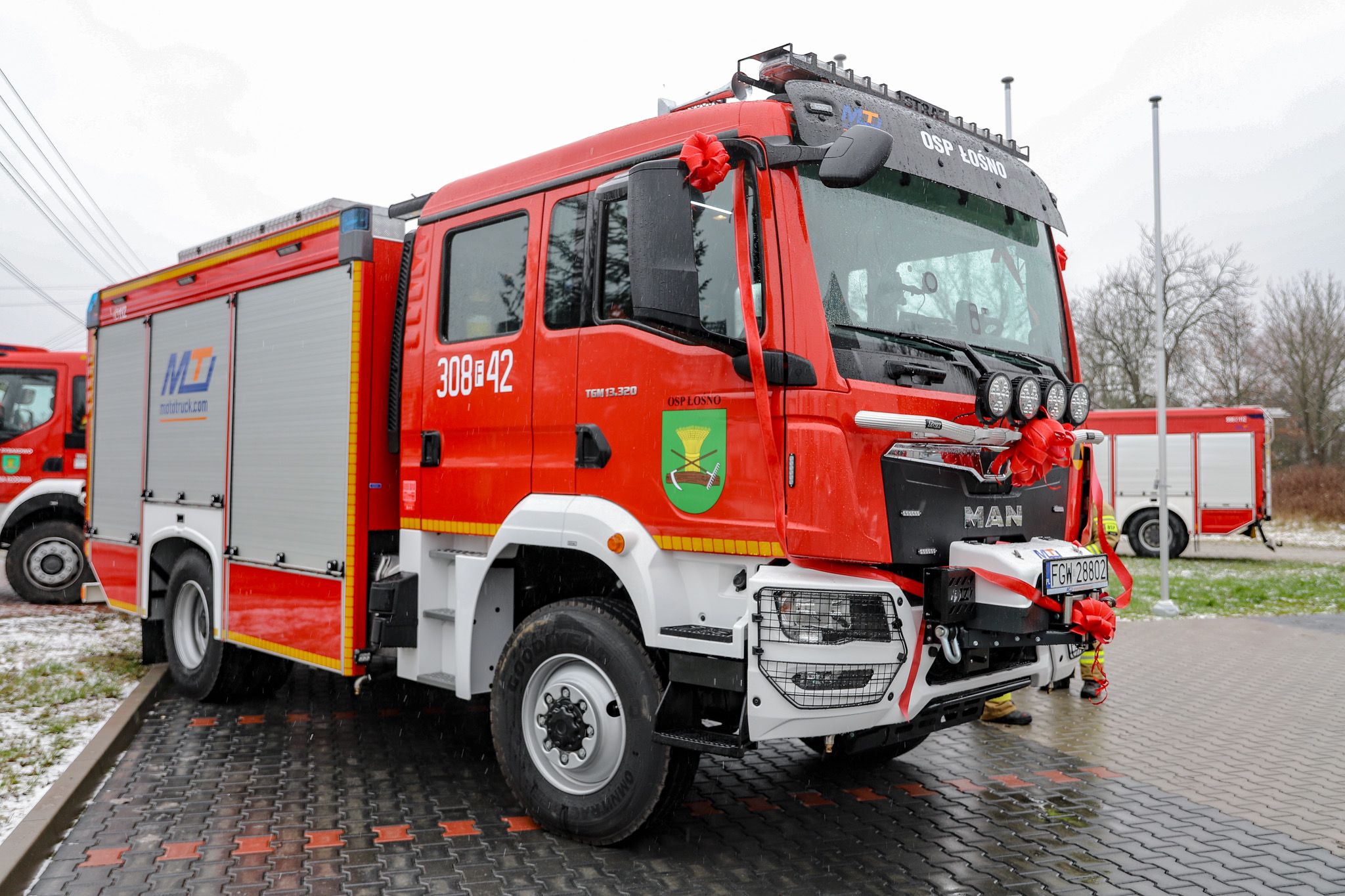 Świąteczny prezent to średni pojazd ratowniczo-gaśniczy MAN w zabudowie MotoTruck. Wyposażony został m.in. w zbiornik na wodę o pojemności 3500 litrów, gaśnicę do paneli fotowoltaicznych oraz wtyczkę awaryjną do zabezpieczania samochodów elektrycznych.