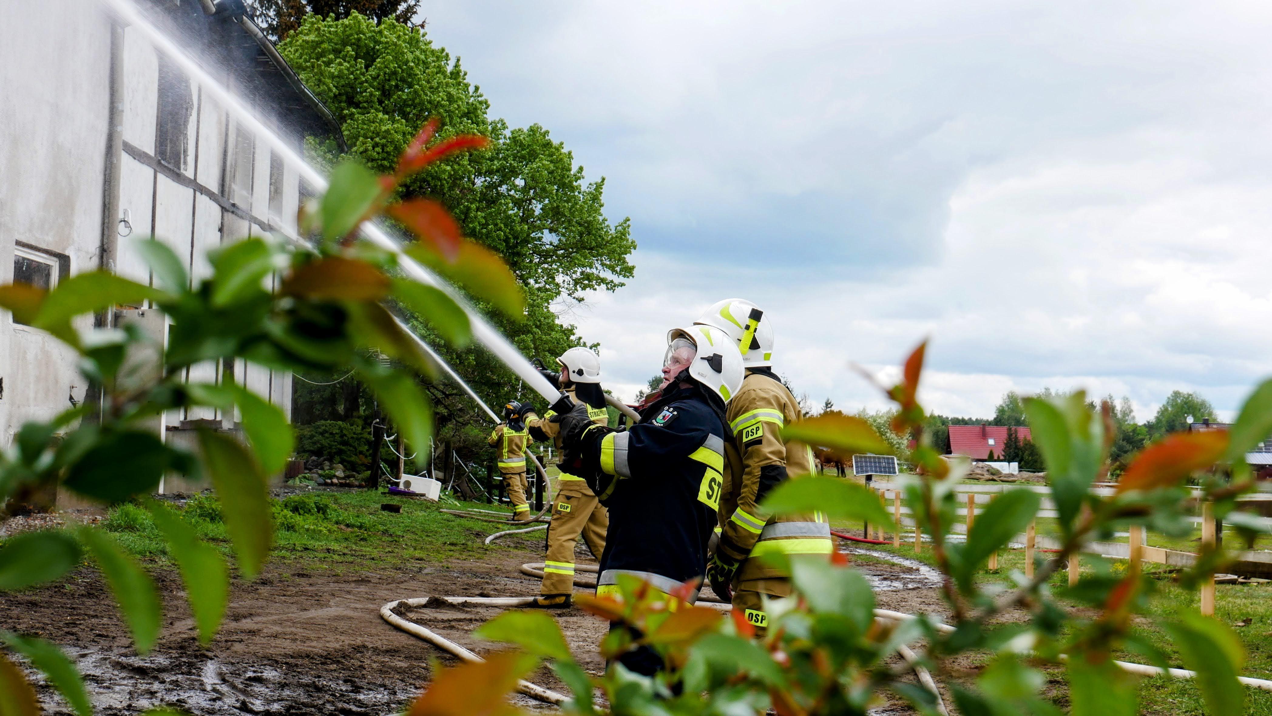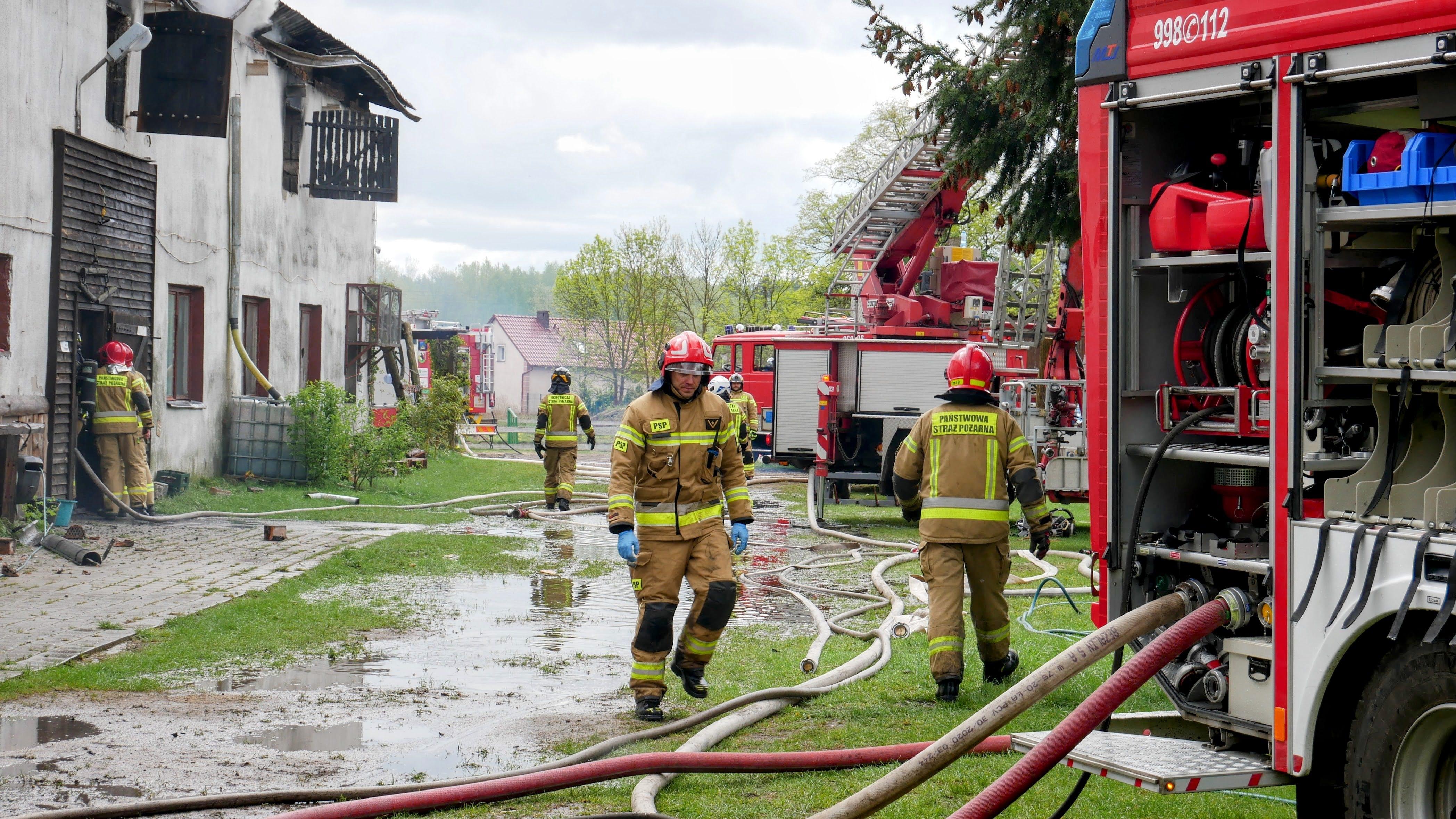 Sukcesywnie na miejsce działań przybywały kolejne samochody ratownicze straży pożarnej, które nie tylko walczyły z szalejącym w stajni ogniem, ale także broniły przed pożarem sąsiadujące budynki. Duże ułatwienie w działaniach ratowniczych stanowiły zlokalizowane kilkadziesiąt metrów od miejsca zdarzenia, sztuczne zbiorniki z wodą.