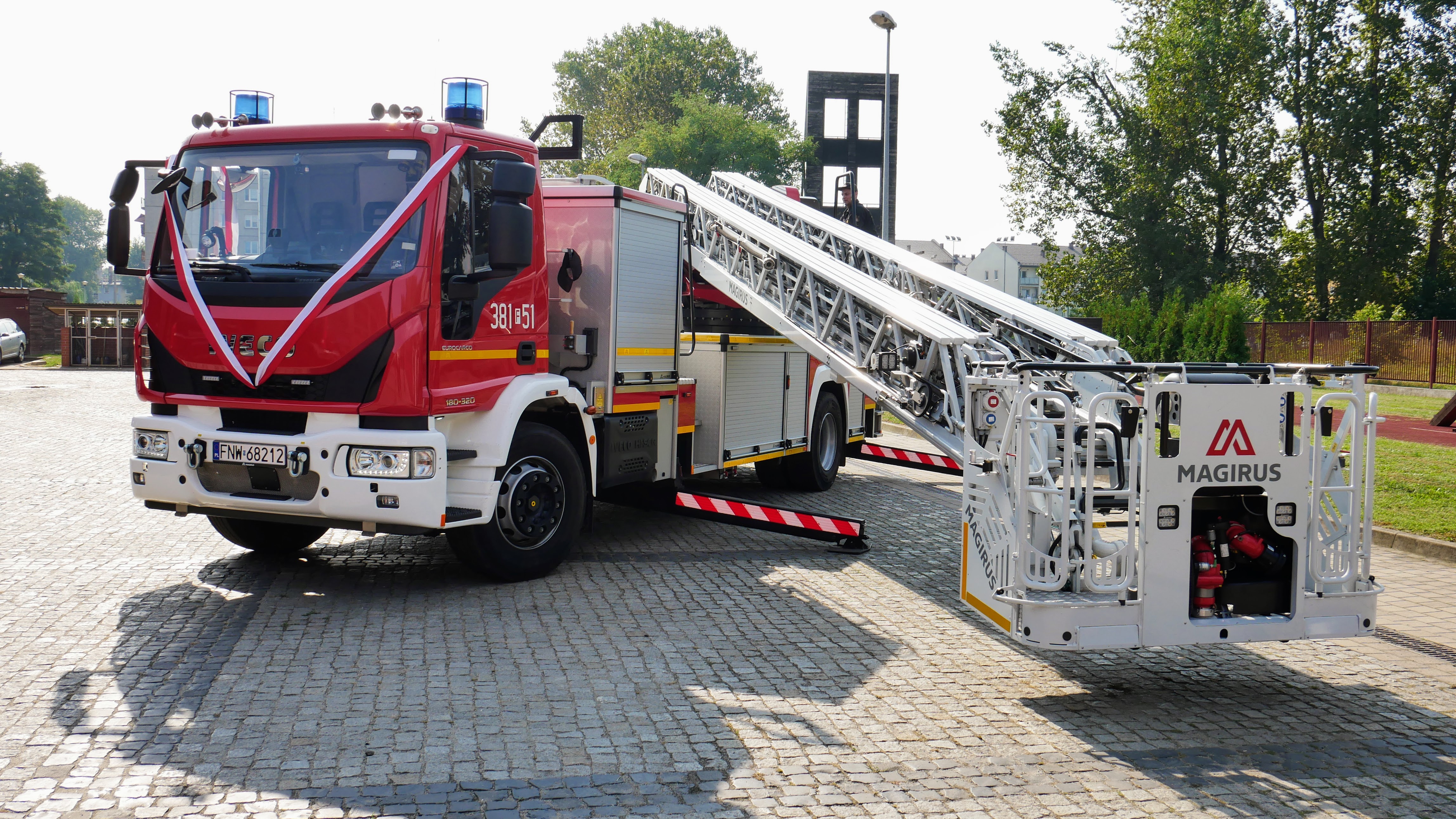 ‘Ciężki samochód specjalny z drabiną mechaniczną o wysokości 41 metrów z koszem ratowniczym dla 5 osób, przystawką do mocowania noszy ratowniczych, działkiem wodno-pianowy o wydajności 1 600 l/min oraz funkcją udźwigu 4000 kg’.