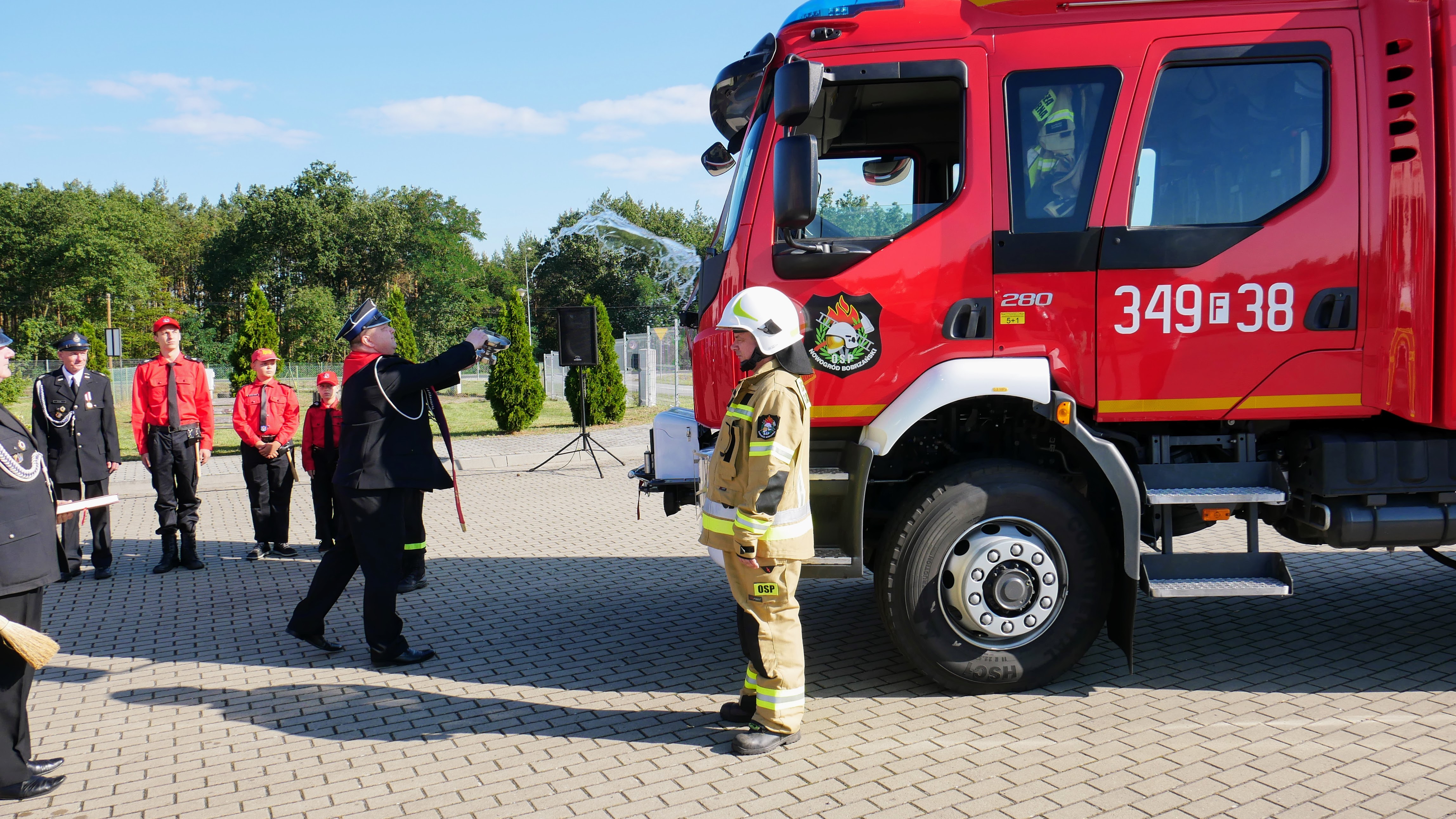 Na placu przed remizą OSP Nowogród Bobrzański, Lubuski Komendant Wojewódzki PSP nadbryg. Patryk Maruszak wraz z Doradcą Wojewody Lubuskiego ds. Współpracy z Jednostkami Samorządu Terytorialnego Województwa Lubuskiego Grzegorzem Maćkowiakiem oraz Burmistrzem Nowogrodu Bobrzańskiego Pawłem Mierzwiakiem, wręczył akt przekazania pojazdu Naczelnikowi OSP Nowogród Bobrzański dh Arturowi Fabisiakowi.